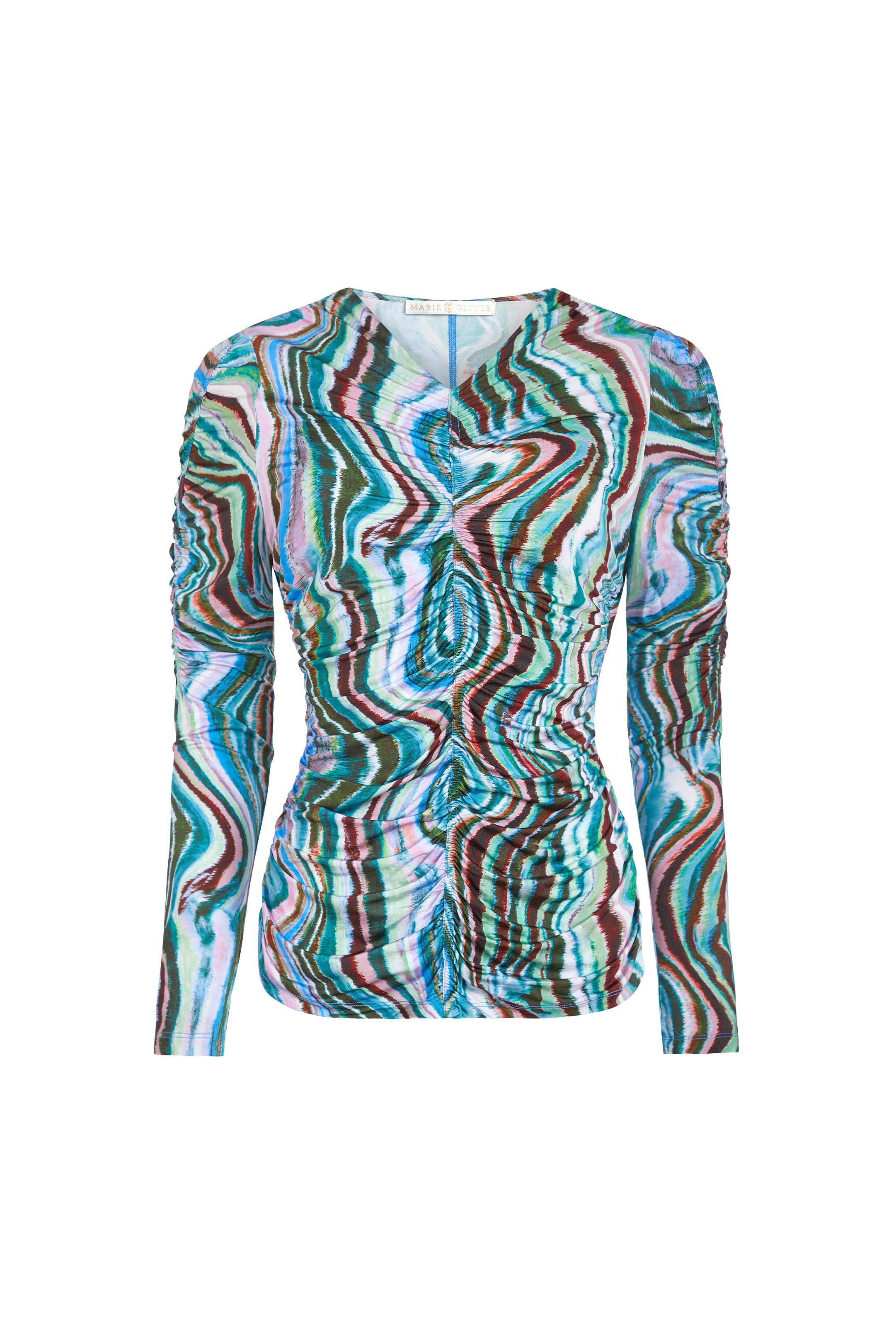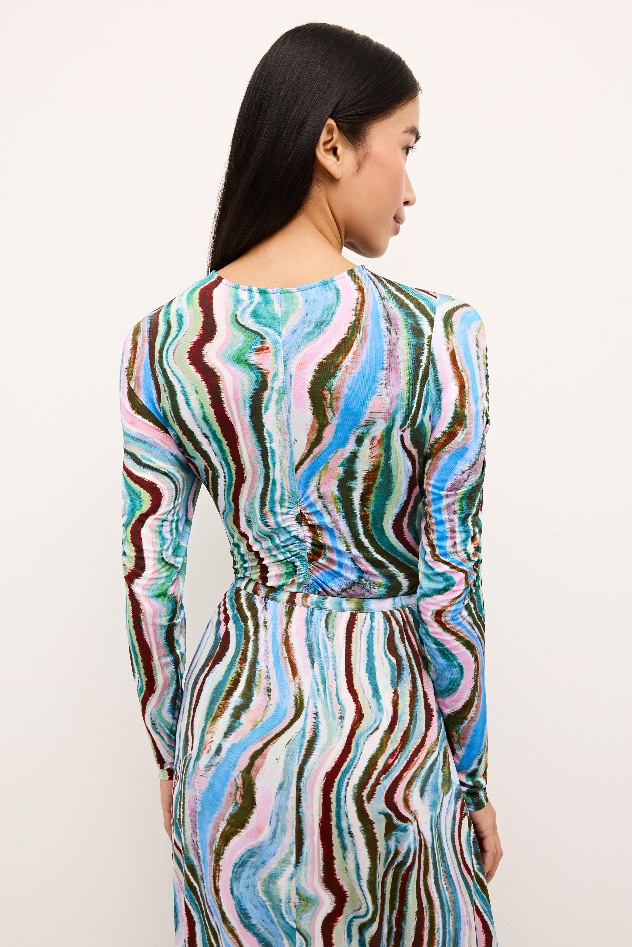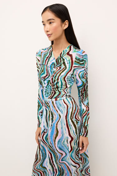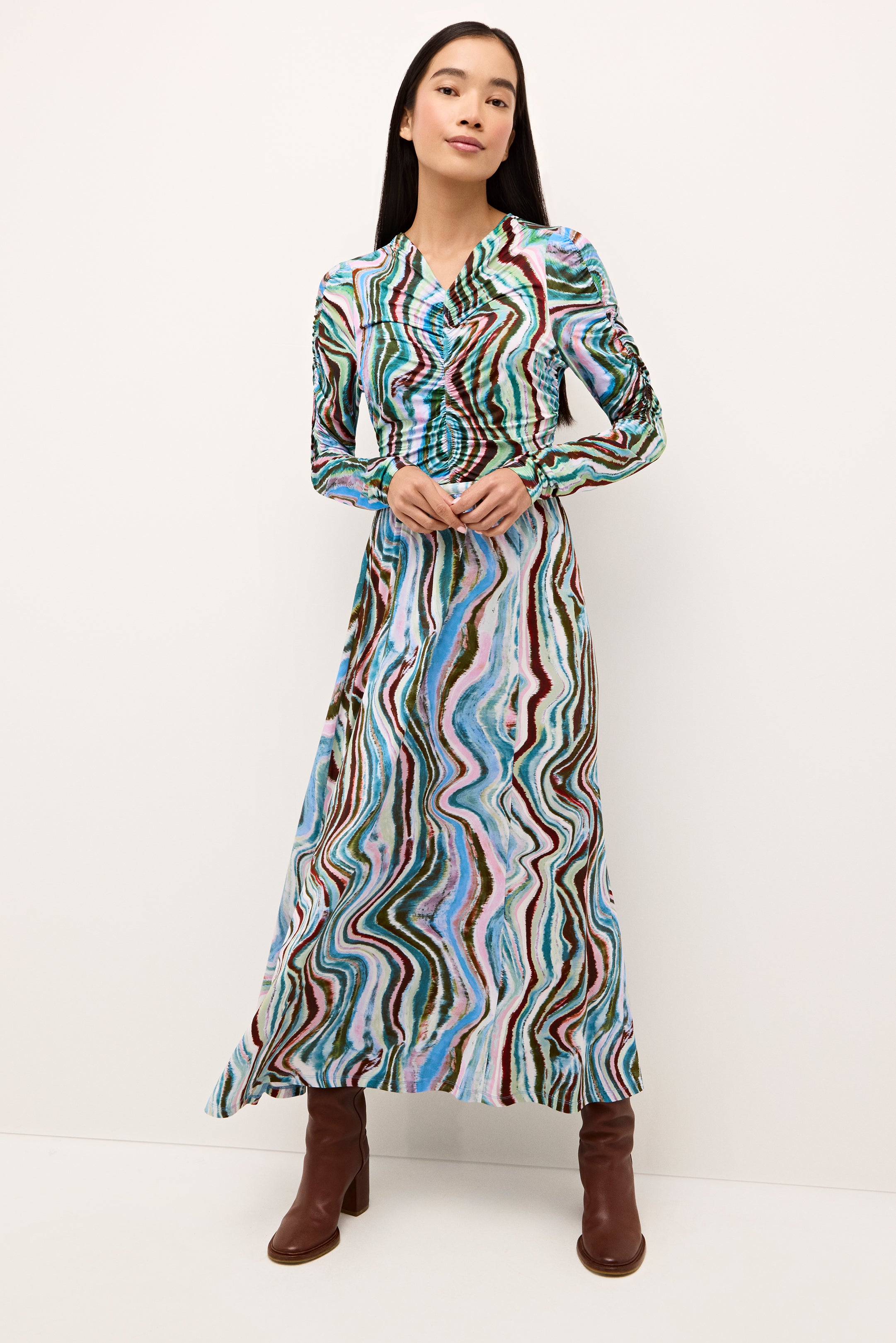 Ruching down the center of this fitted top makes for an especially flattering look. Style the v-neck slip-on silhouette—pictured here in Agate, a striated geological stripe in wintry earth tones—as a set and pair it with our matching Kaia skirt. Cut from the same soft, stretchy fabric, the separates feel as good as they look.
