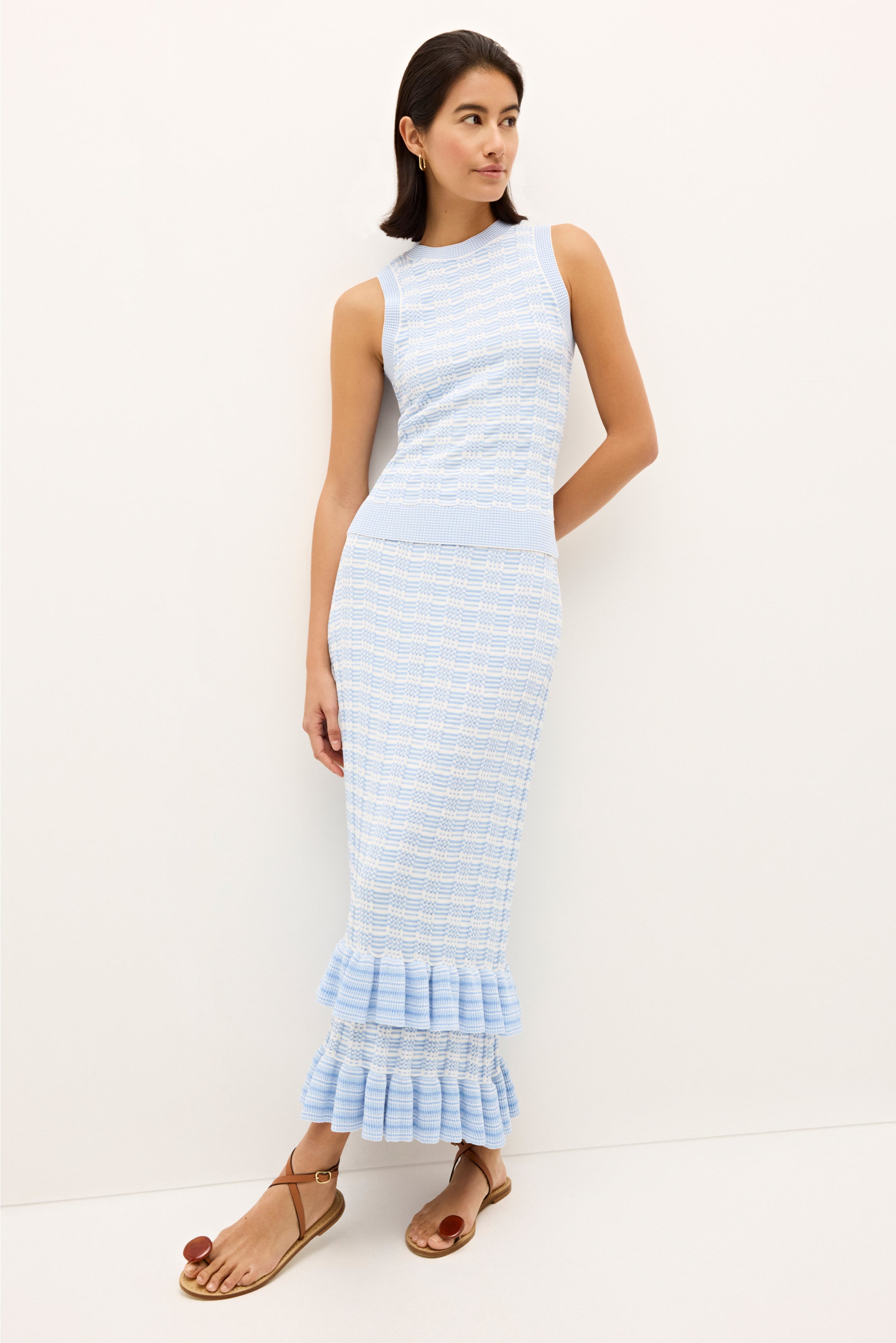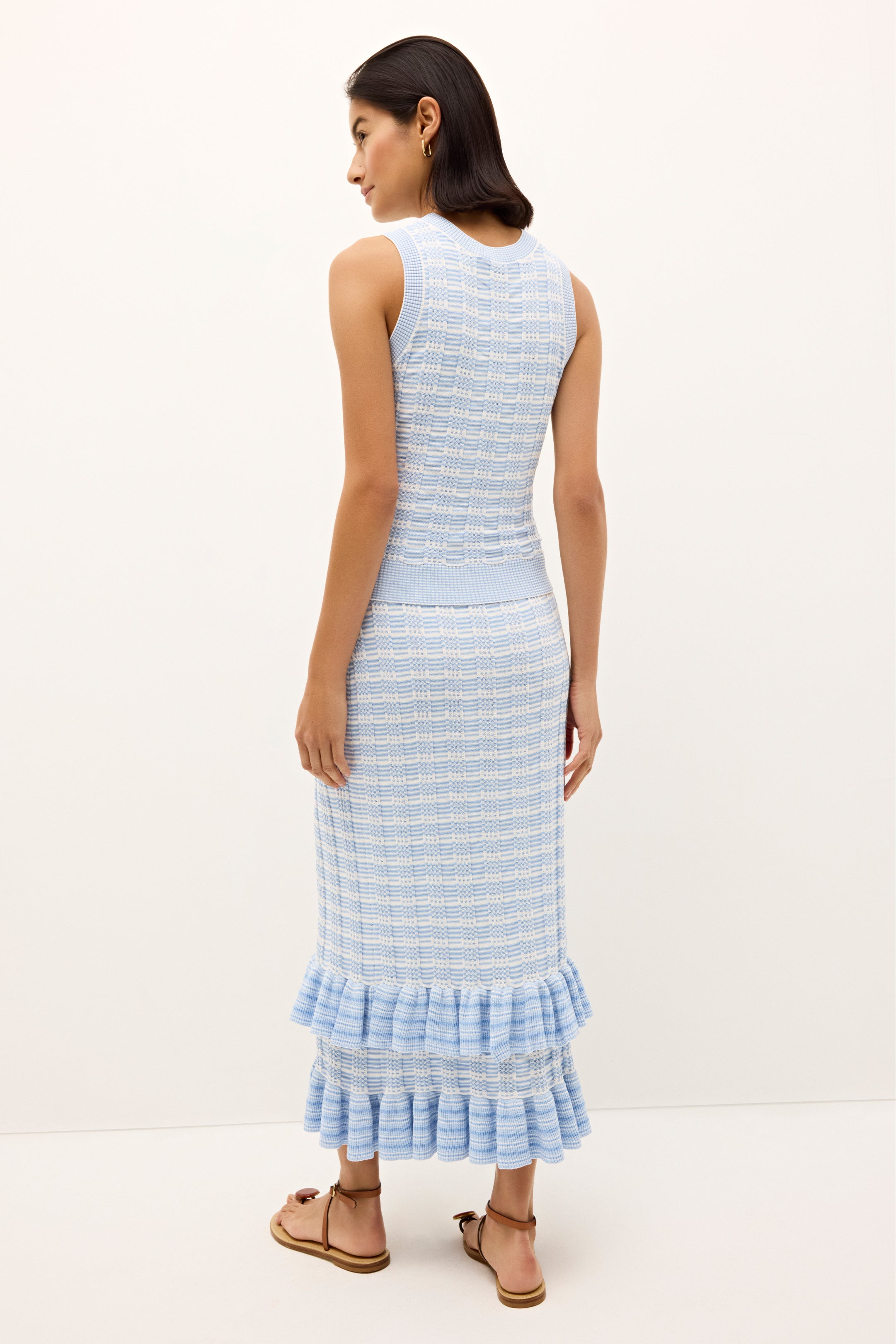 This sleek crew-neck silhouette is cut from a soft, blue-and-white-striped knit. It pairs back to our matching Sawyer skirt for a chic luncheon look, and separates like our A-line Miles short.