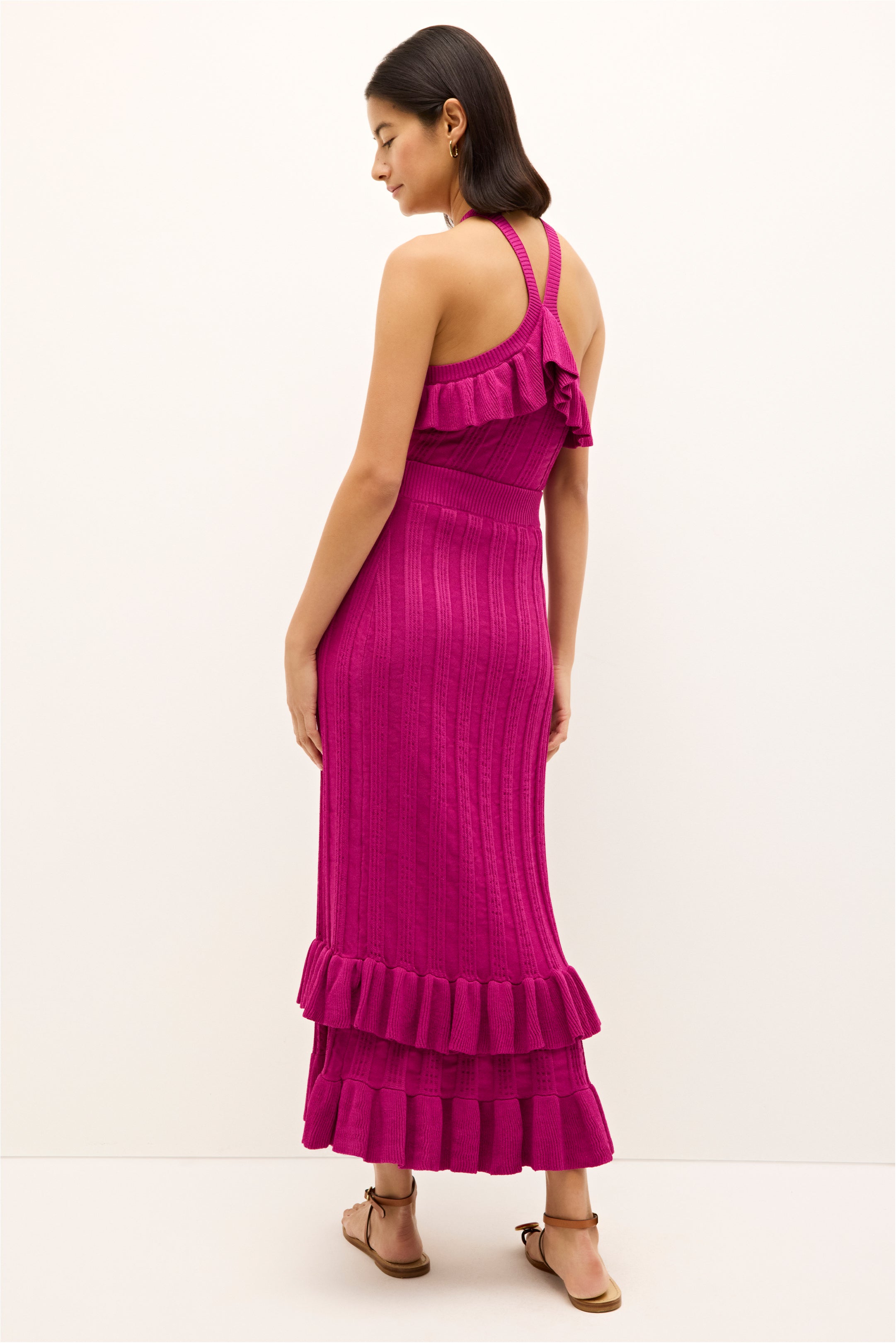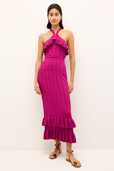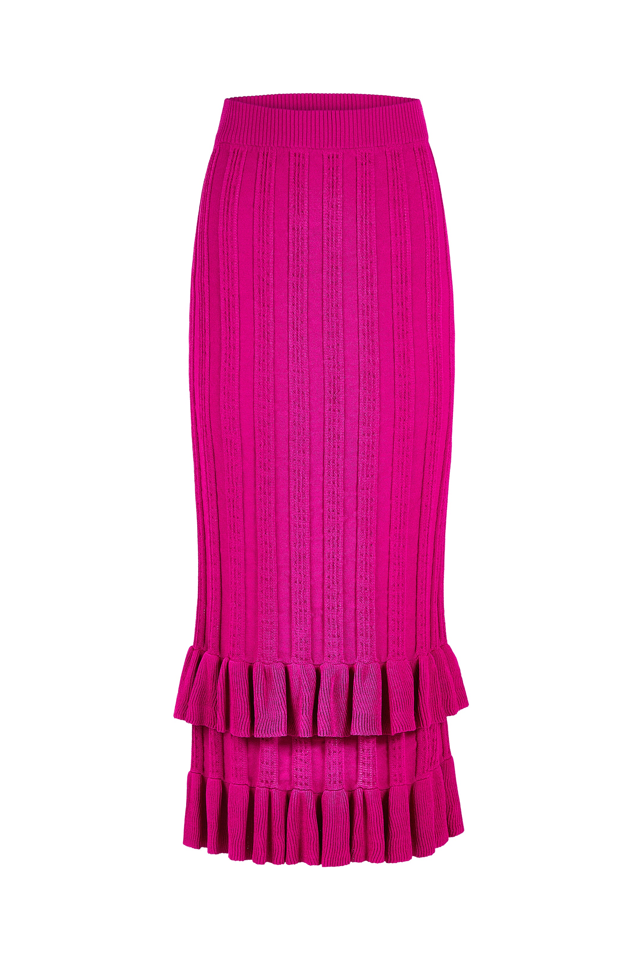 Designed to flatter your figure, this body-skimming silhouette with an elastic waistband and ruffle details is cut from a soft, ribbed knit, which comes in an electric pink solid, reminiscent of the Mediterranean’s bright bougainvillea blooms. To play up the skirt’s bold femininity, pair it with our matching halter-style Tricia top.
