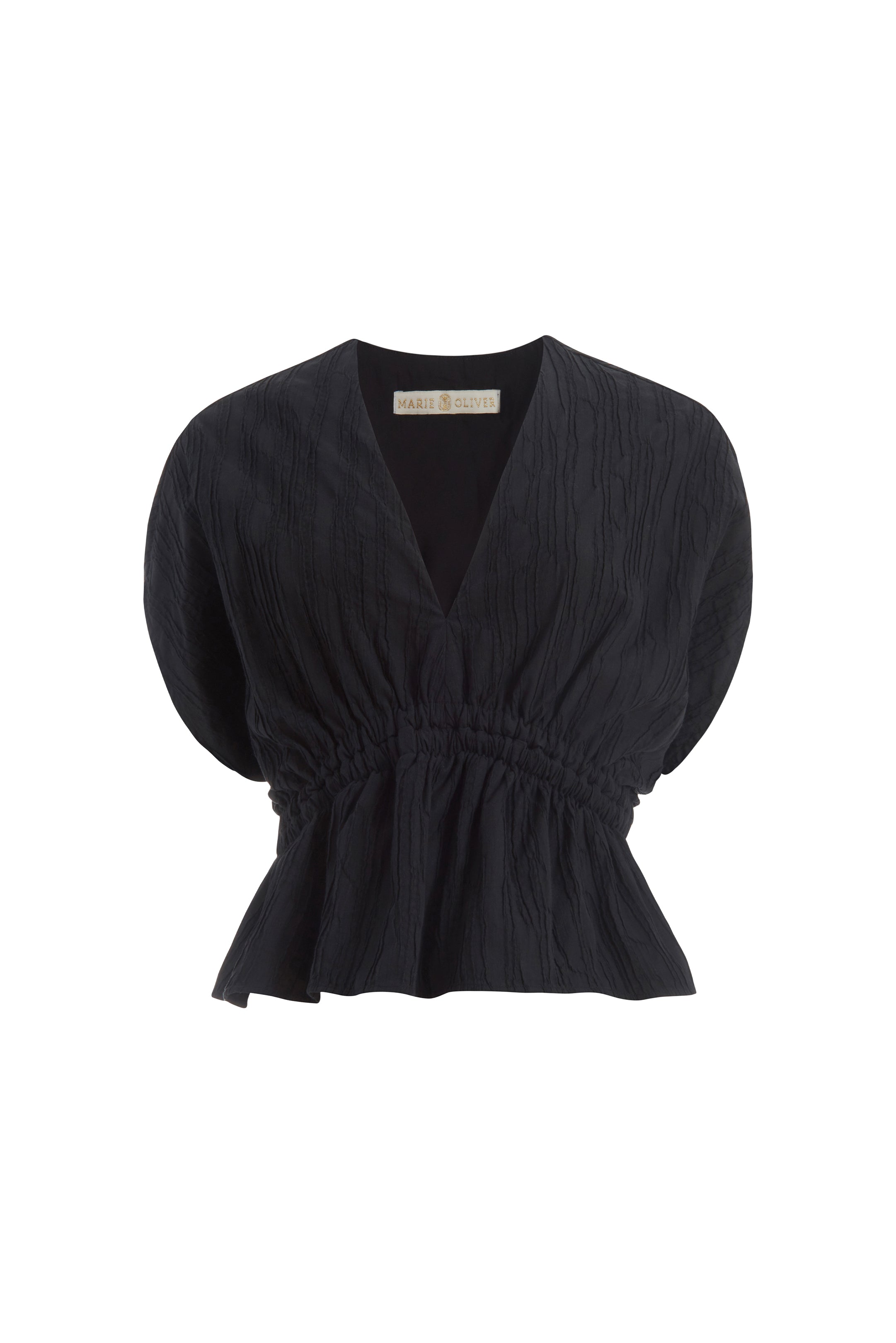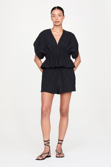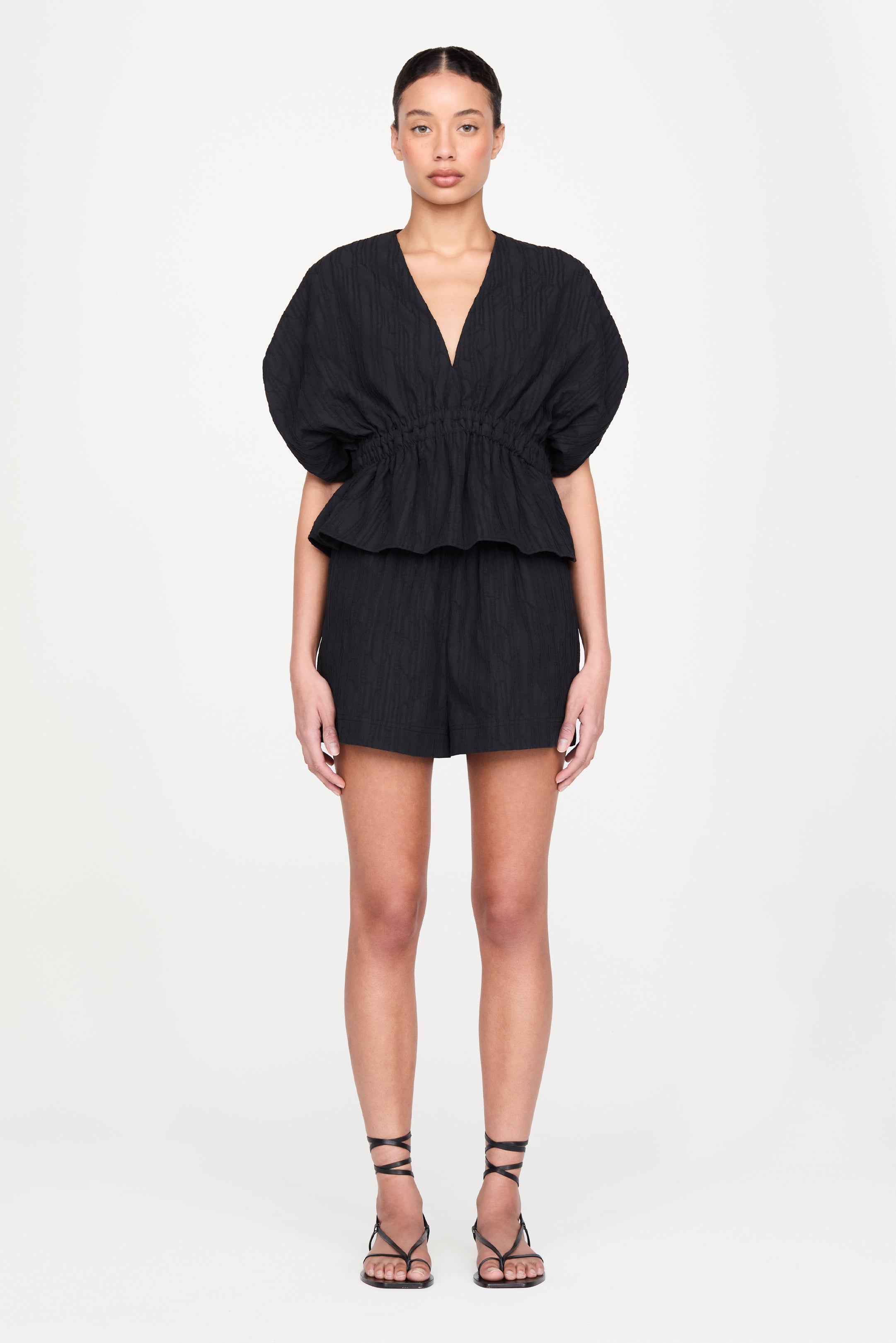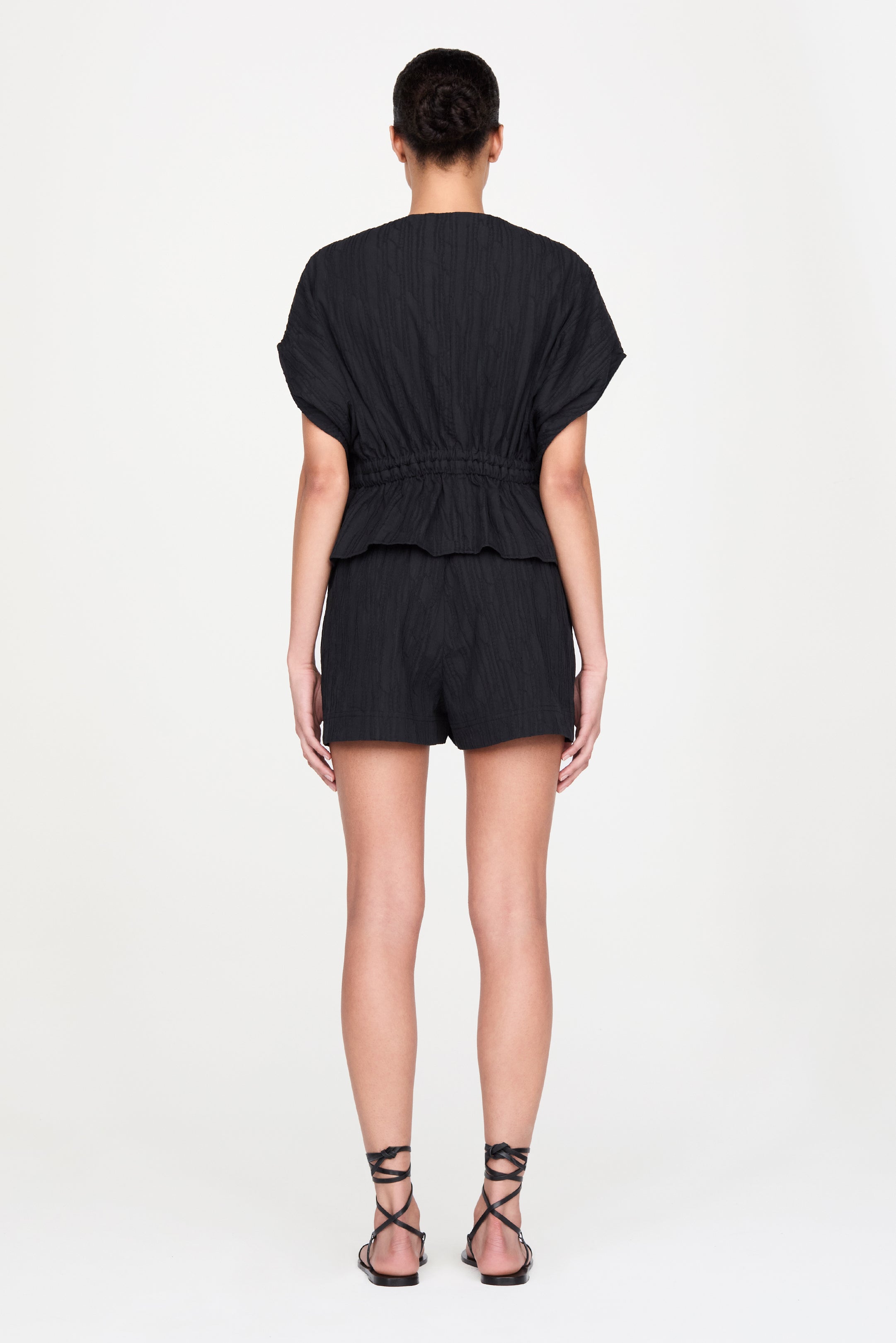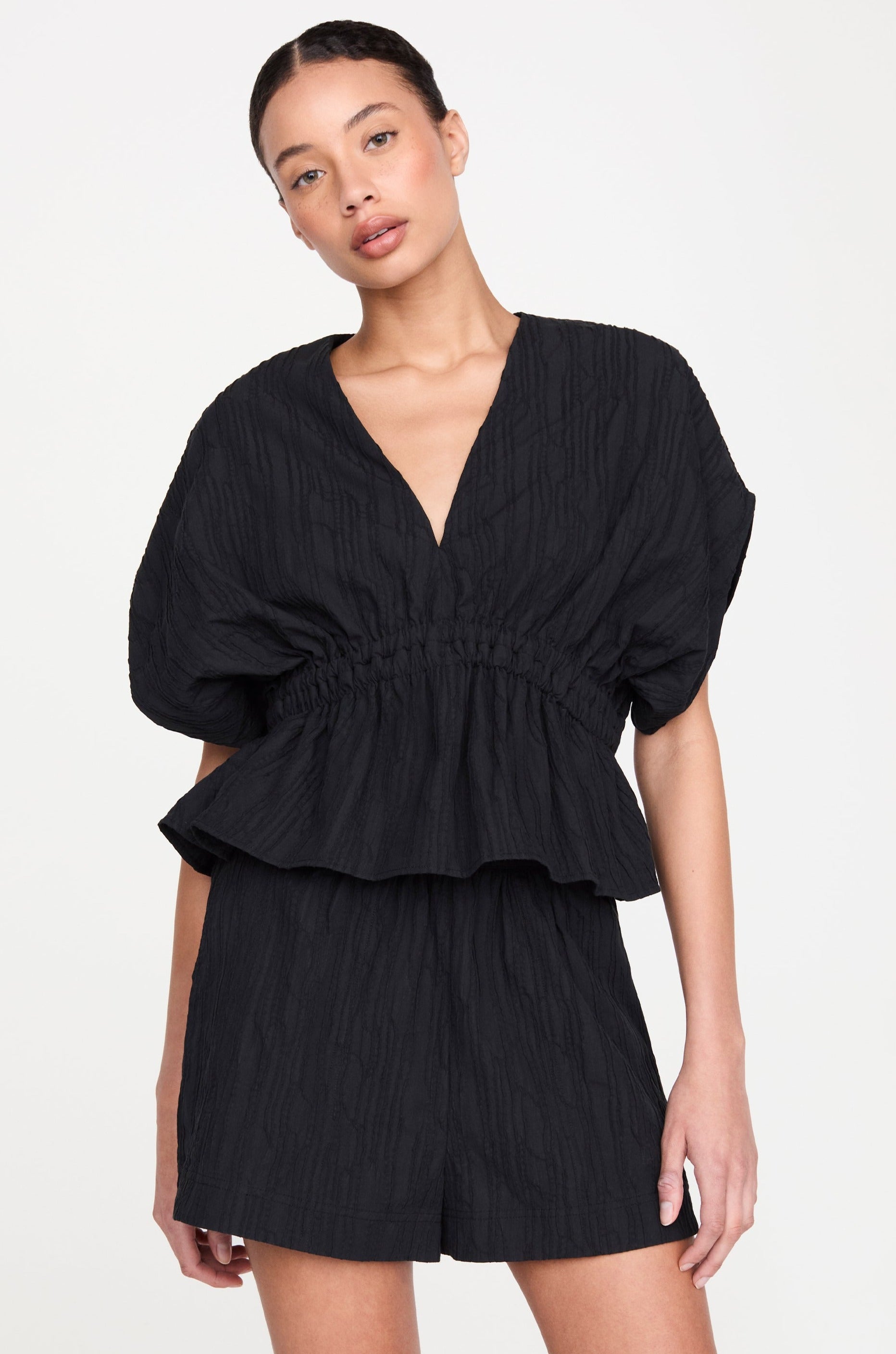 Vesta’s full sleeves, deep v-neck, and layered elastic waist that gives way to a gentle peplum flounce lend the slip-on silhouette style to spare. Made from a lightweight crinkle cotton for summer, Vesta pairs well with our Cori short.
