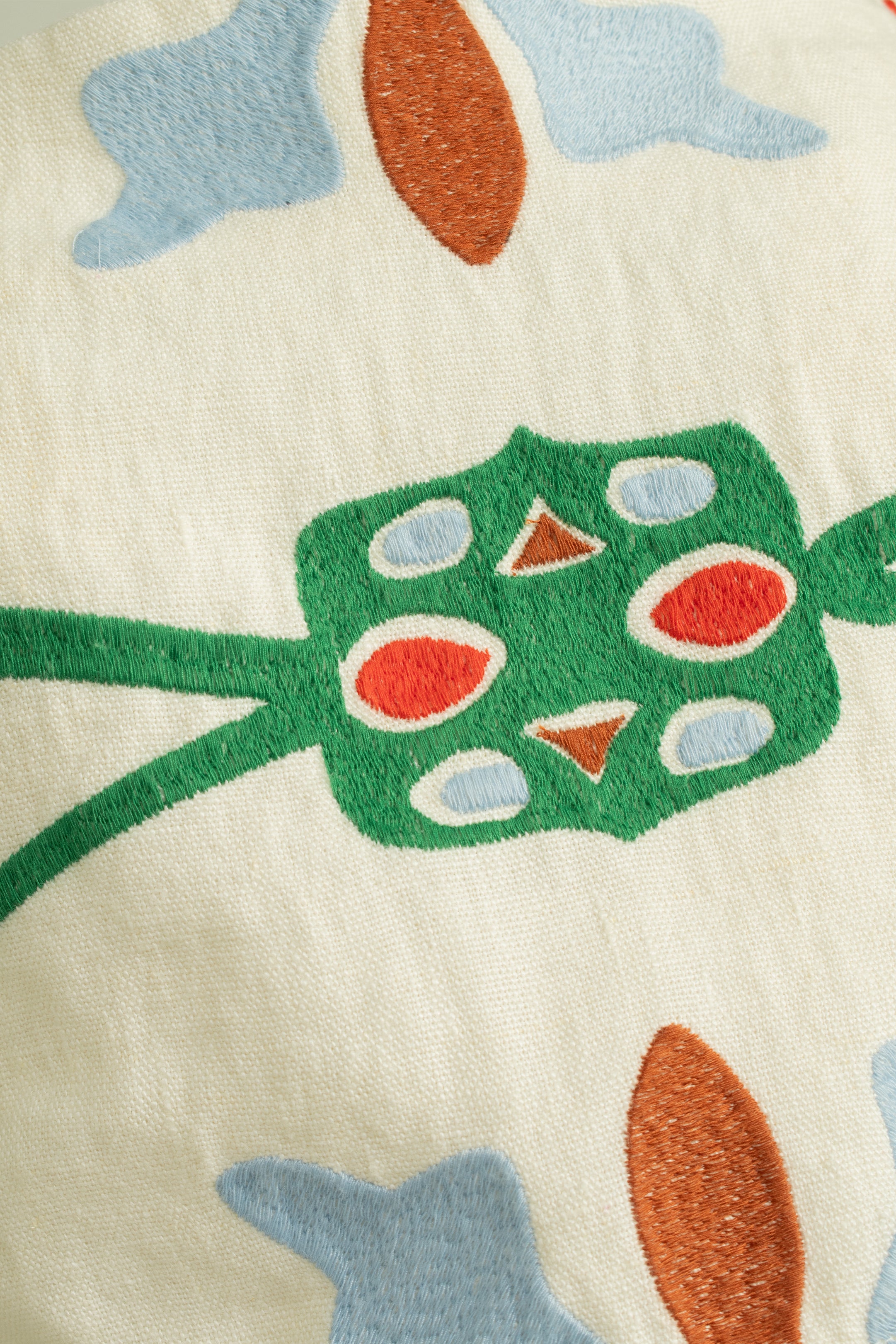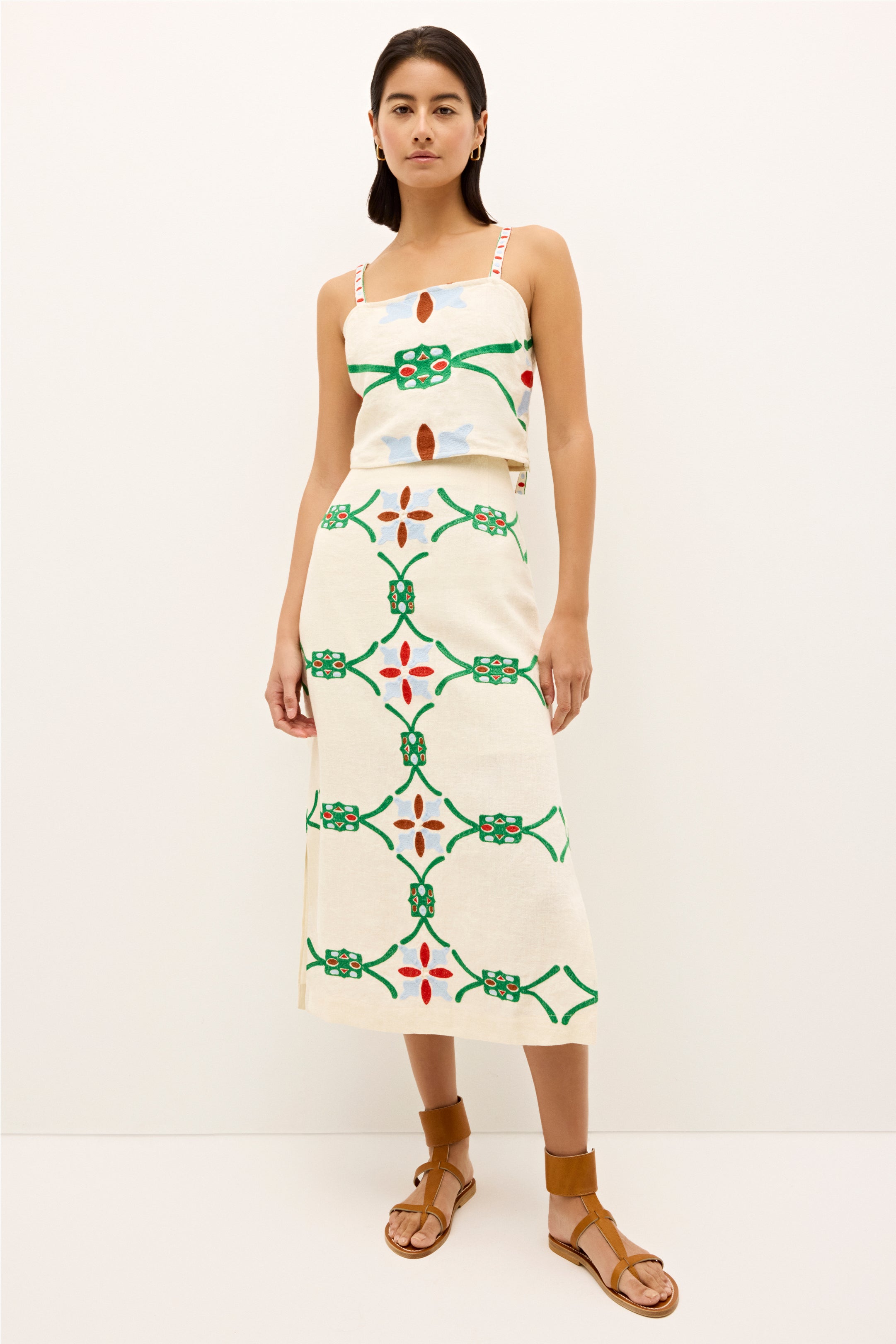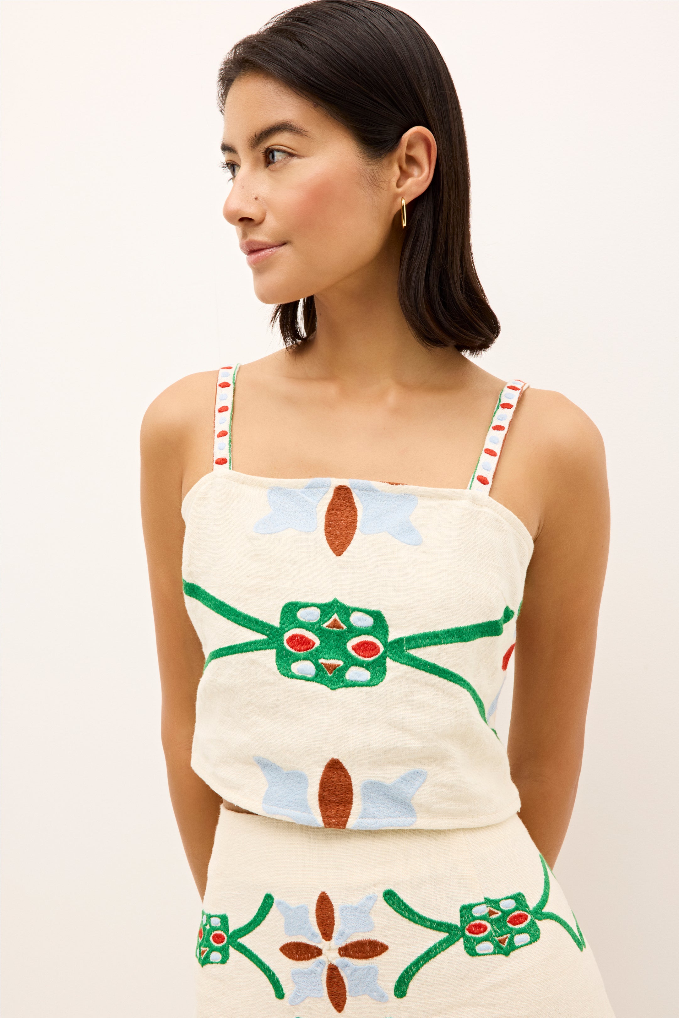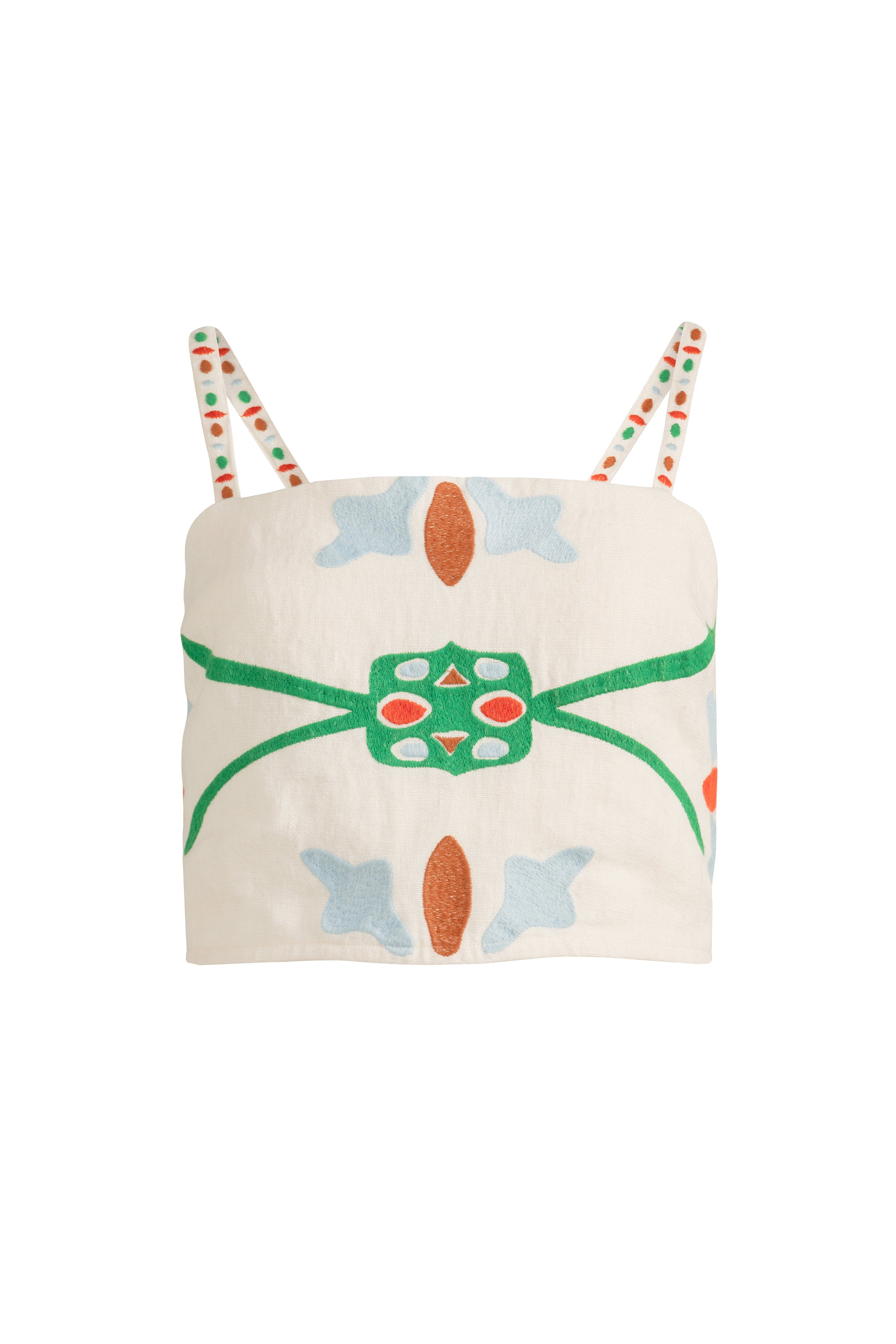 Geometric embroidery in paprika, emerald, and sky blue bring vibrant dimension to this patterned crop top. With a smocked back and adjustable embroidered straps, the flirty yet refined silhouette pairs perfectly with the matching Chandler skirt for a coordinated summer set.