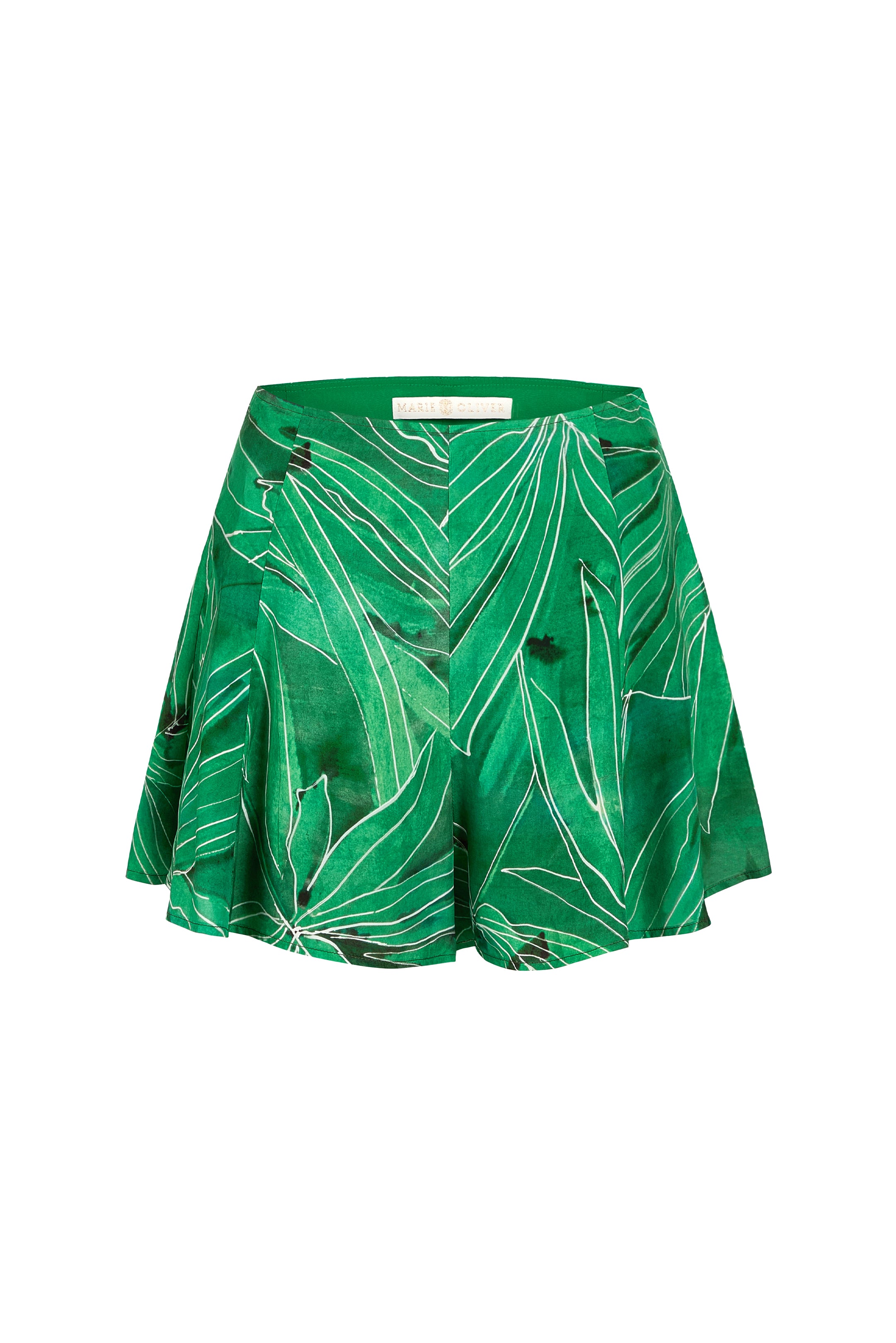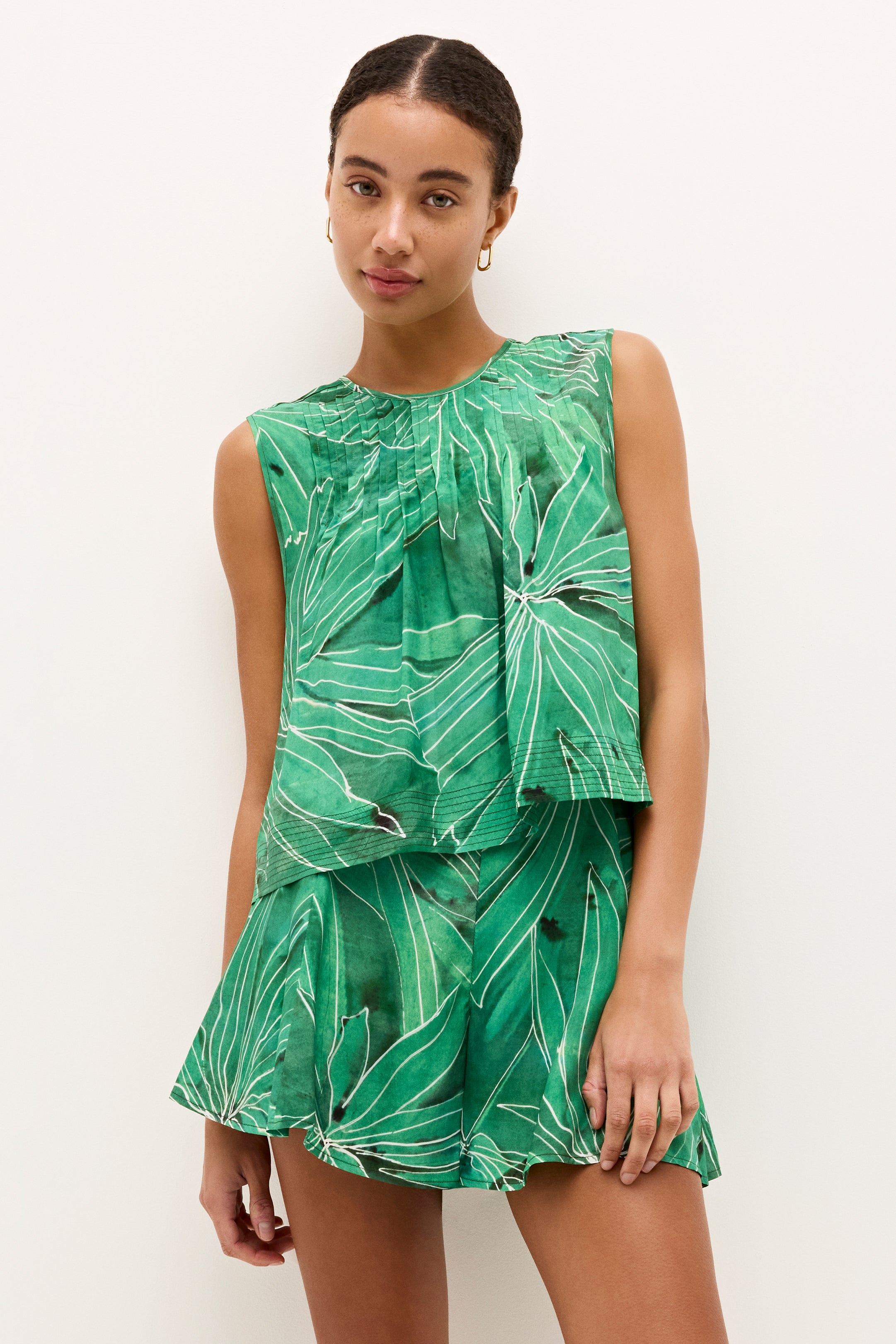 The newest addition to our collection of statement shorts, Miles is cut from a silky viscose for a breezy elevated take on the summer style. Miles is designed to sit at your natural waist, and features wide legs that create a flattering A-line shape. Pictured here in Amazon, a saturated botanical in deep emerald green, Miles pairs back to our matching Letta top or Miranda tank in white.