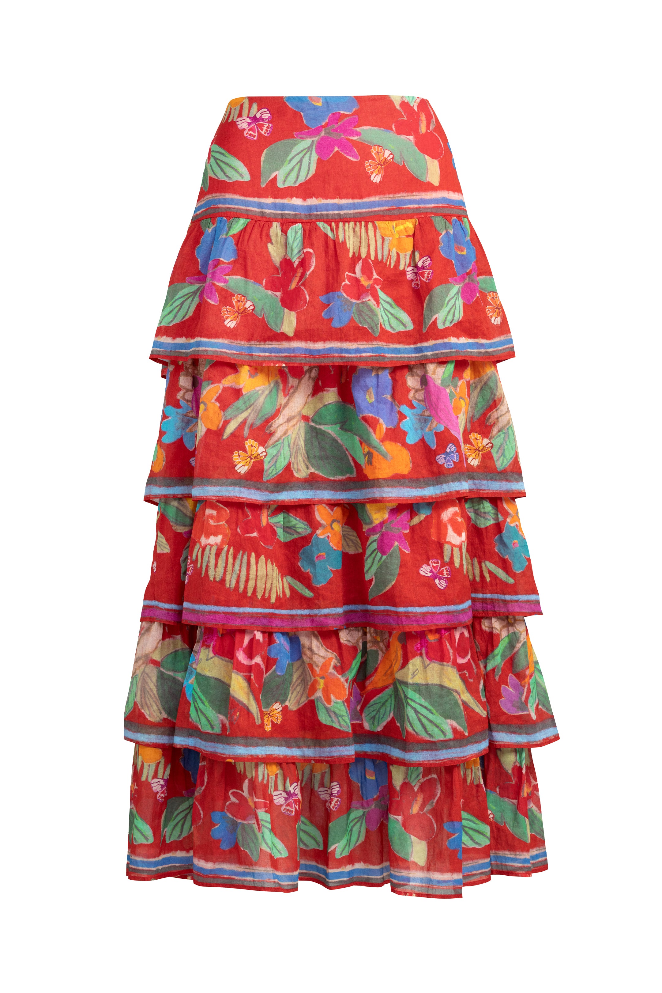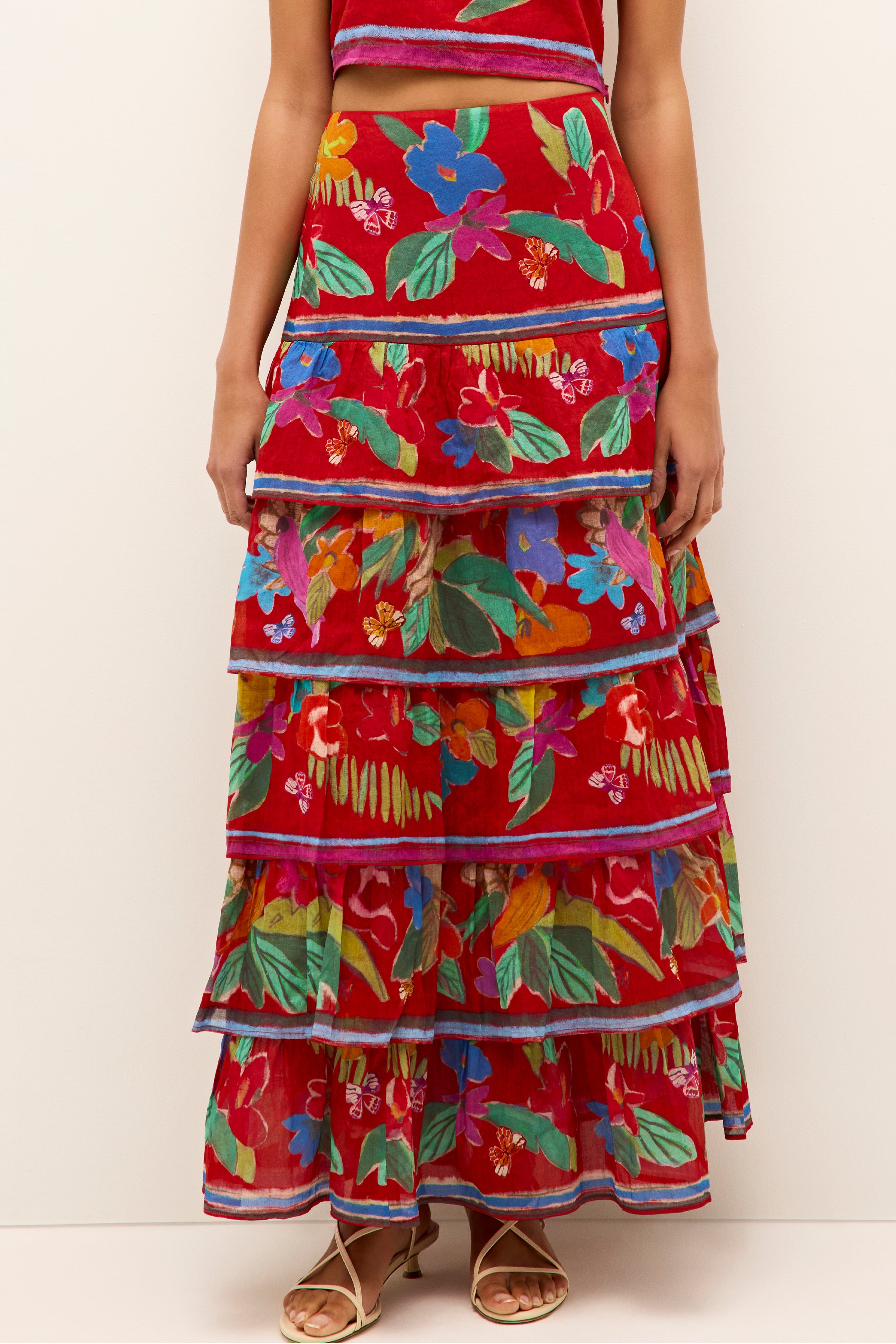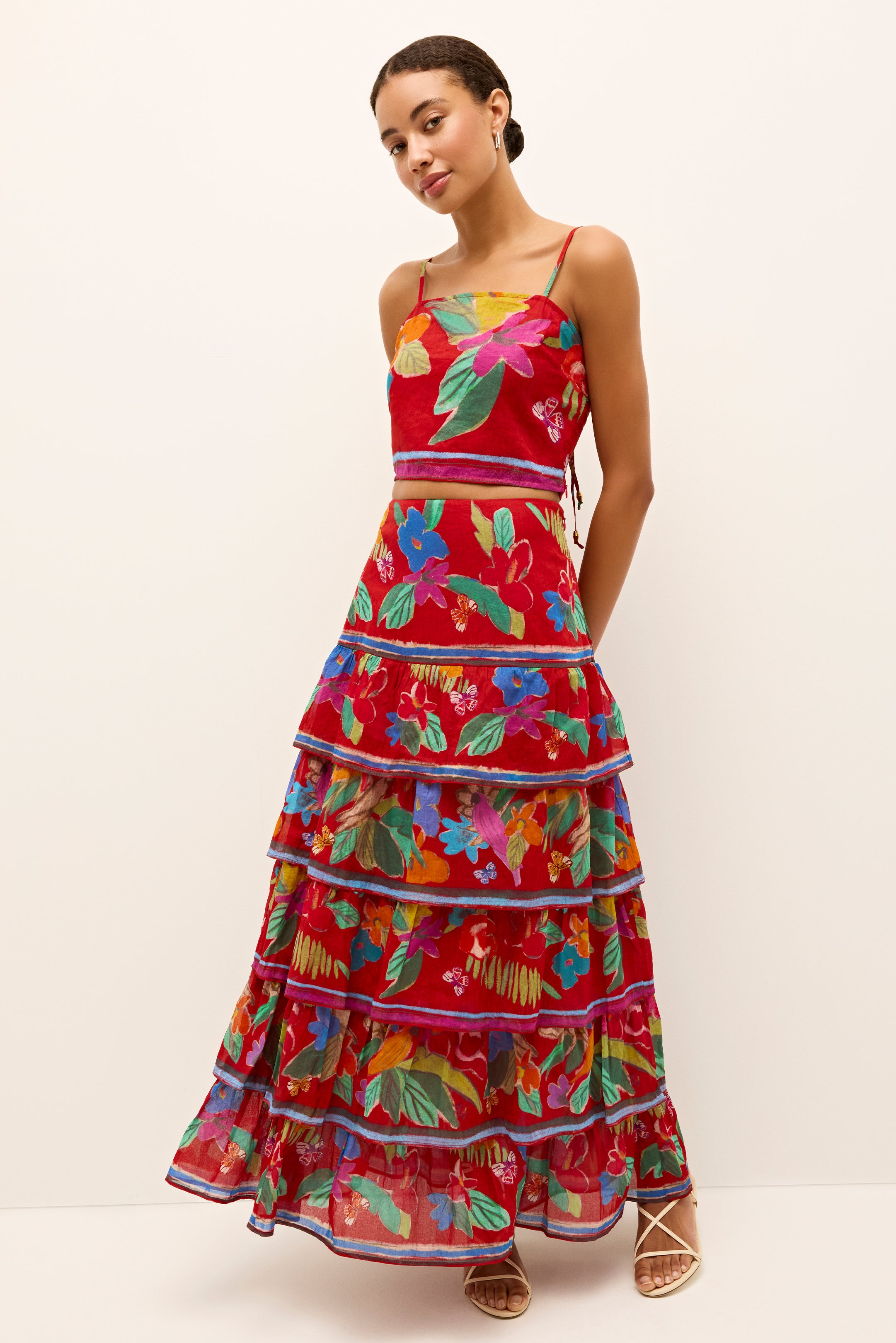 Fitted through the waist and hips, our Christie skirt skims the floor with a cascade of colorful tiers. The statement-making skirt is pictured here in Macaw, a bright avian-inspired jungle print with a bold red ground and a sun-aged finish. Pair Christie with our matching Wyatt top for an exuberant party set.
