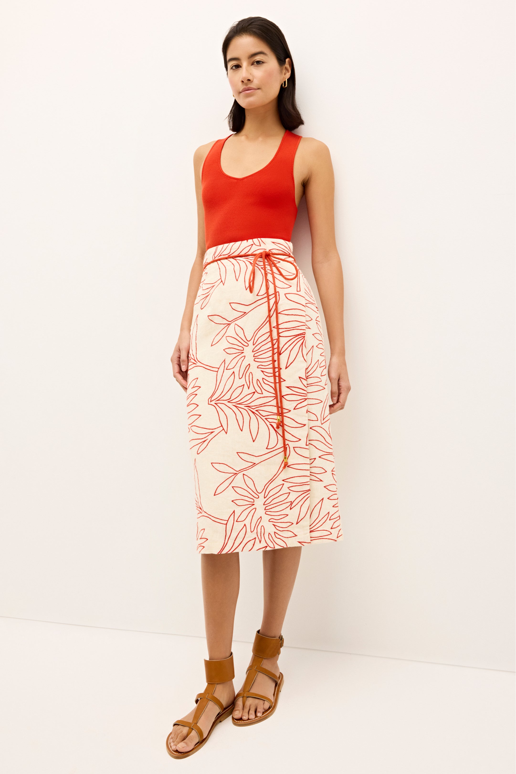 We’ve never met a wrap skirt we didn’t love, but this one stands out with its streamlined silhouette and bold allover floral embroidery in a vibrant red-and-white palette. Pair it with the Miranda tank in Canyon Red for a full dose of feel-good energy.