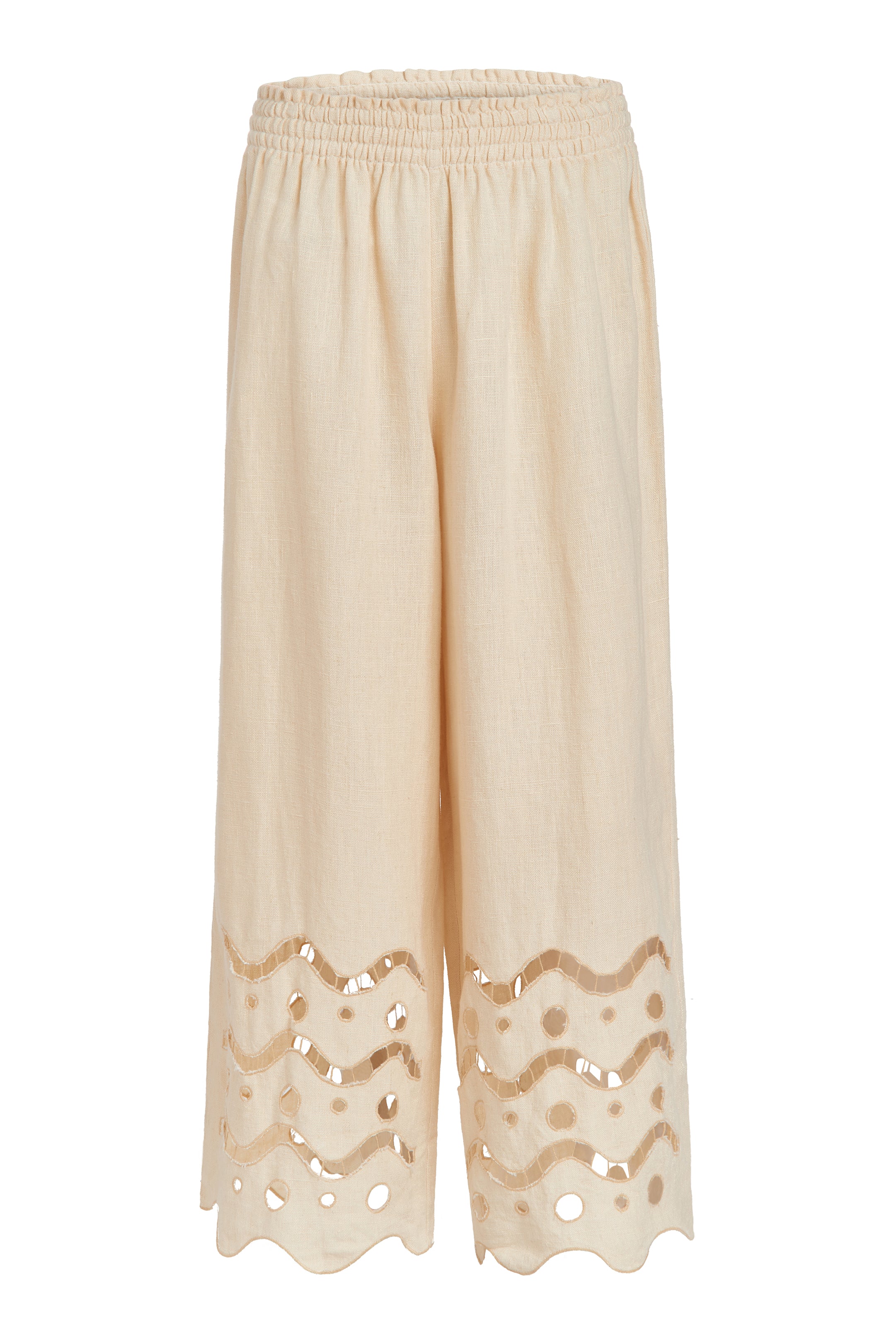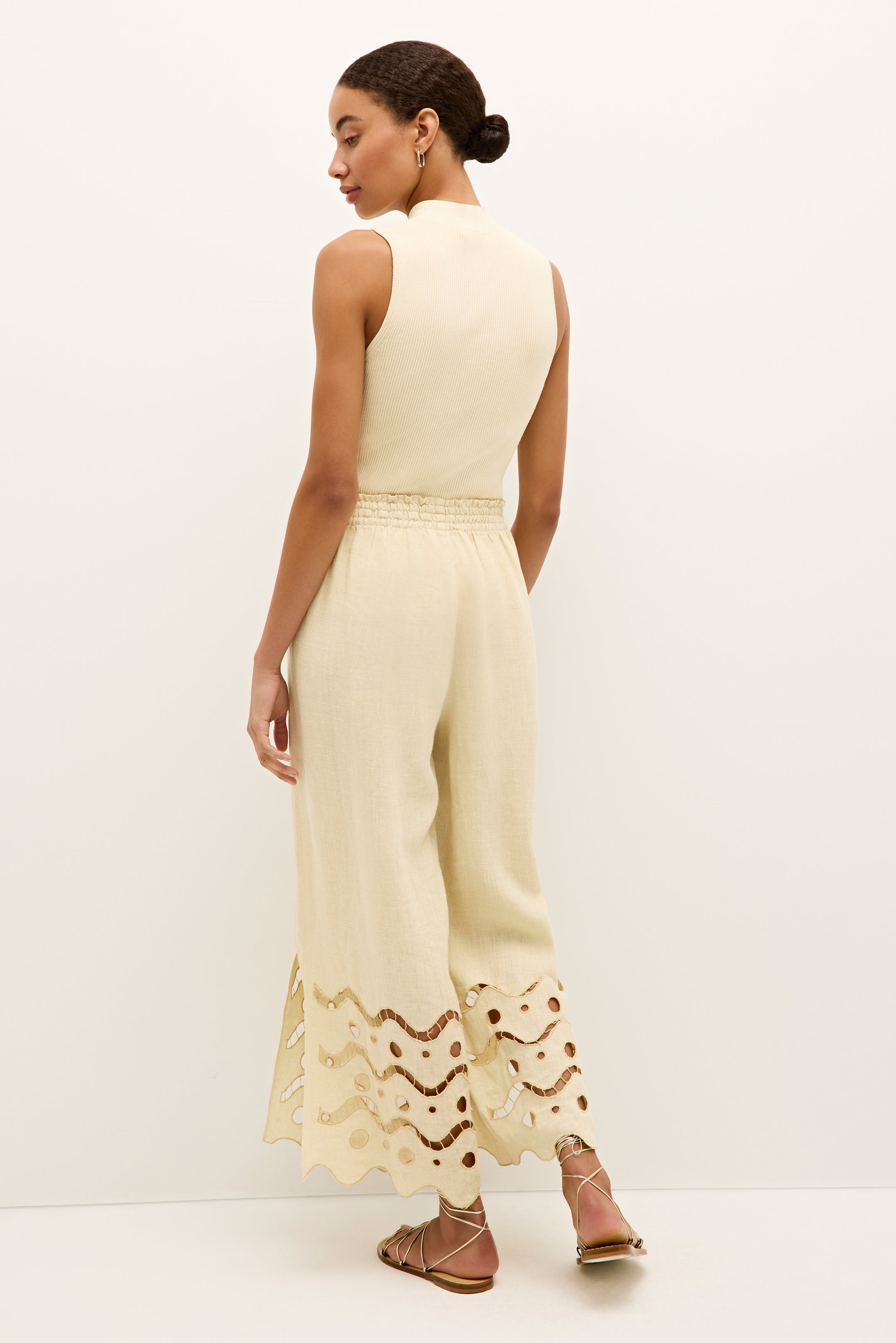 Effortless and easy, the Marin Pant in Birch Eyelet embodies breezy summer elegance. Crafted from a breathable cotton/flax blend with embroidered hem, this relaxed silhouette features a wide leg with subtle side slits for graceful movement. The smocked elastic waistband ensures a pull-on fit that sits comfortably at the natural waist. Finished with pockets and full lining, the Marin blends laid-back luxury with thoughtful functionality—perfect for beach days, brunches, and everything in between.
