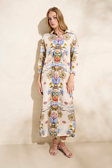 The classic shirt dress gets a Marie Oliver makeover courtesy of our Florentina placement print and a silk blend fabric that packs beautifully, shaking out wrinkle-free in a matter of hours. Wear Marnie as a dress, or style her as a luxe cover-up on your next warm-weather getaway.