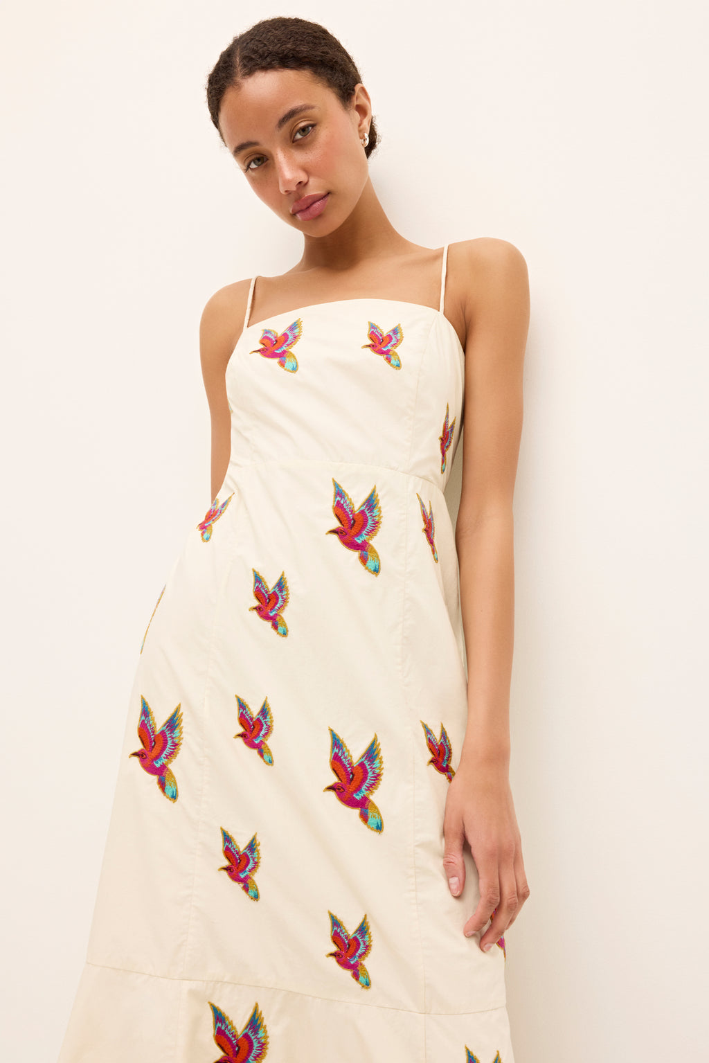 Pretty and feminine with a tie-front v-neck, puff sleeves, and flattering peplum waist, Estella looks just as stylish with jeans or a neutral short as it does our matching Owens skirt. Estella is pictured here in a lightweight, cream-colored cotton, and animated by a rainbow flock of embroidered appliqué parrots.