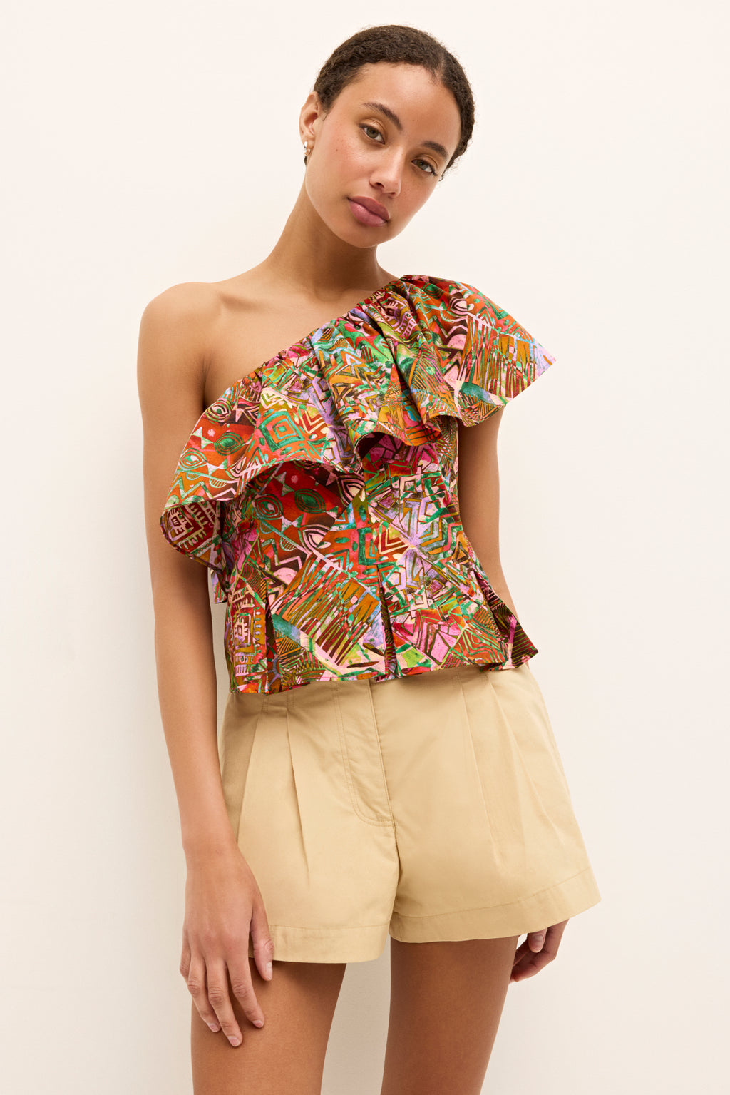 Easy wearability meets standout style in our new Mable top. Fitted straight through the body with puff sleeves and tie details at the neck, this slip-on silhouette is shown in Tahiti, a painterly patchwork print in a vibrant kaleidoscope of color. We’ve styled it here with the Lander short in Beige.
