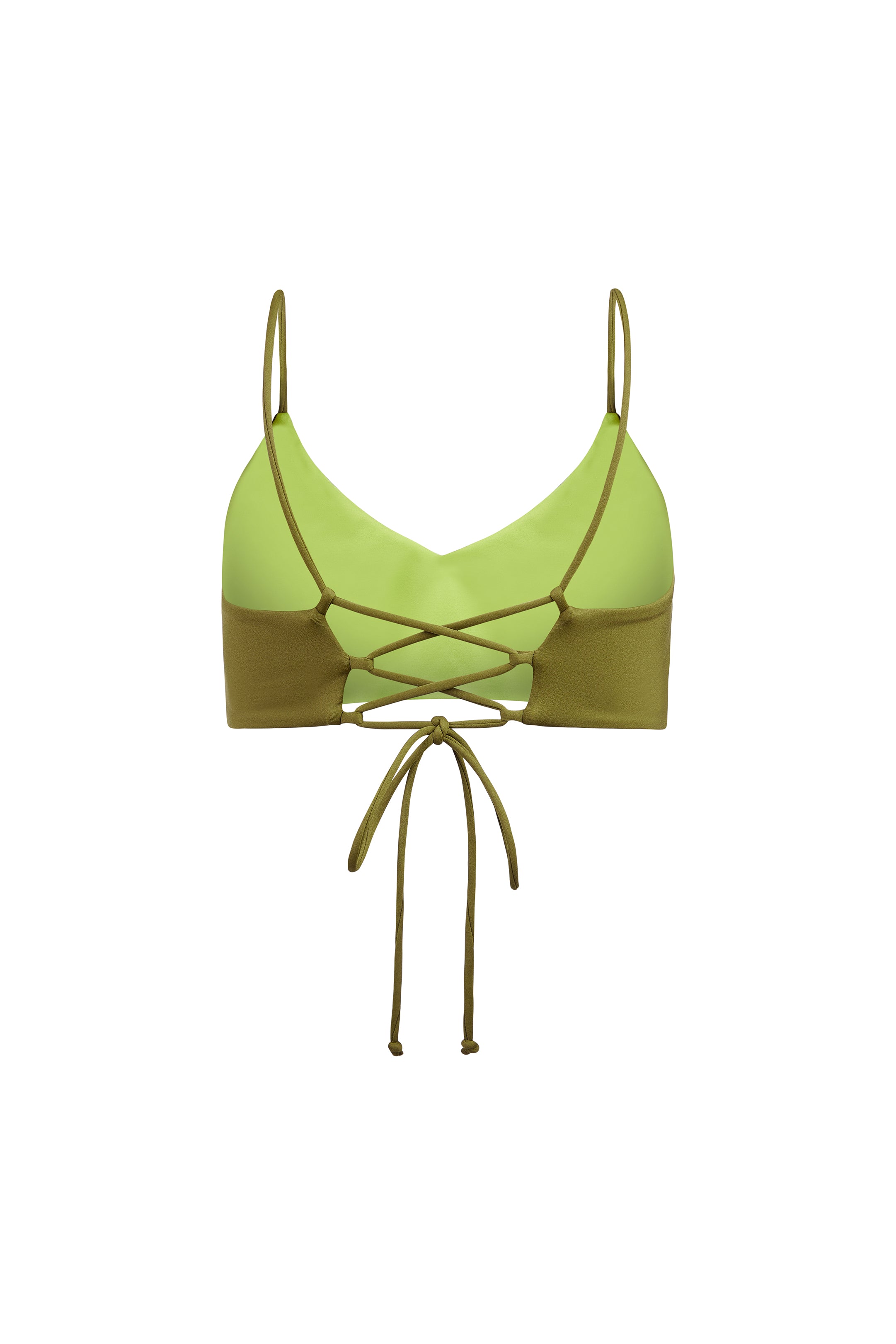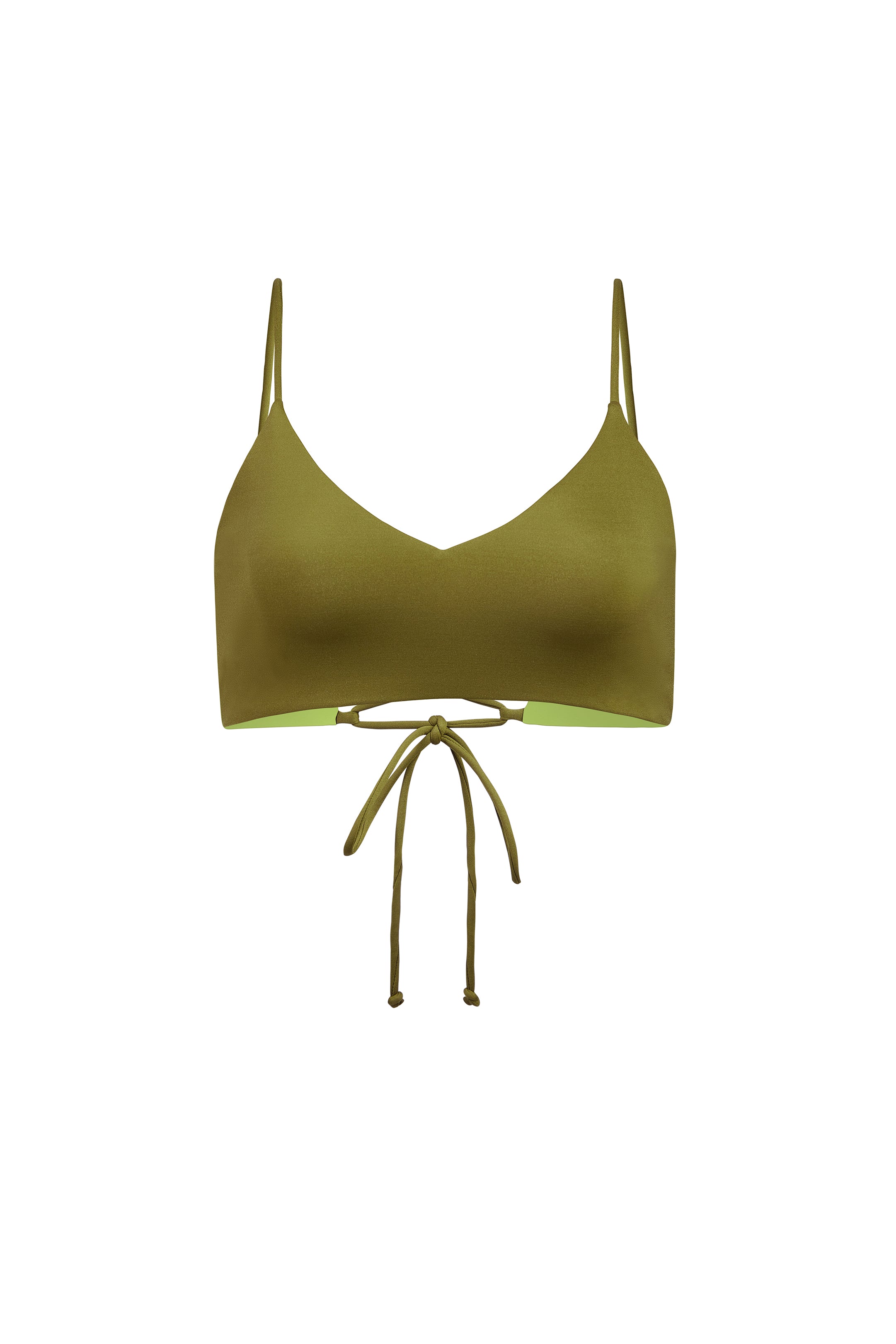 With a shallow v-neck and adjustable tie back, our new Lorelei top does double duty with a fully reversible body. The flattering silhouette comes in timeless Juniper Green, while its reverse side features a bolder Apple solid. Style Lorelei back to the matching Elle bottom.