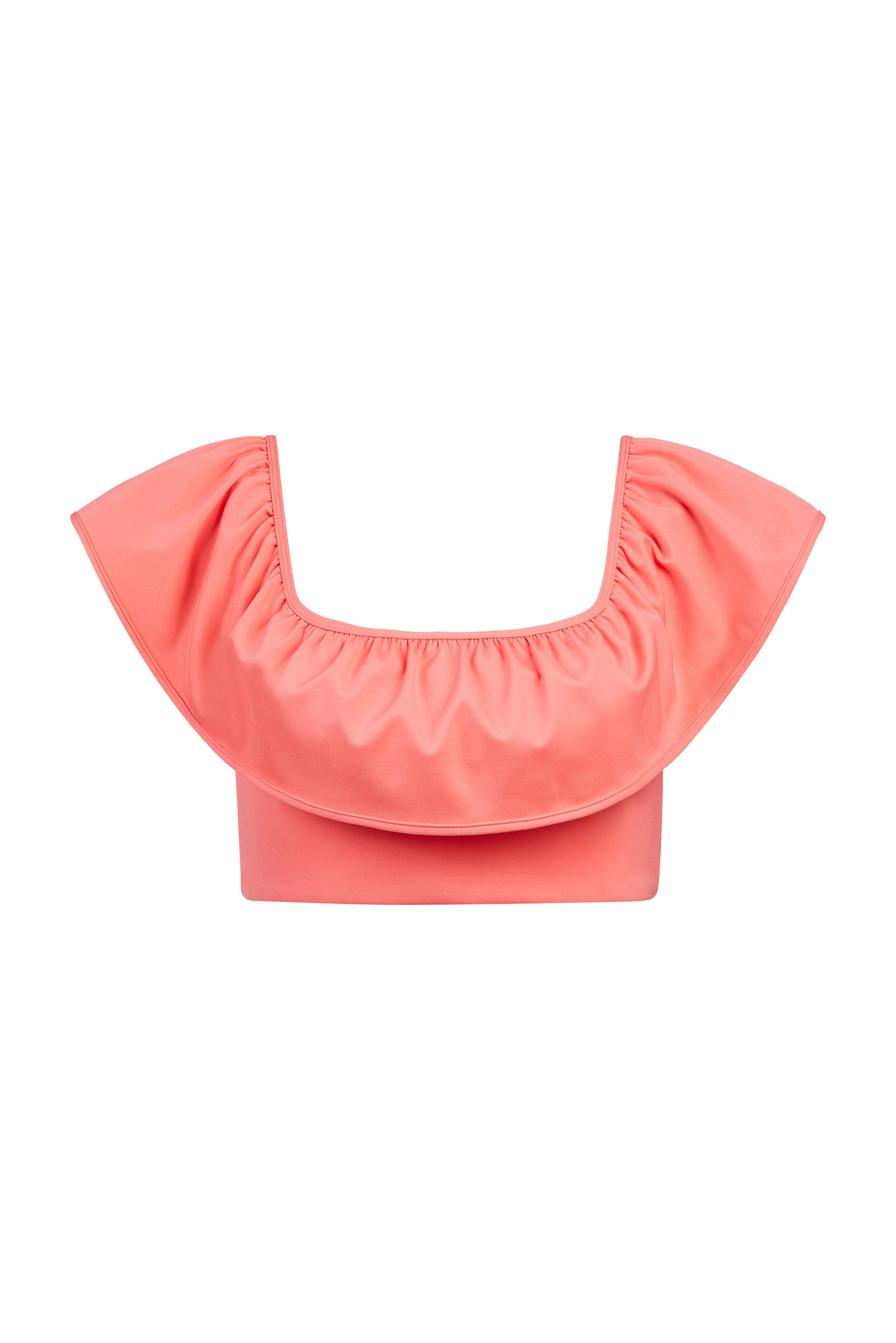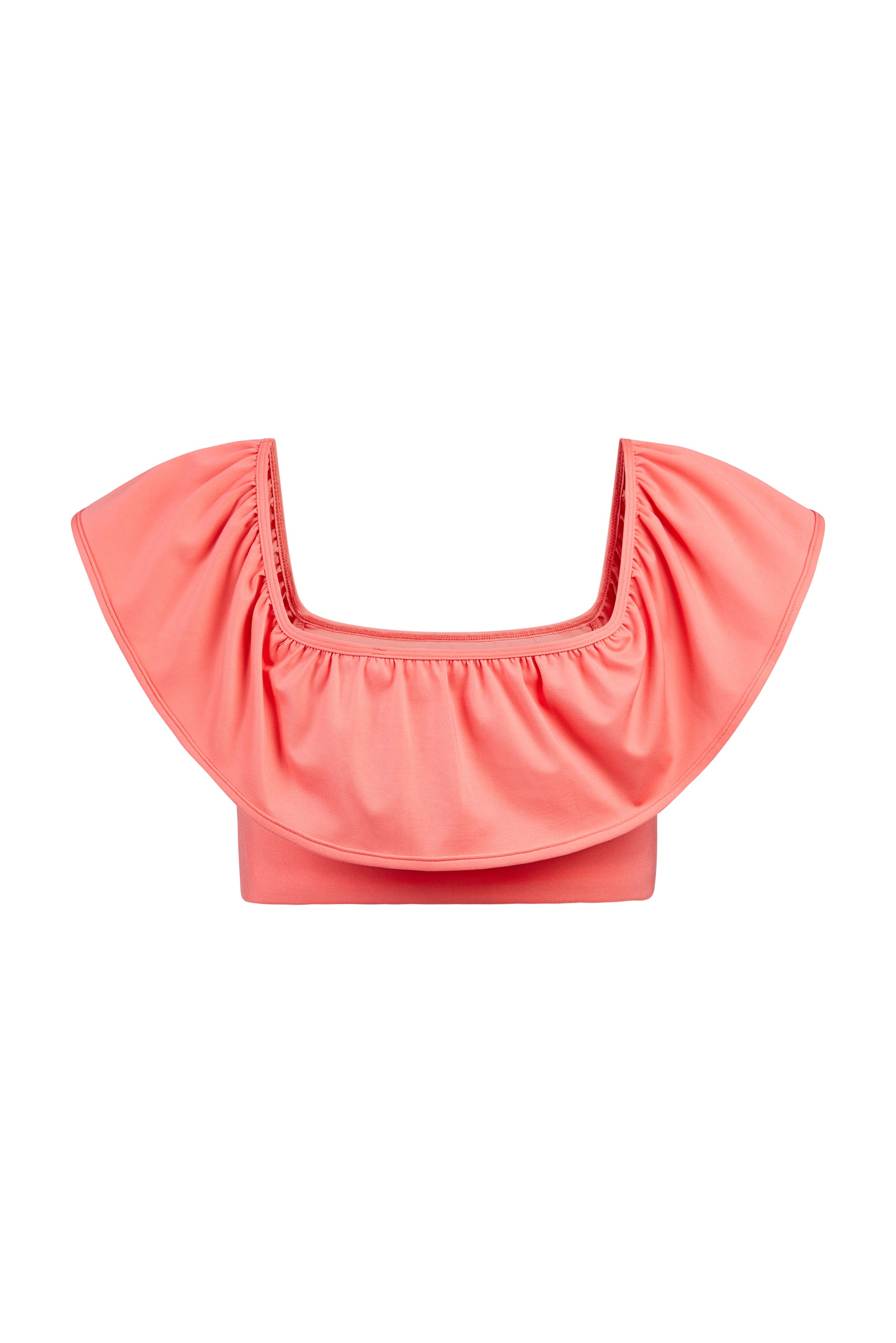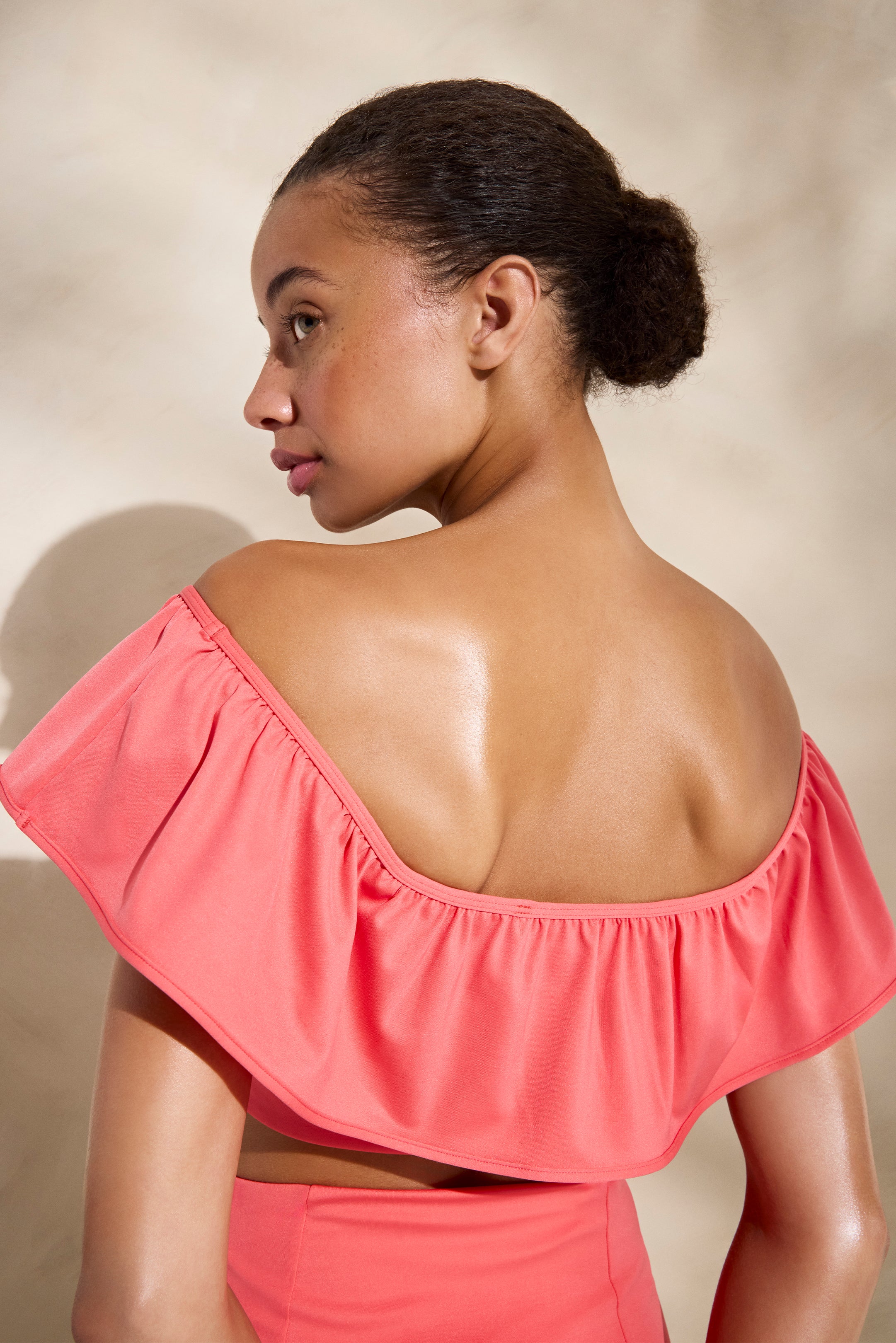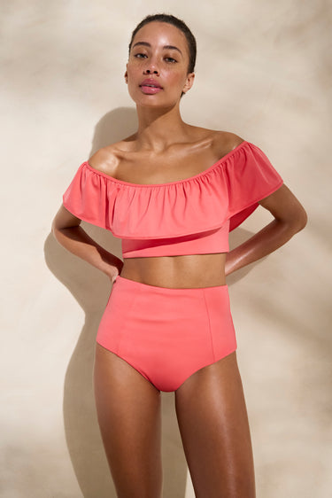 Our ruffled Emily top can be worn off the shoulder (bye, bye tan lines) or as true straps for more security. Its versatility means it’s the bikini top you'll reach for over and over again, whether you're sitting poolside with your kids or lounging by the water in a far flung tropical paradise. Emily is pictured here in Coral, and pairs with the matching high-waisted Micha bottom for a set, or mixes with complementary styles like our Elle bottom in Bellini.