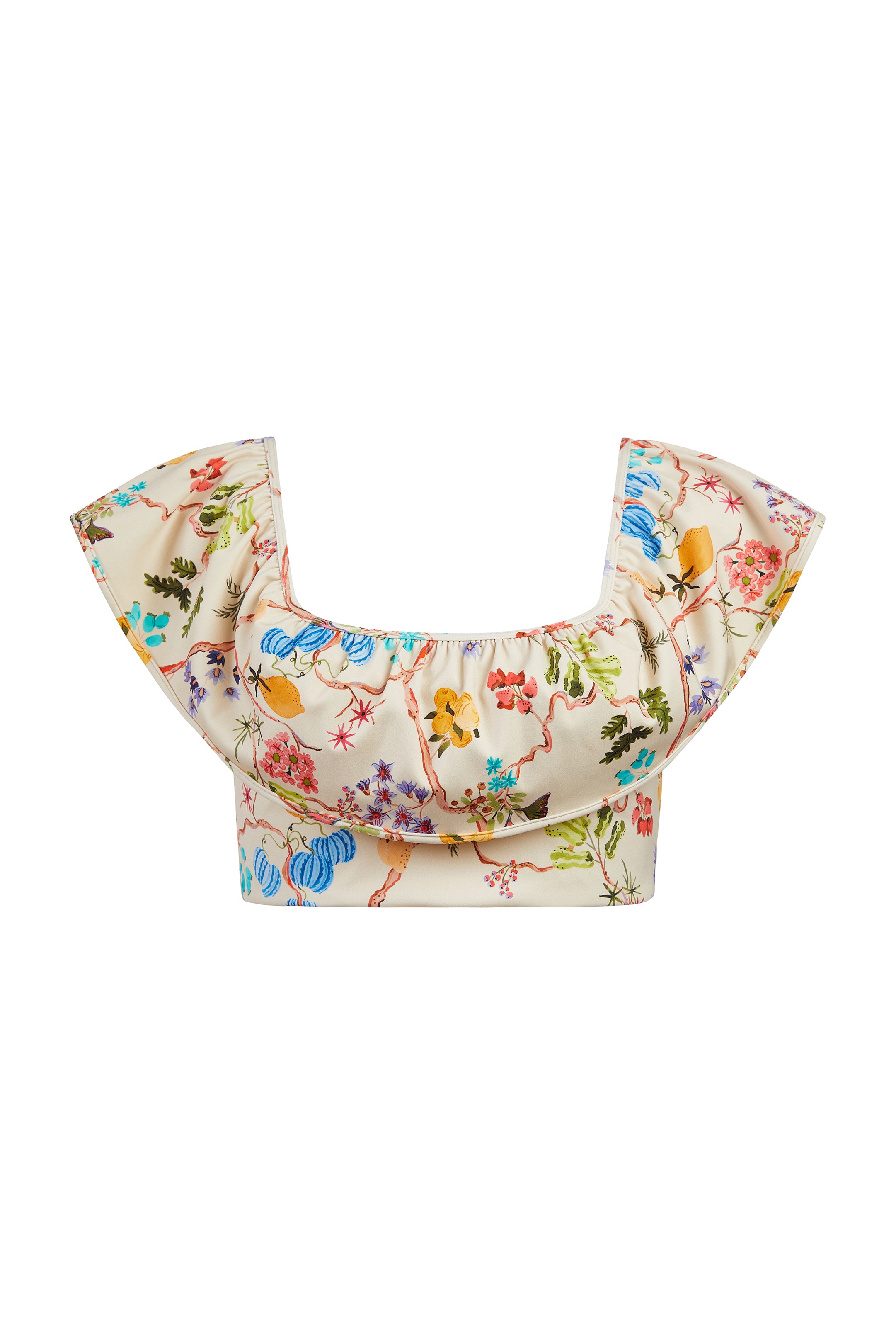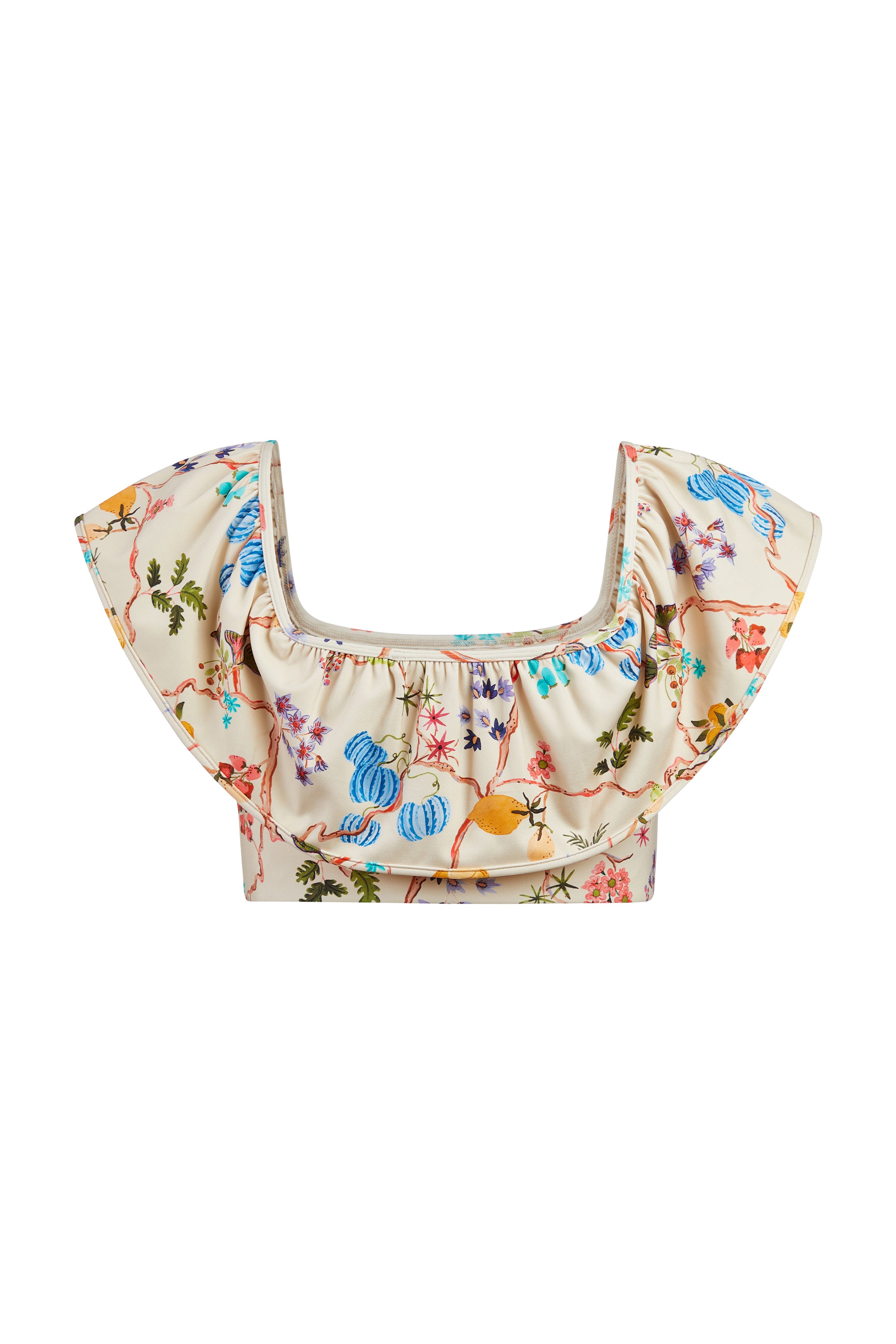 Our ruffled Emily top can be worn off the shoulder (bye, bye tan lines) or as true straps for more security. Its versatility means it’s the bikini top you'll reach for over and over again, whether you're sitting poolside with your kids or lounging by the water in a far flung tropical paradise. Emily is pictured here in Orchard. To complete the look, pair Emily with our high-waisted Micha top in Grove and slip into our popular Ariel beach pant.