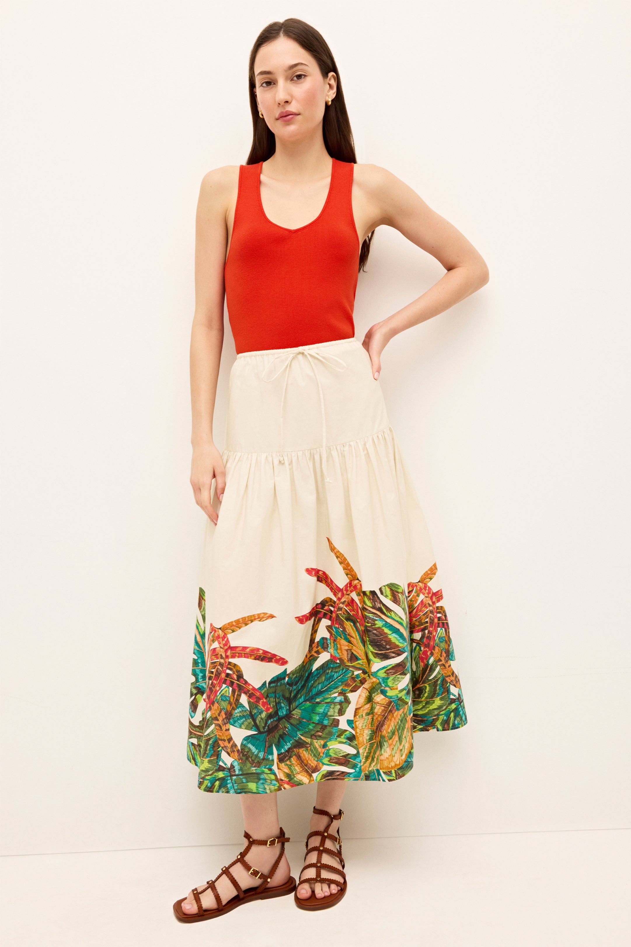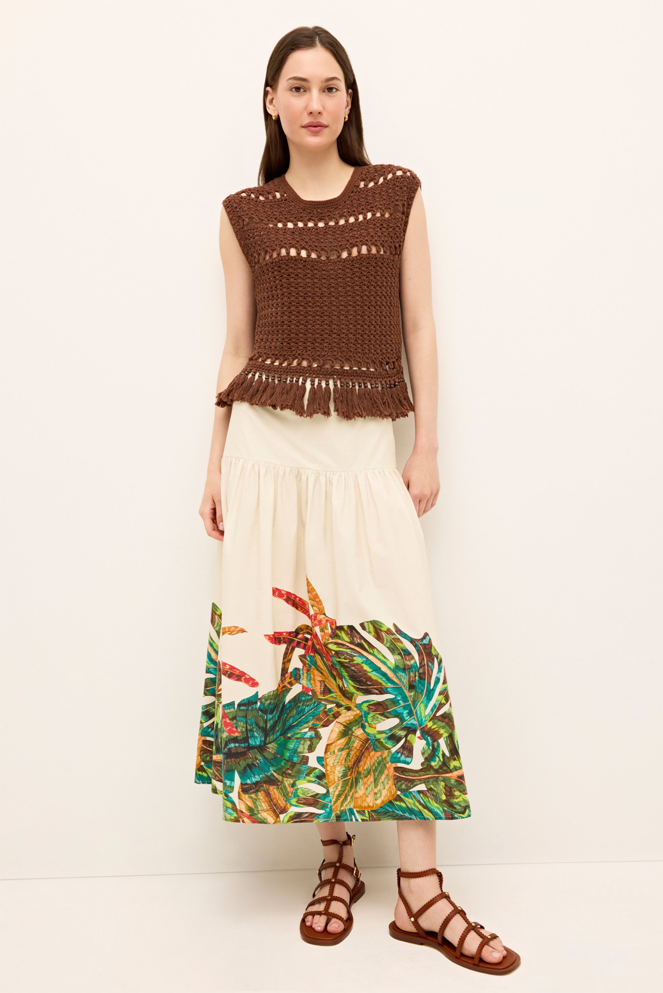Designed for everyday wear, our casual midi-length Louise skirt is made from a lightweight cotton and features a drawstring waistband, a stylish drop waist yoke, and a jungle-inspired placement print along the hemline. Louise is pictured here with our crochet Mira top in a coordinating walnut brown.