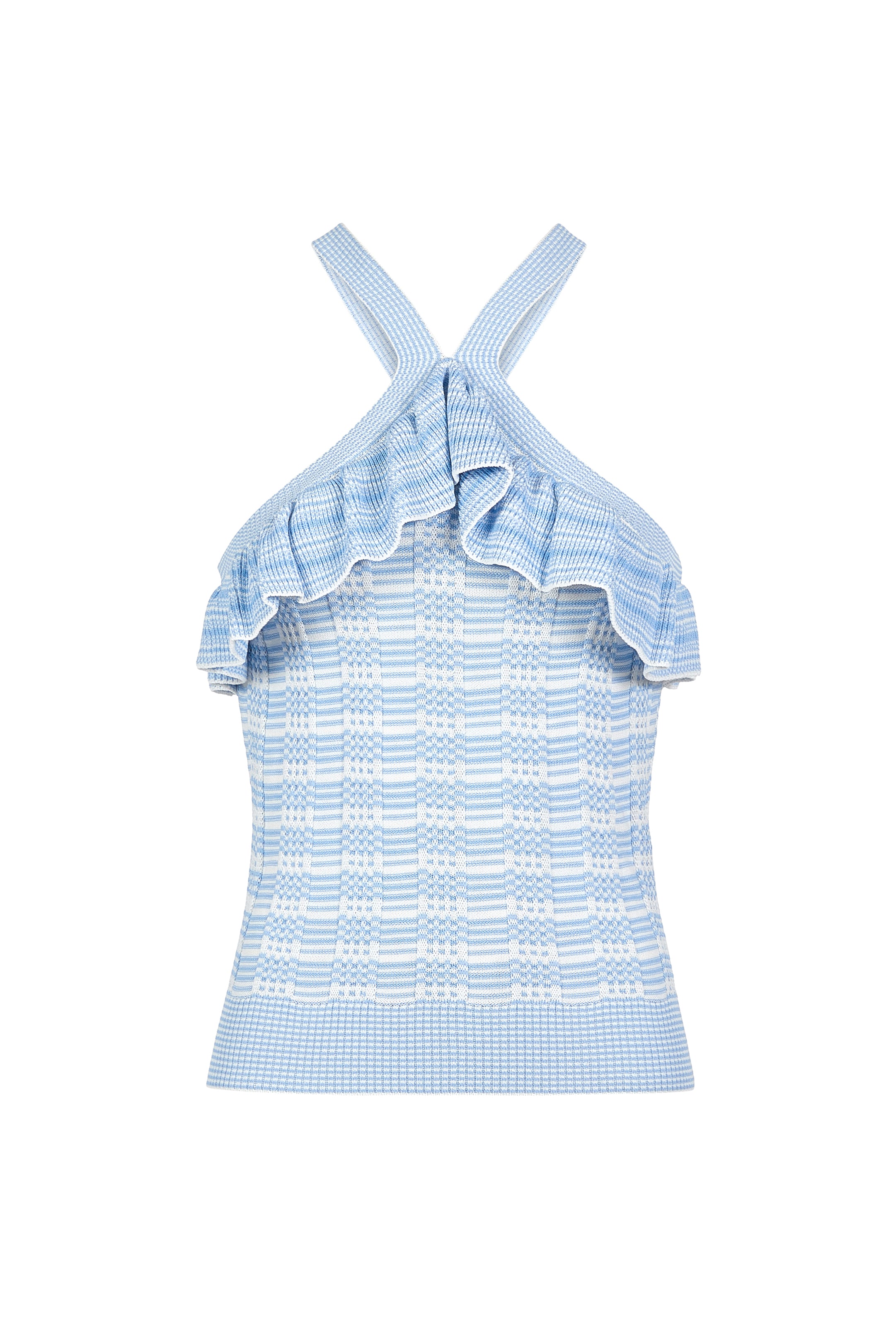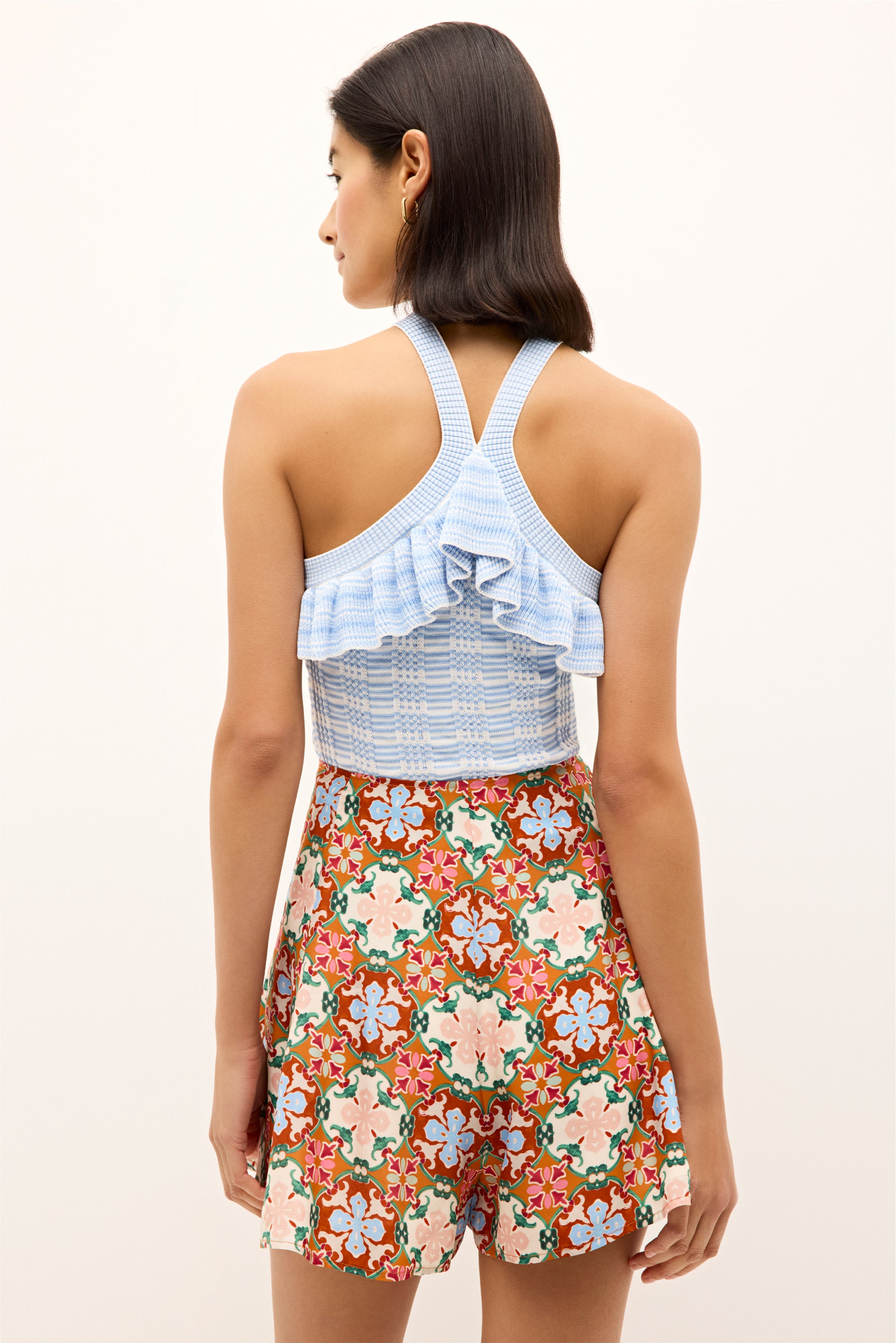 Tricia is cut from a soft, blue-and-white striped knit with ruffle detailing along the halter-style neckline. Its playful femininity is the perfect counterpoint to our bolder Miles short, which comes in our Mallorca-inspired Mosaic print in a sun-drenched Mediterranean color palette. Or you can play up the romance of the silhouette, and pair it back to our matching Sawyer skirt in Cruise.