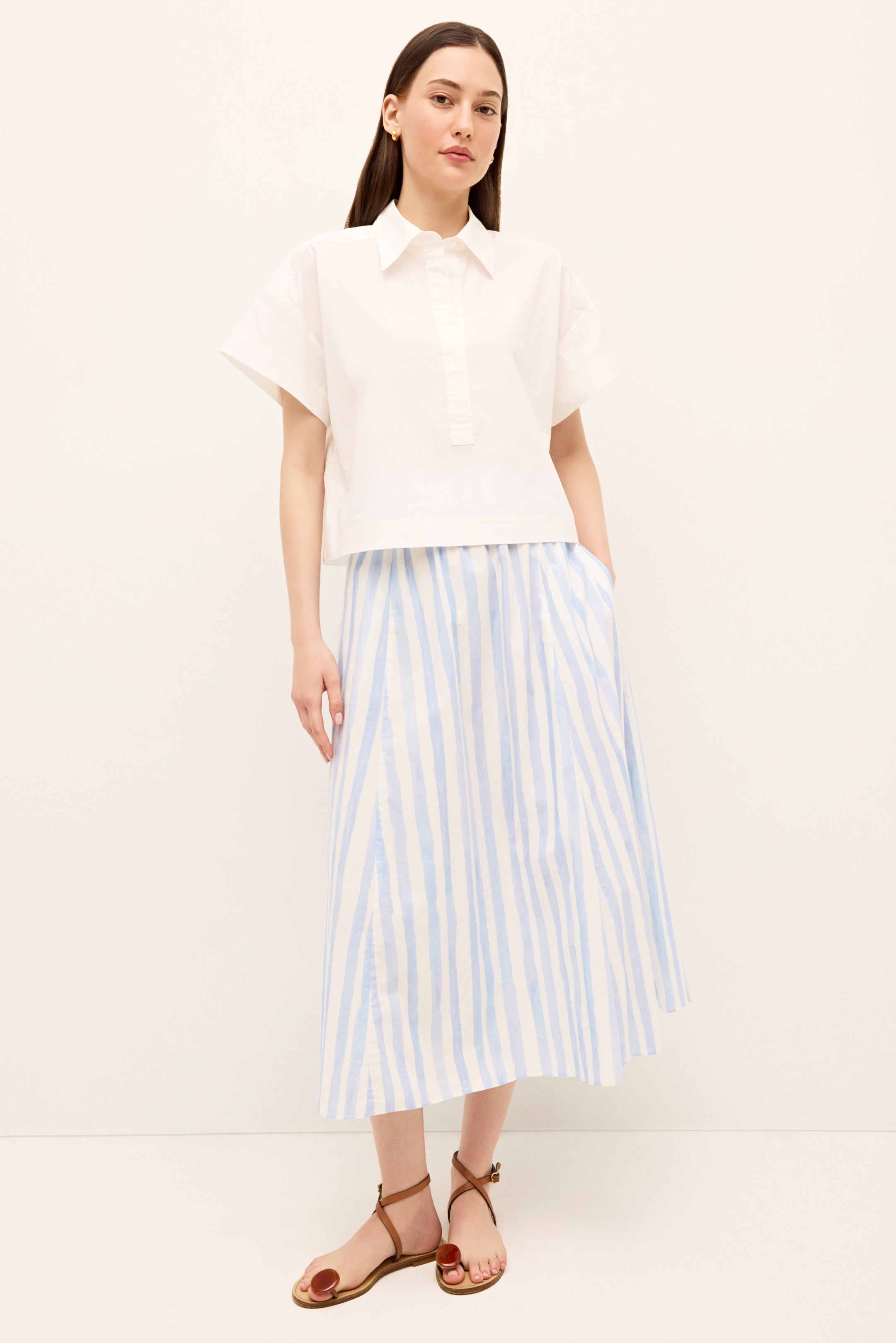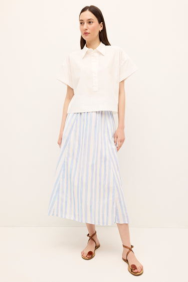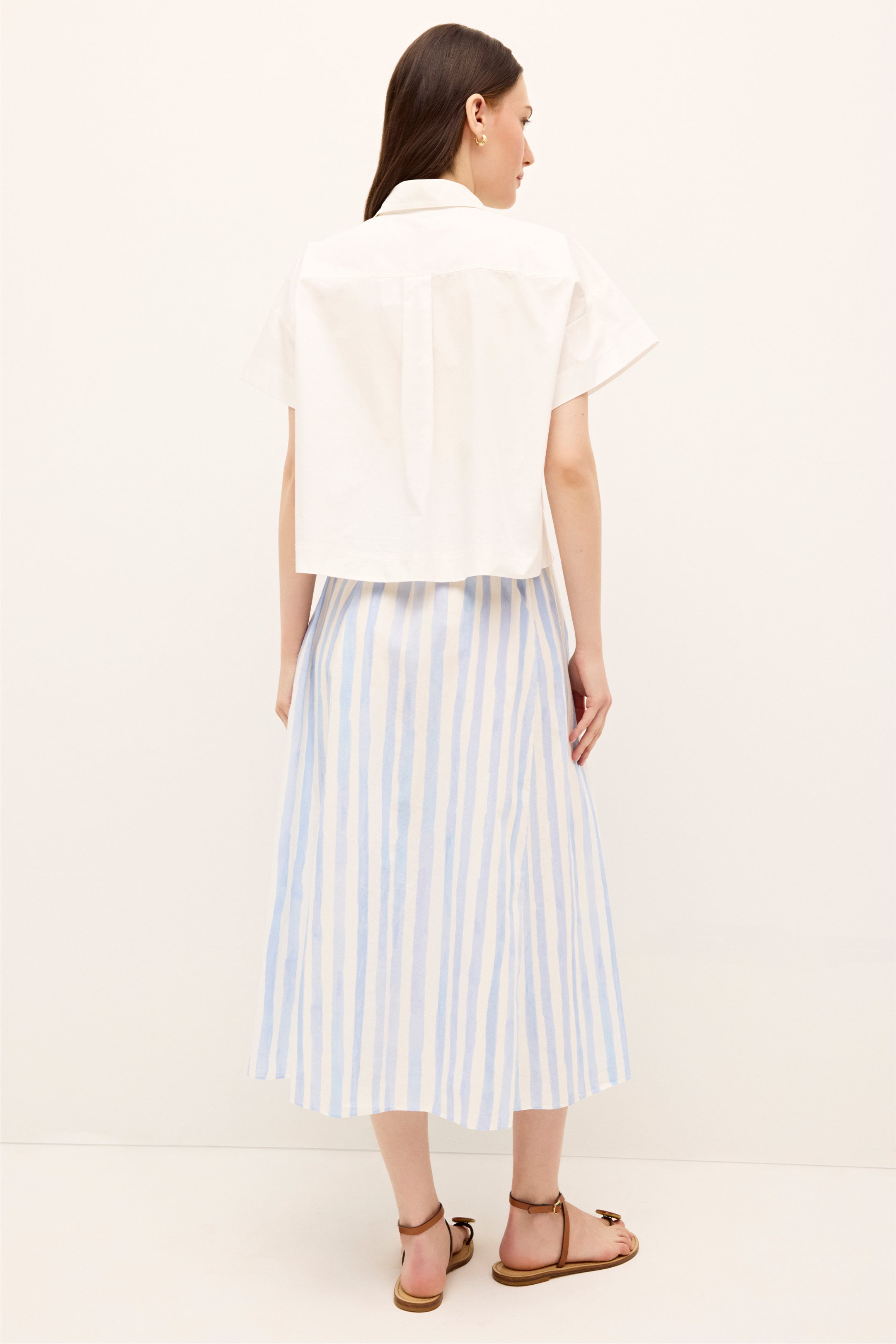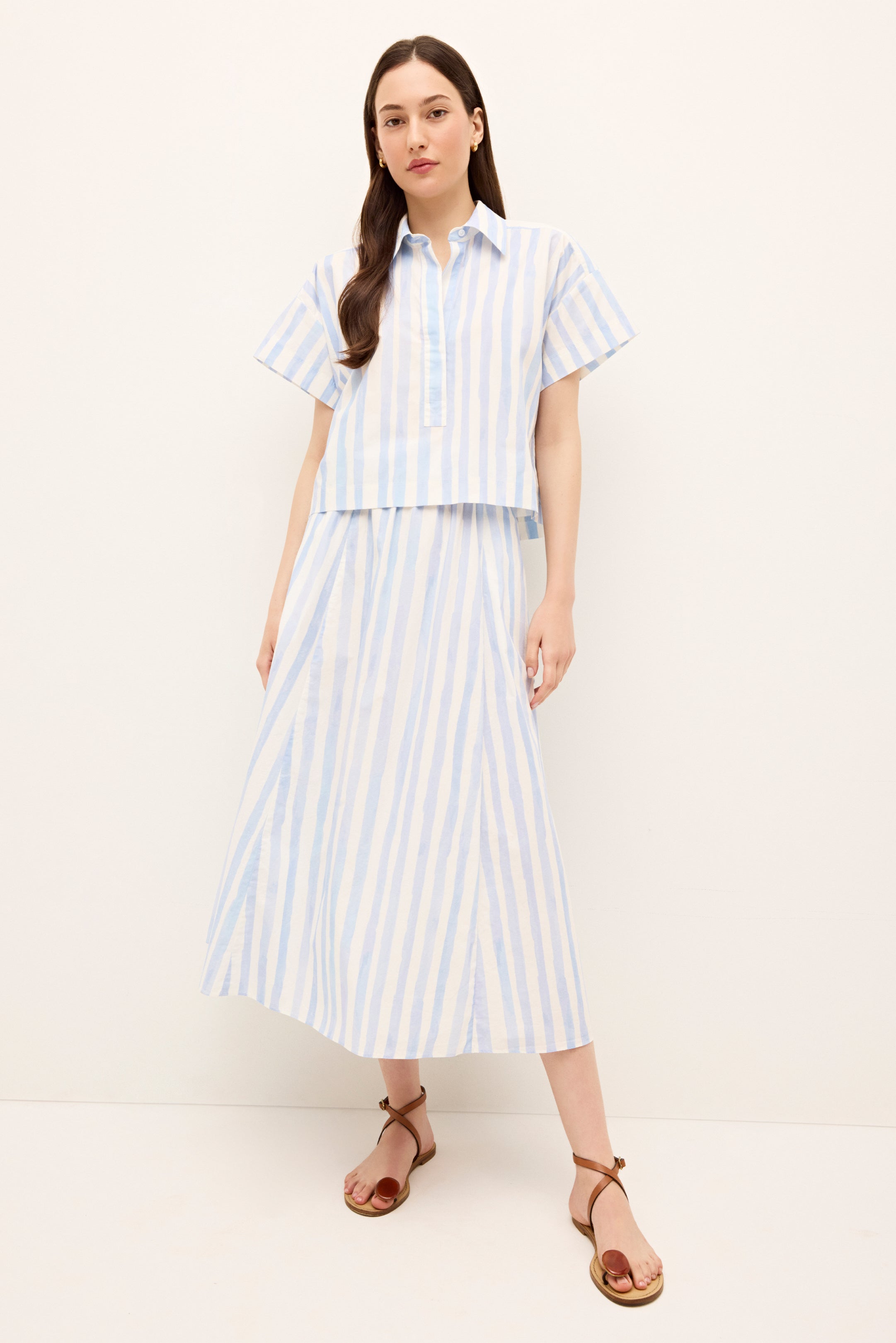 With a voluminous skirt, an elastic waistband, and pockets(!), our new Sasha skirt is as fun to wear as it is flattering. This season, we've channeled the romance of a Mediterranean summer with the addition of a blue-and-white watercolor stripe. Pair the scene-stealing skirt with Evelyn, our matching cropped button-down, to make it a set.