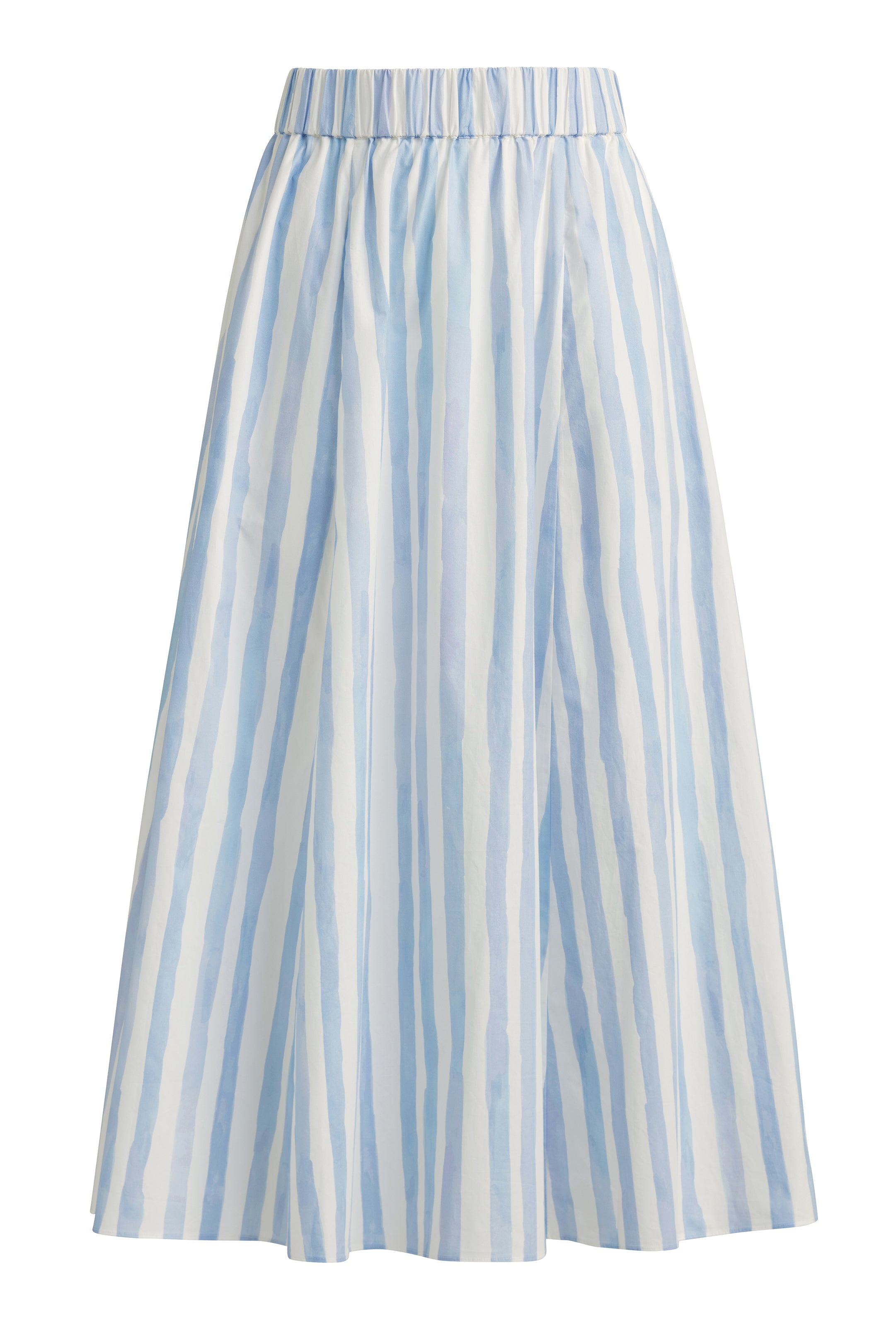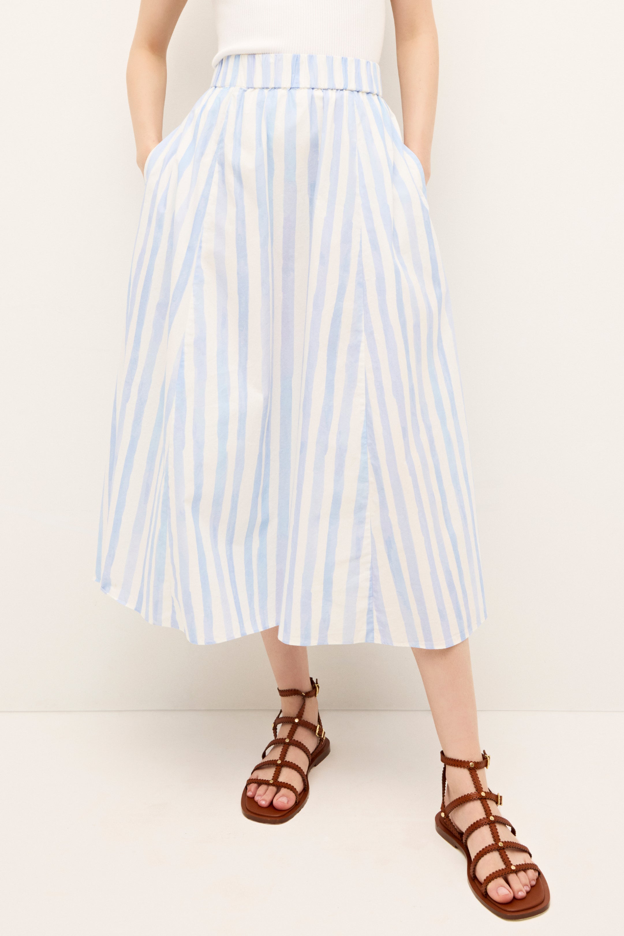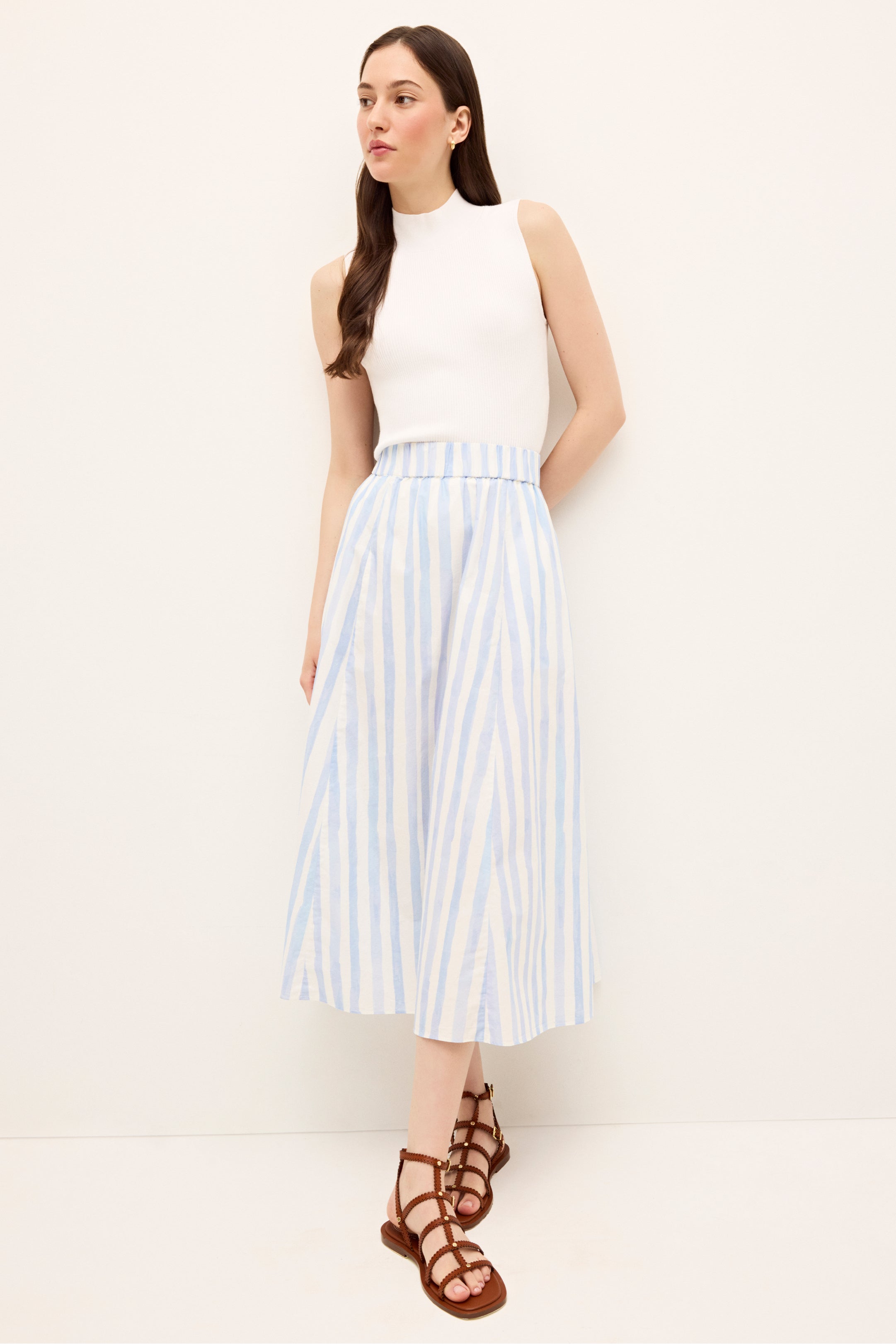 With a voluminous skirt, an elastic waistband, and pockets(!), our new Sasha skirt is as fun to wear as it is flattering. This season, we've channeled the romance of a Mediterranean summer with the addition of a blue-and-white watercolor stripe. Pair the scene-stealing skirt with Evelyn, our matching cropped button-down, to make it a set.