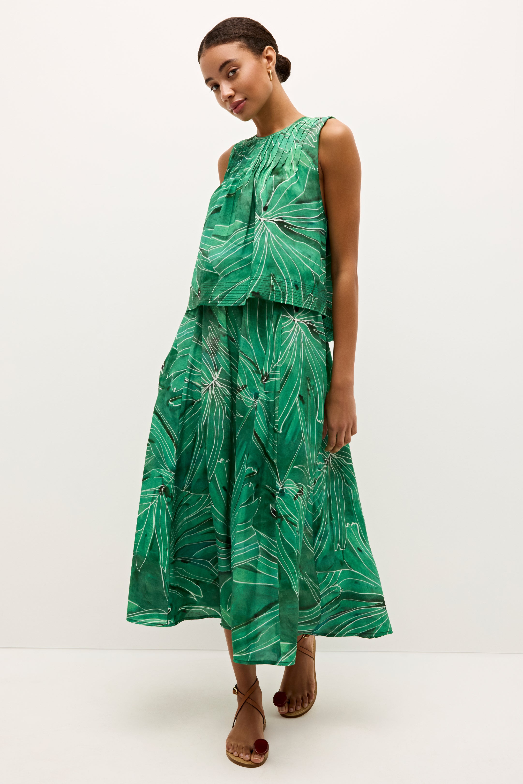 With a voluminous skirt, an elastic waistband, and pockets(!), our new Sasha skirt is as fun to wear as it is flattering. This season, we’ve played up the romance of the silhouette with the addition of a saturated botanical in deep emerald green. Pair Sasha with our matching Letta top in Amazon for a vacation-ready look.