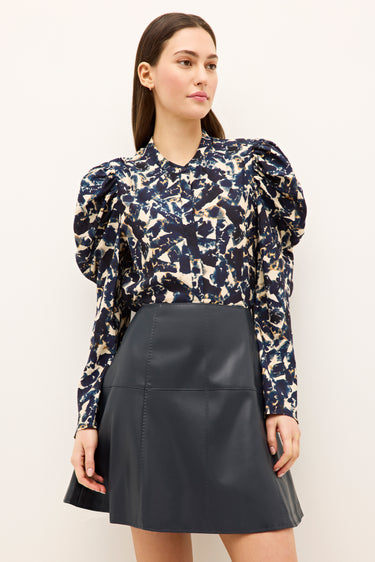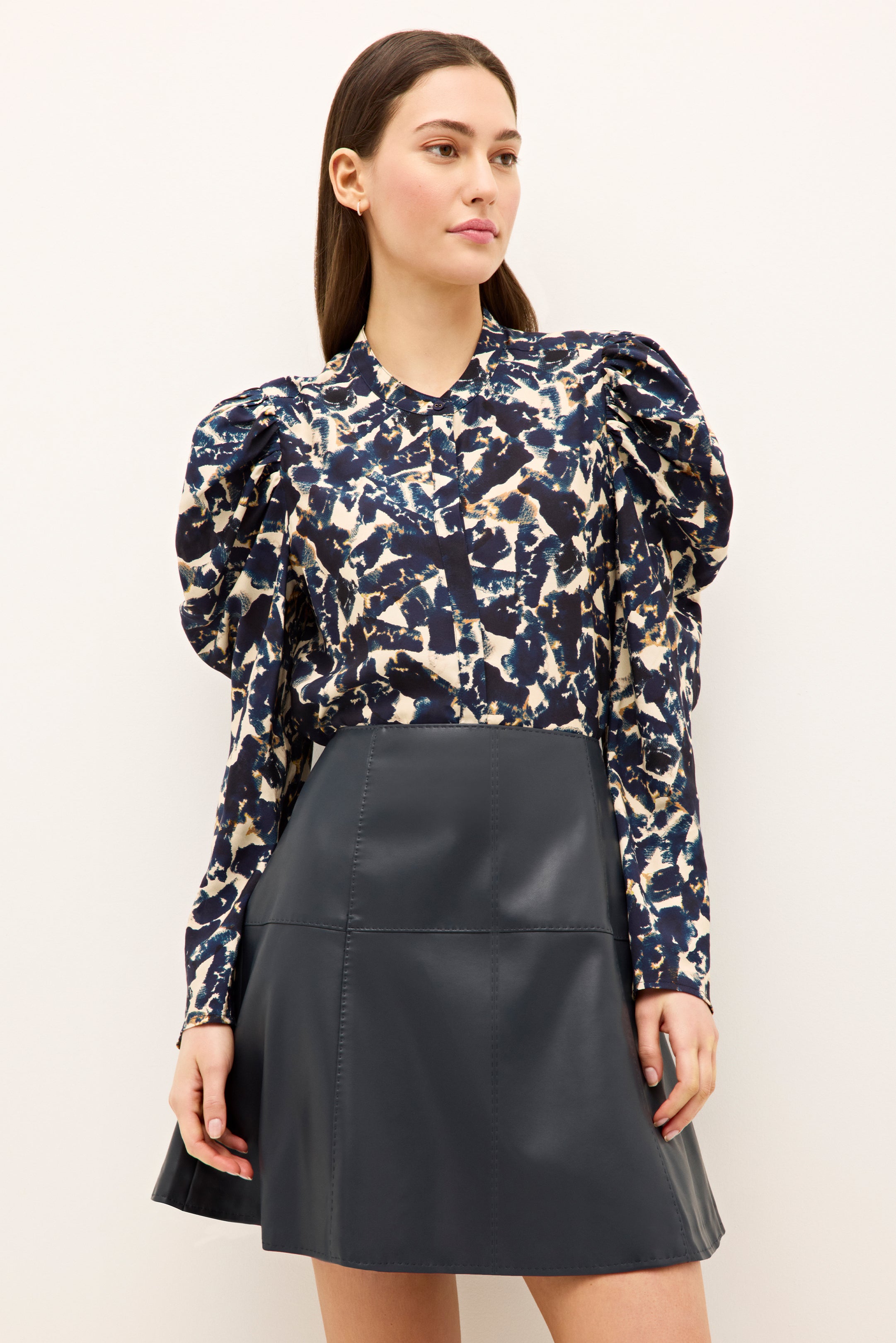 This versatile mini is fitted at the waist and hips with a gentle flare to create a flattering and playful silhouette. Cut from our new and improved soft vegan leather, the Crawford skirt is pictured here with our metallic McGuire shell for a textured autumn look.