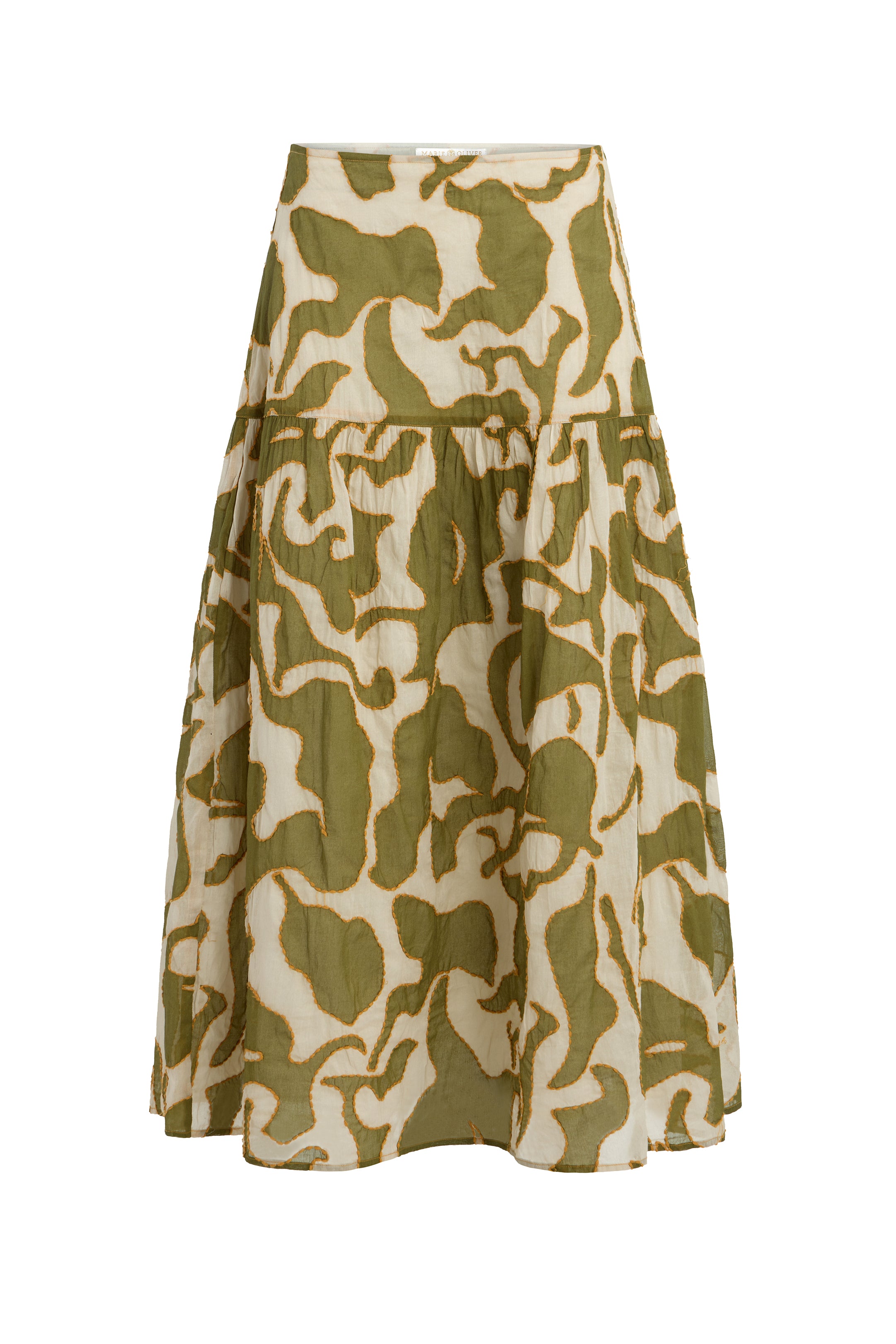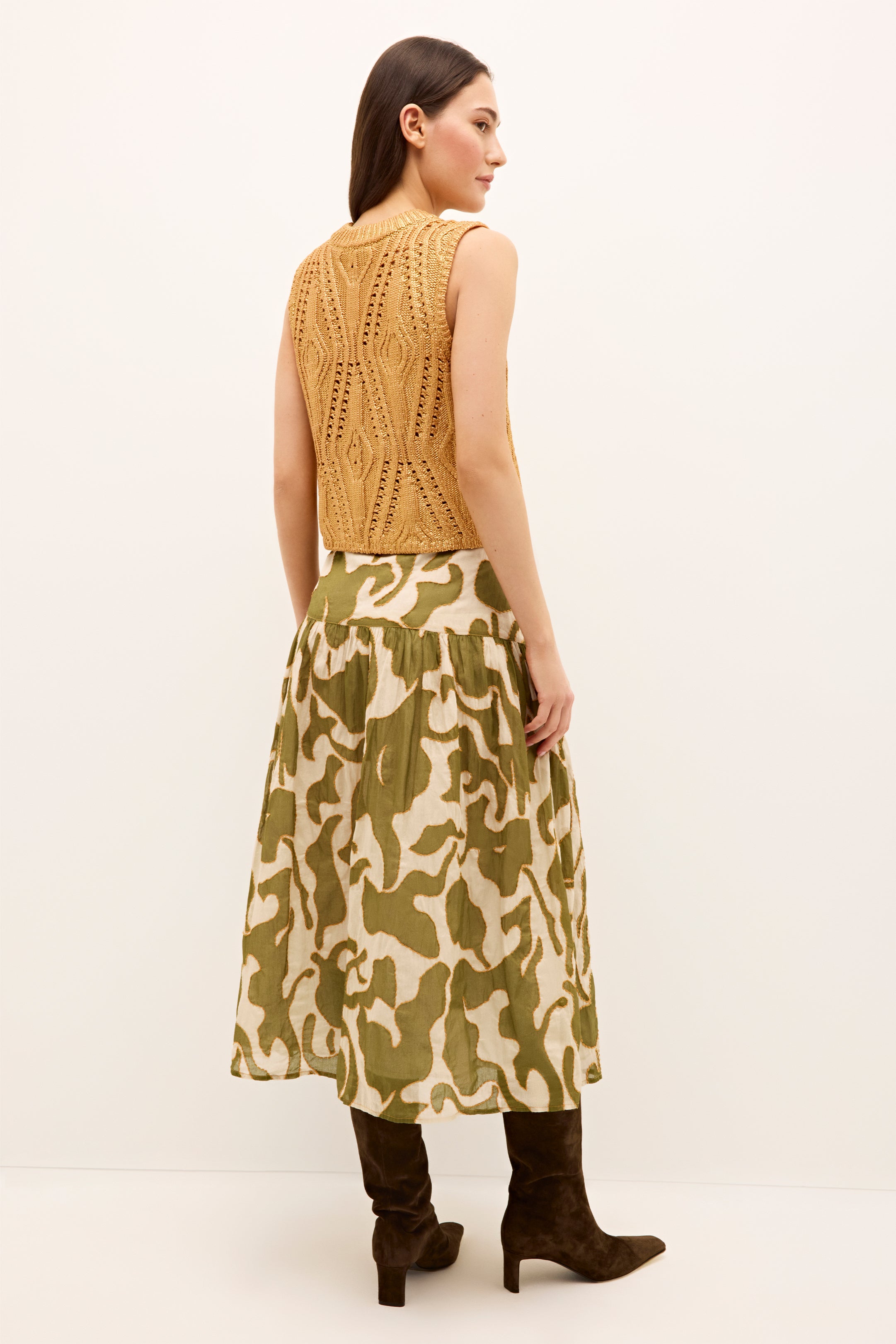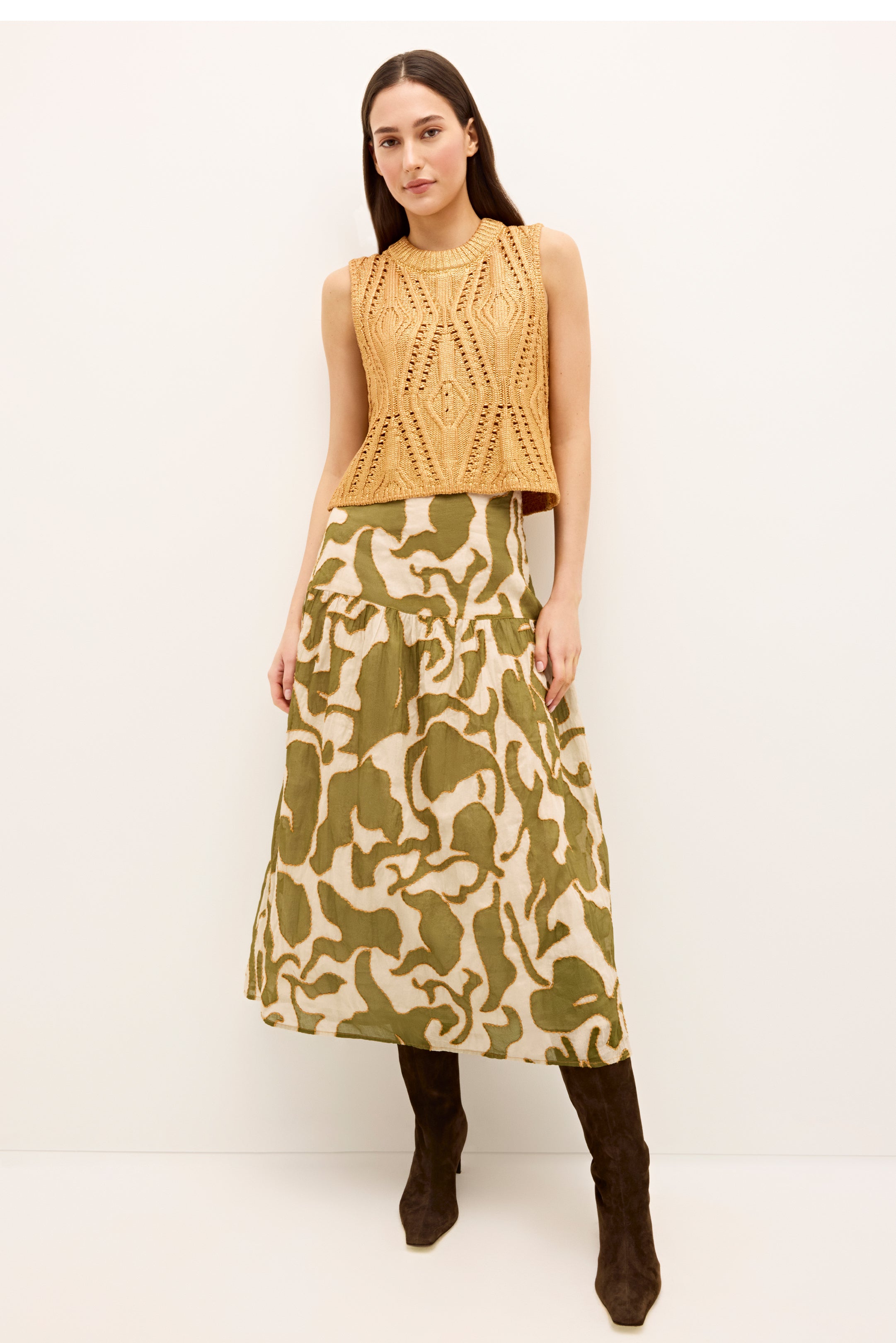 An elegant drop waist and subtly textured fabric give our midi-length Owens skirt a polished, elevated feel, especially when paired with the metallic McGuire shell in Gold. For a more casual take, style it with Mazie, our favorite fitted ribbed-knit tank. The skirt features our new Galapagos pattern, an abstract swirl of green and tan, printed on airy cotton organza and hand-embroidered by artisans in India to create depth and dimension.