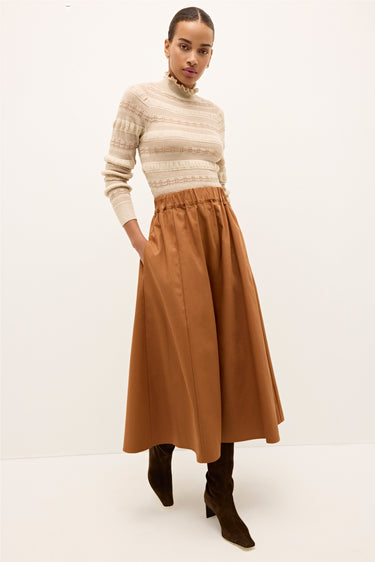 With a voluminous skirt, an elastic waistband, and pockets(!), our Sasha skirt is as fun to wear as it is flattering. This season, we’ve played up the romance and versatility of the silhouette in a rich argan hue. Pair Sasha with our new knit Addison top in Buff for your new favorite work-to-weekend look as the seasons shift. For a statement set, the matching Ethridge trench completes the look.