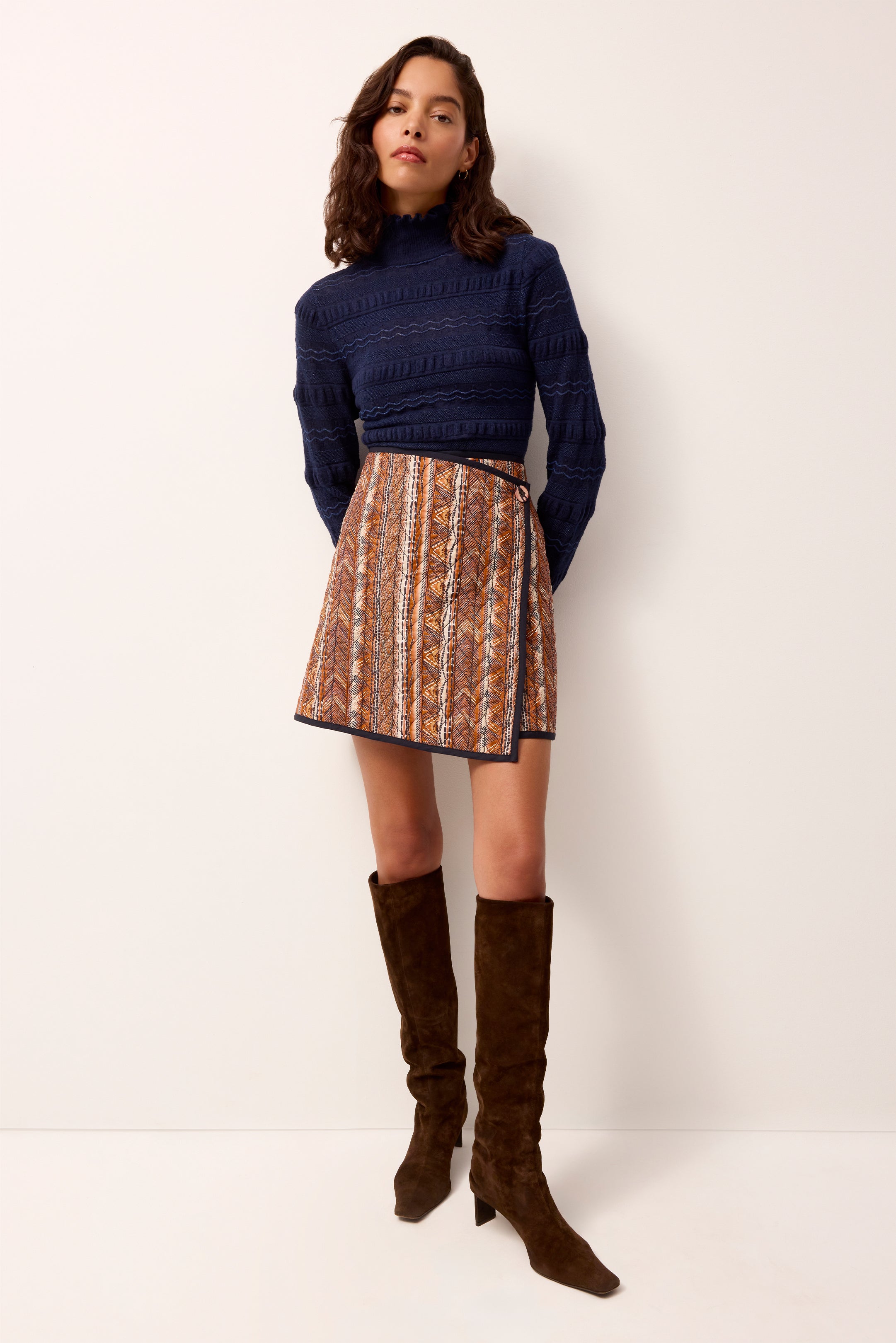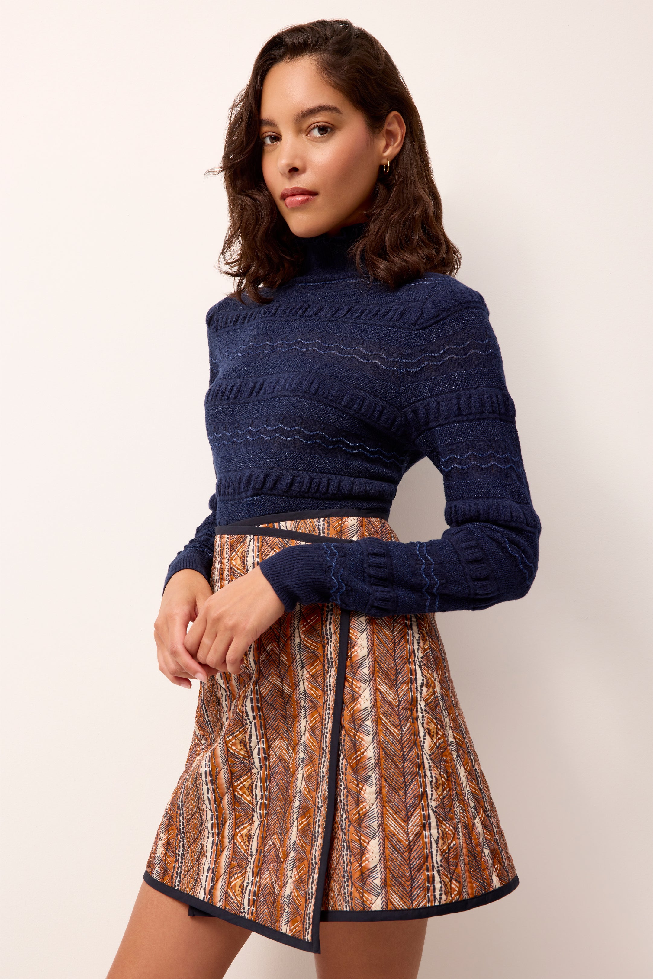 Your new favorite body-skimming turtleneck gets a feminine upgrade with allover folded ruffle details, plus a delicate pointelle knit woven with metallic yarn for a subtle shimmer. We love the juxtaposition of the deep Pacific colorway with the reversible Orca skirt, balancing seasonal sweetness against autumnal hues and differing textures.