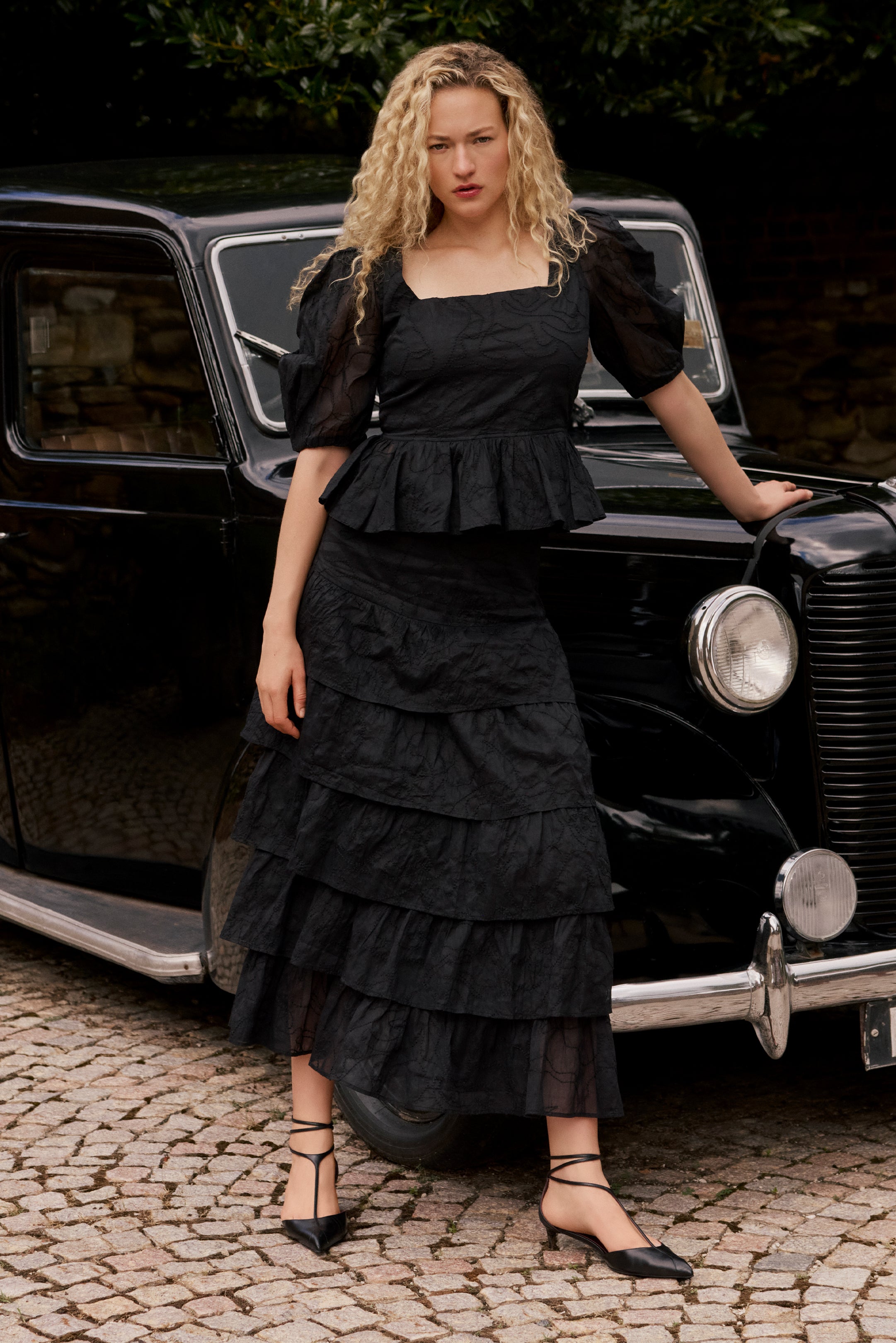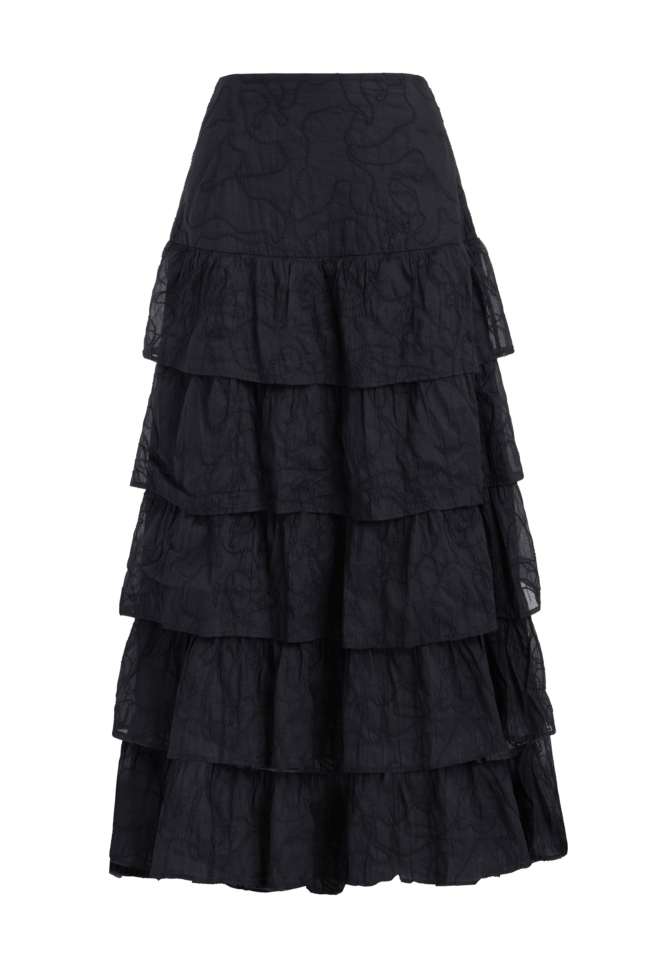 Fitted through the waist and hips, our Christie skirt skims the floor in a cascade of tiers. The statement-making skirt is pictured here in our Tourmaline solid. Pair Christie with our matching Orla top for an exuberant party set. For added interest, the delicate cotton organza is hand embroidered in tone-on-tone black by local artisans in India to give texture and depth to the fabric.