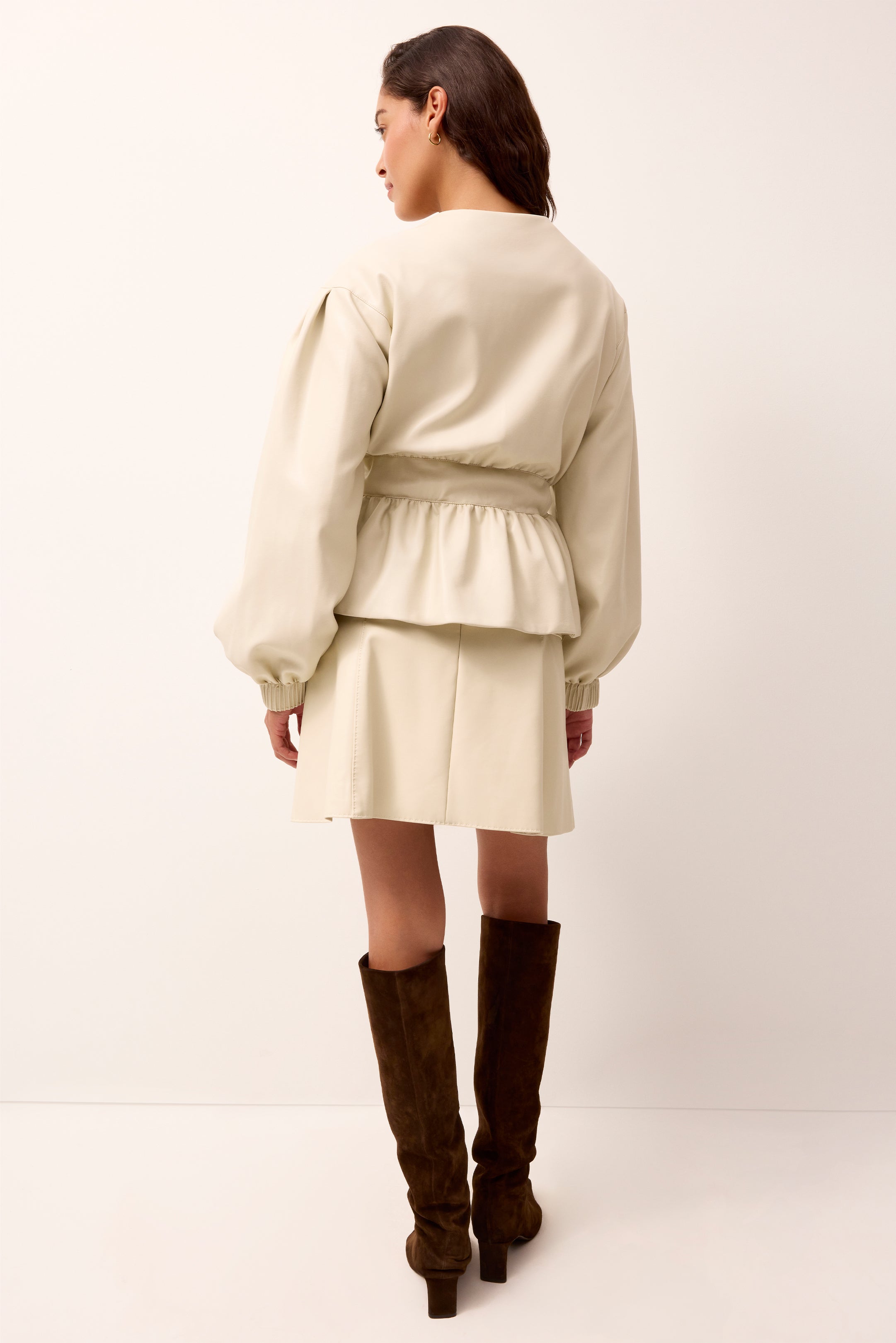 A vegan leather jacket with plenty of attitude, the Coco exhibits feminine appeal thanks to quilted and pleated details that will keep you warm in style. A tie at the wast creates cinching along with a more personalized fit, while pleated cuffs add unexpected elegance. Its neutral hue allows for any manner of mixing, but we love matching it with the Crawford skirt in Polar.