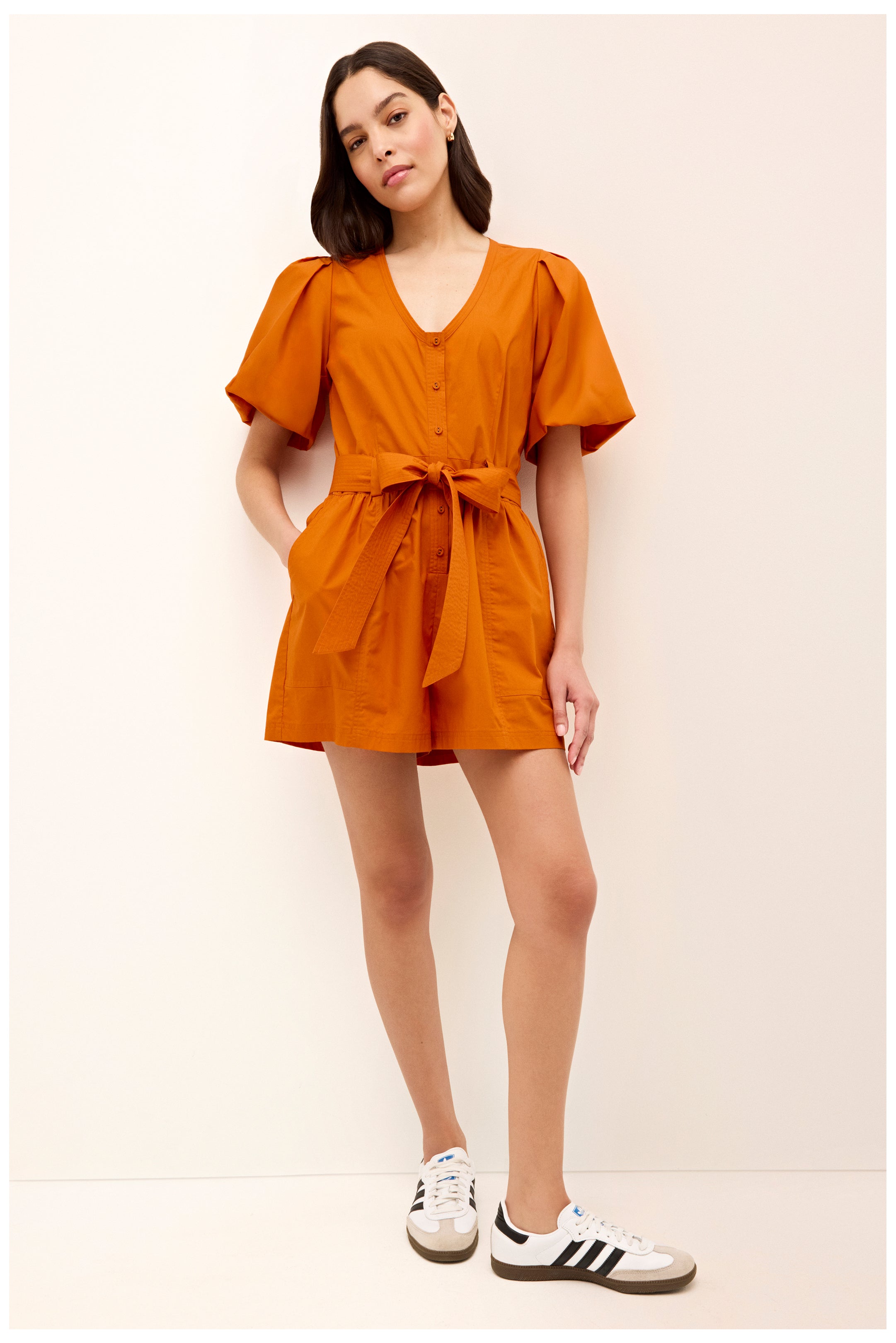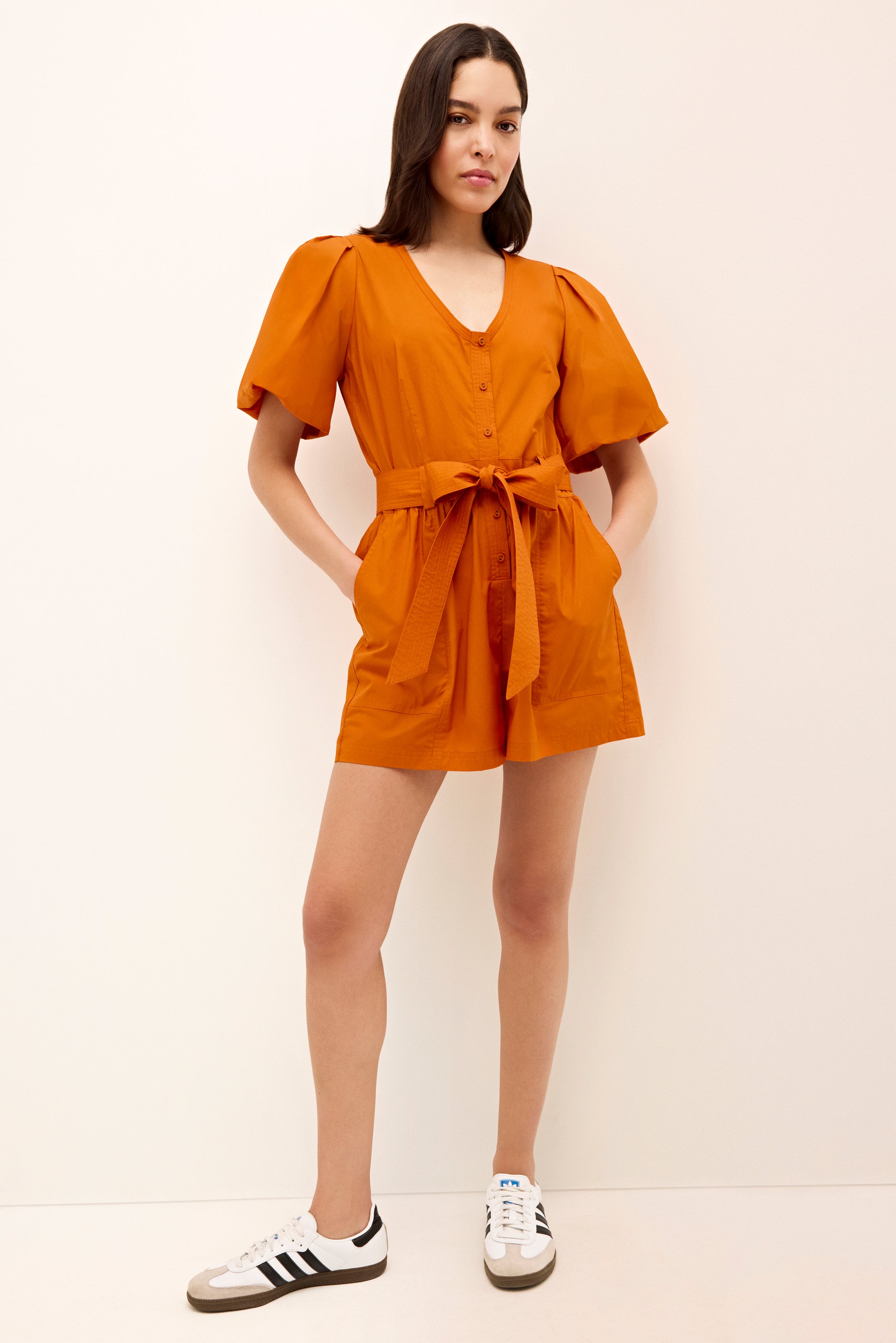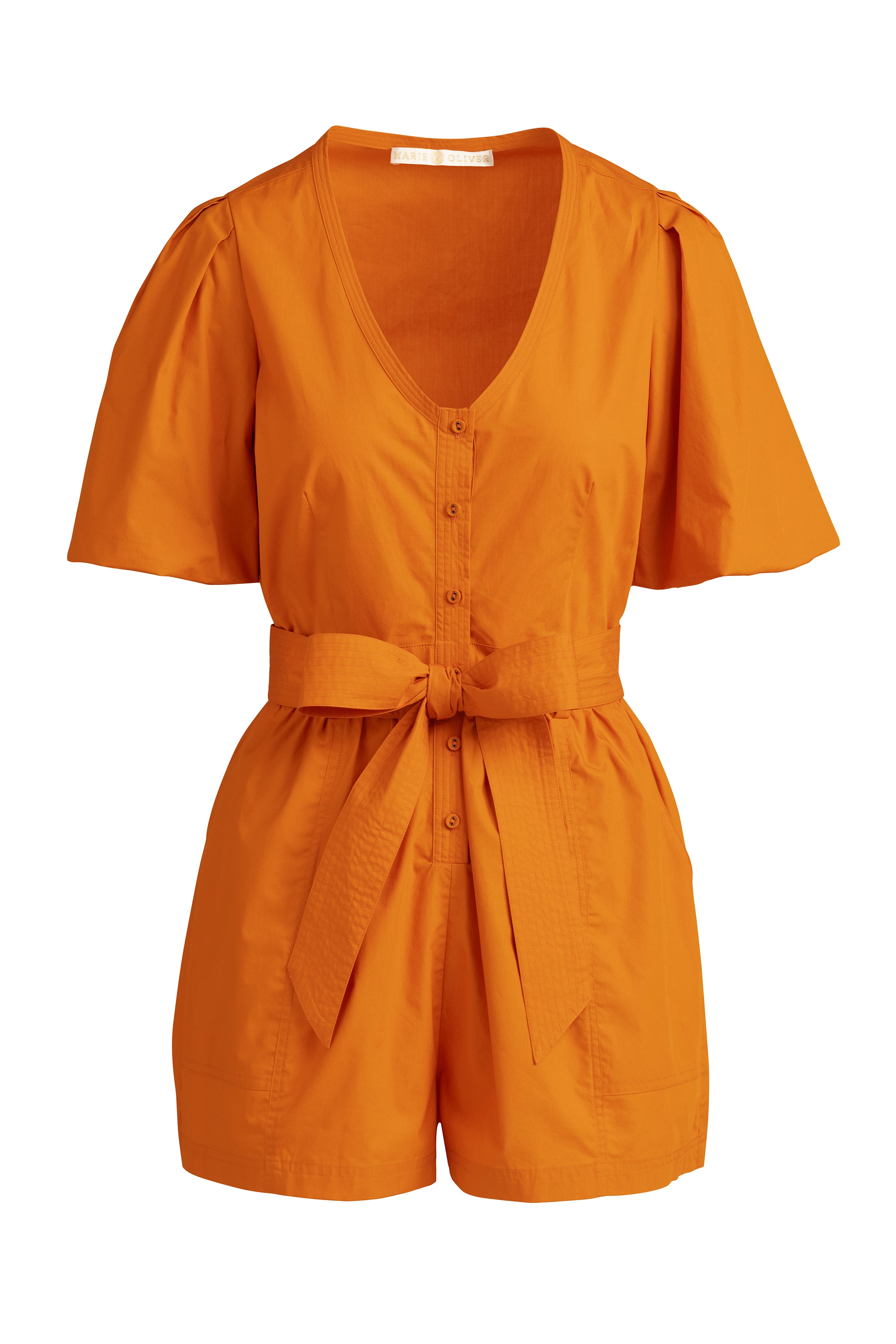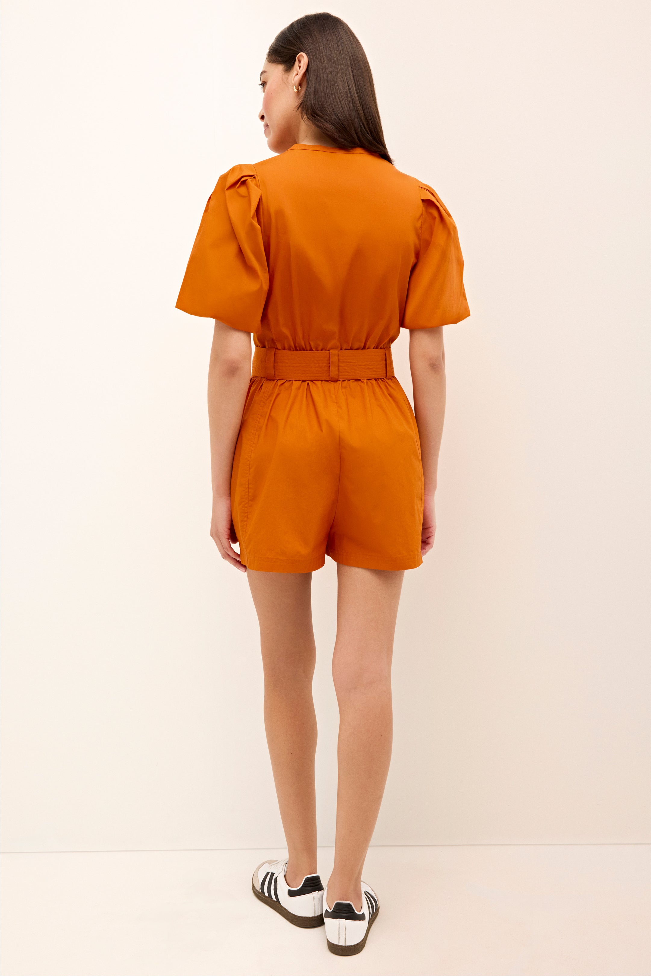 The ease and pulled-together appeal of a great dress meets the comfort of a pair of well-constructed shorts in our Devin romper. A repeat bestseller, Devin has tailored details like a pretty scoop neck, puff sleeves, and trapunto stitching along the sash belt. This season, the signature silhouette is updated in game day-ready solids, and ready to hit tailgates in style.
