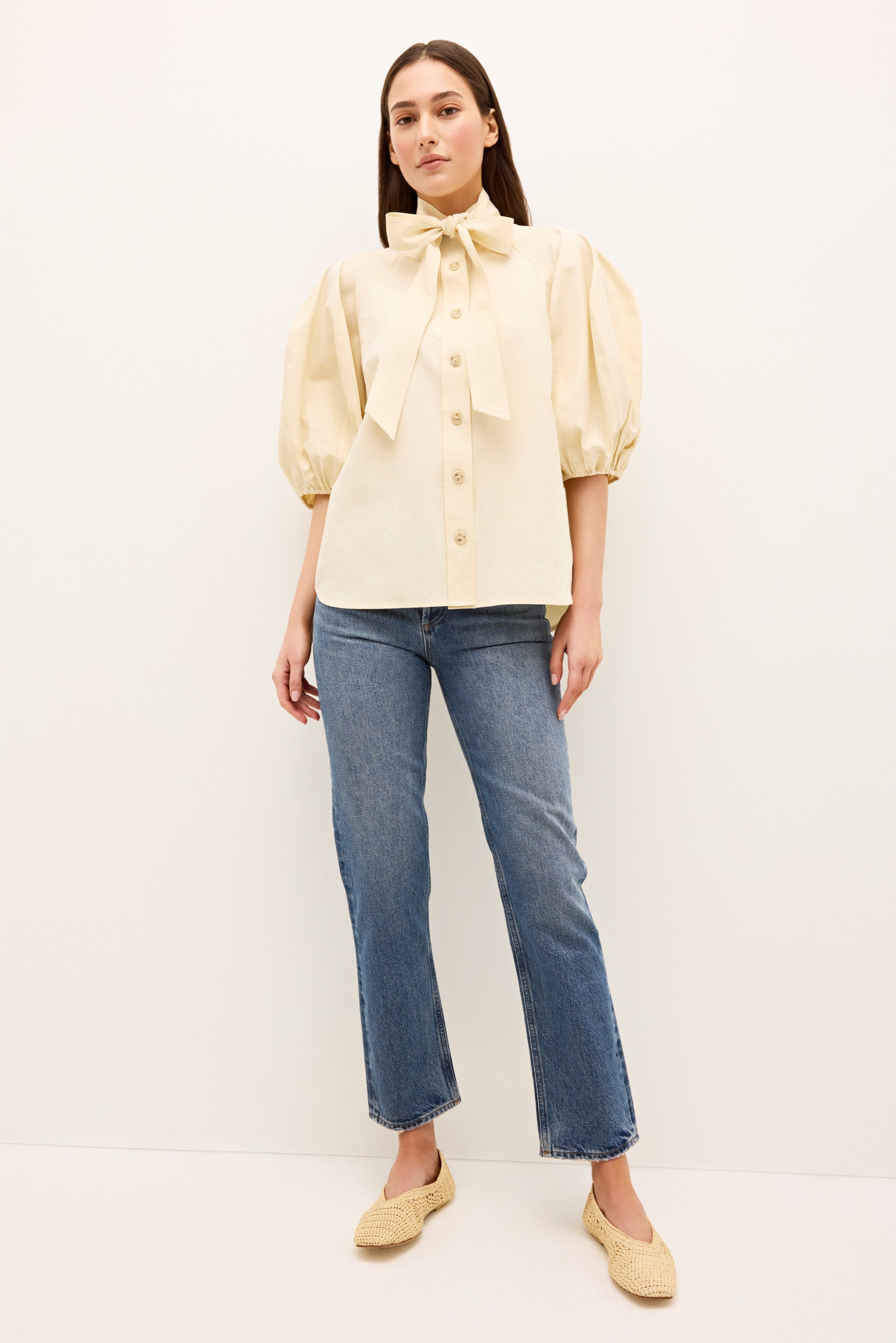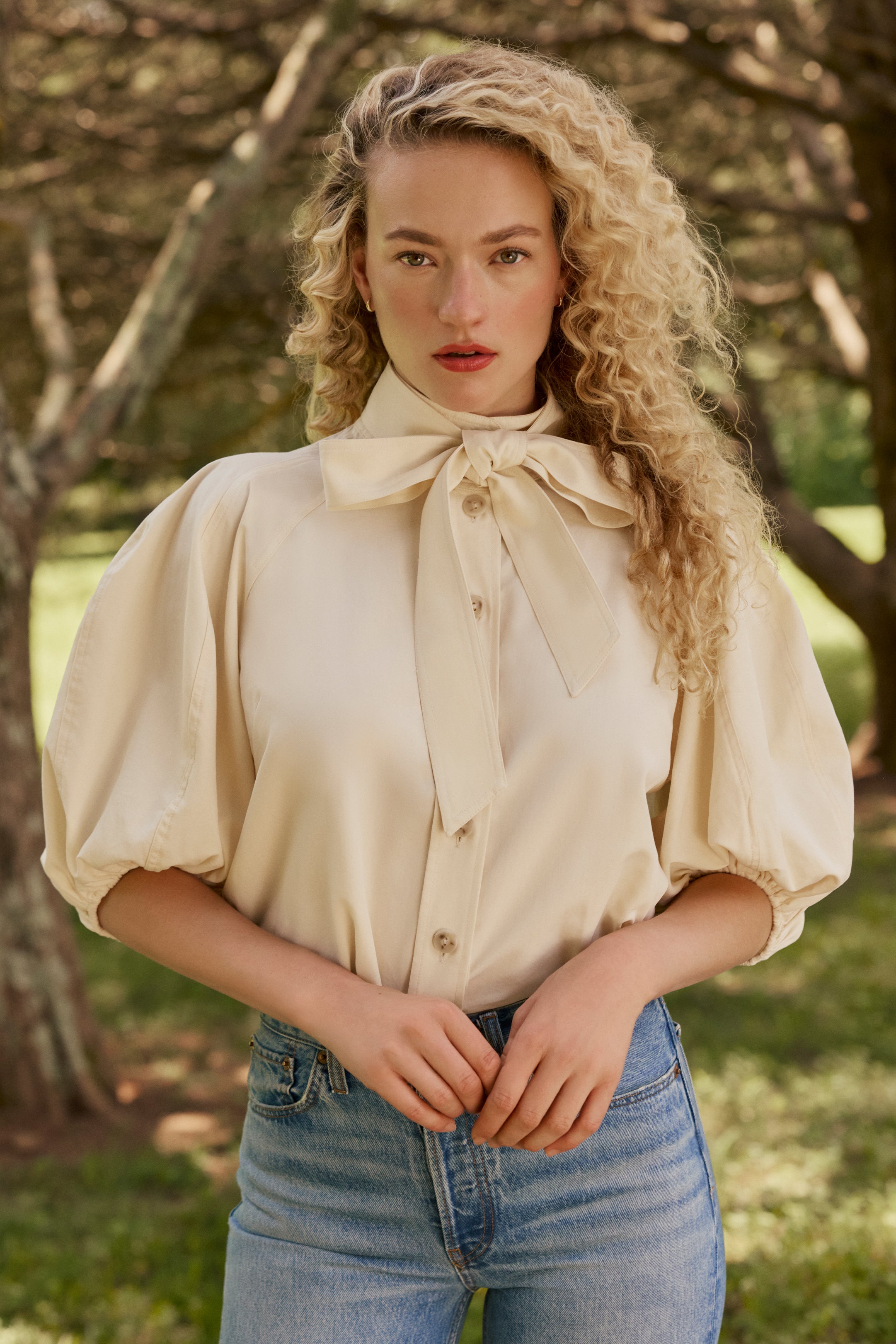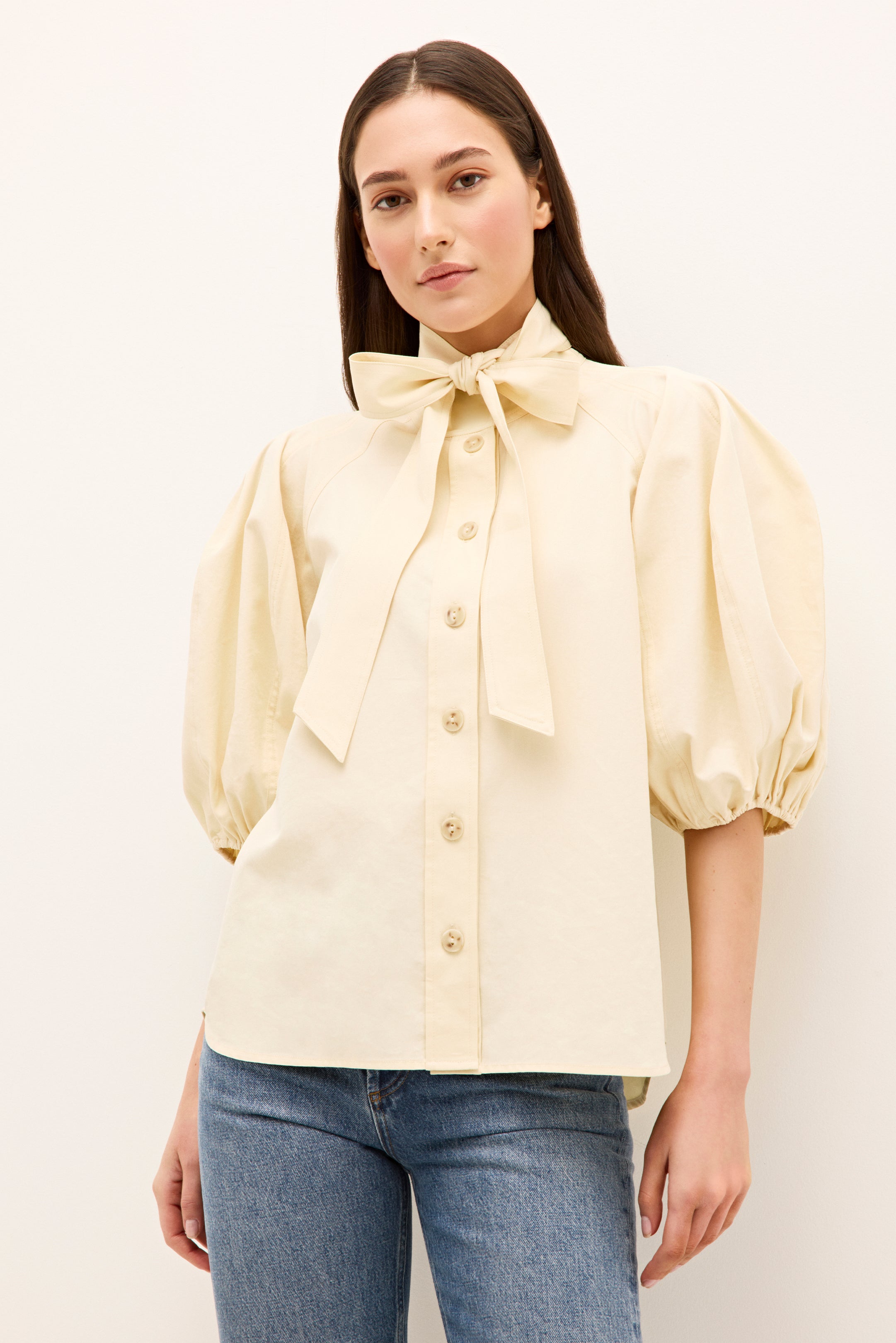Paired with your favorite blue jeans, our new creamy Navi top adds a touch of femininity to a classic off-duty look. This stunning top features dramatically puffed sleeves, an optional tie at the neck, delicate stitch detailing, and a pretty button-front placket.