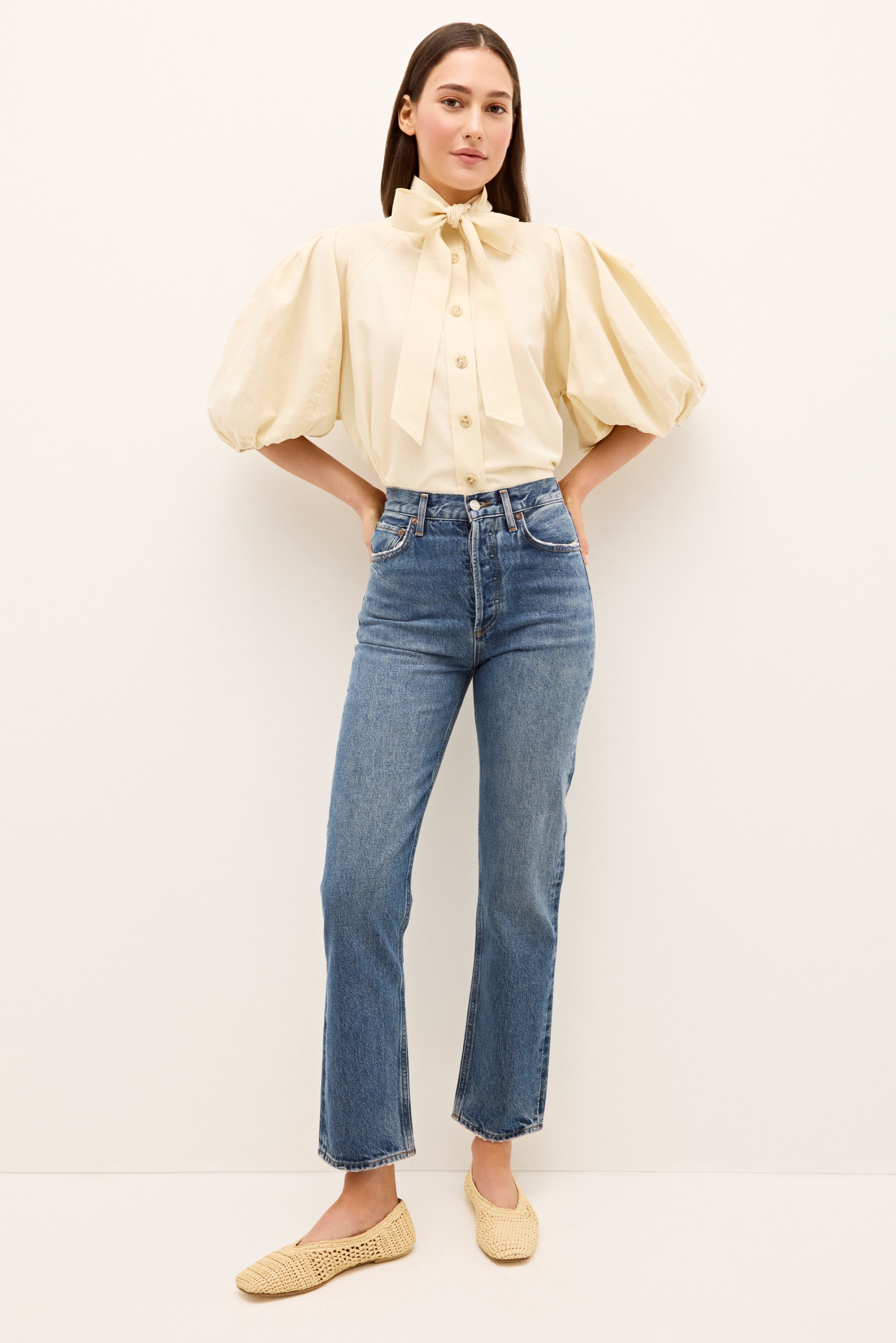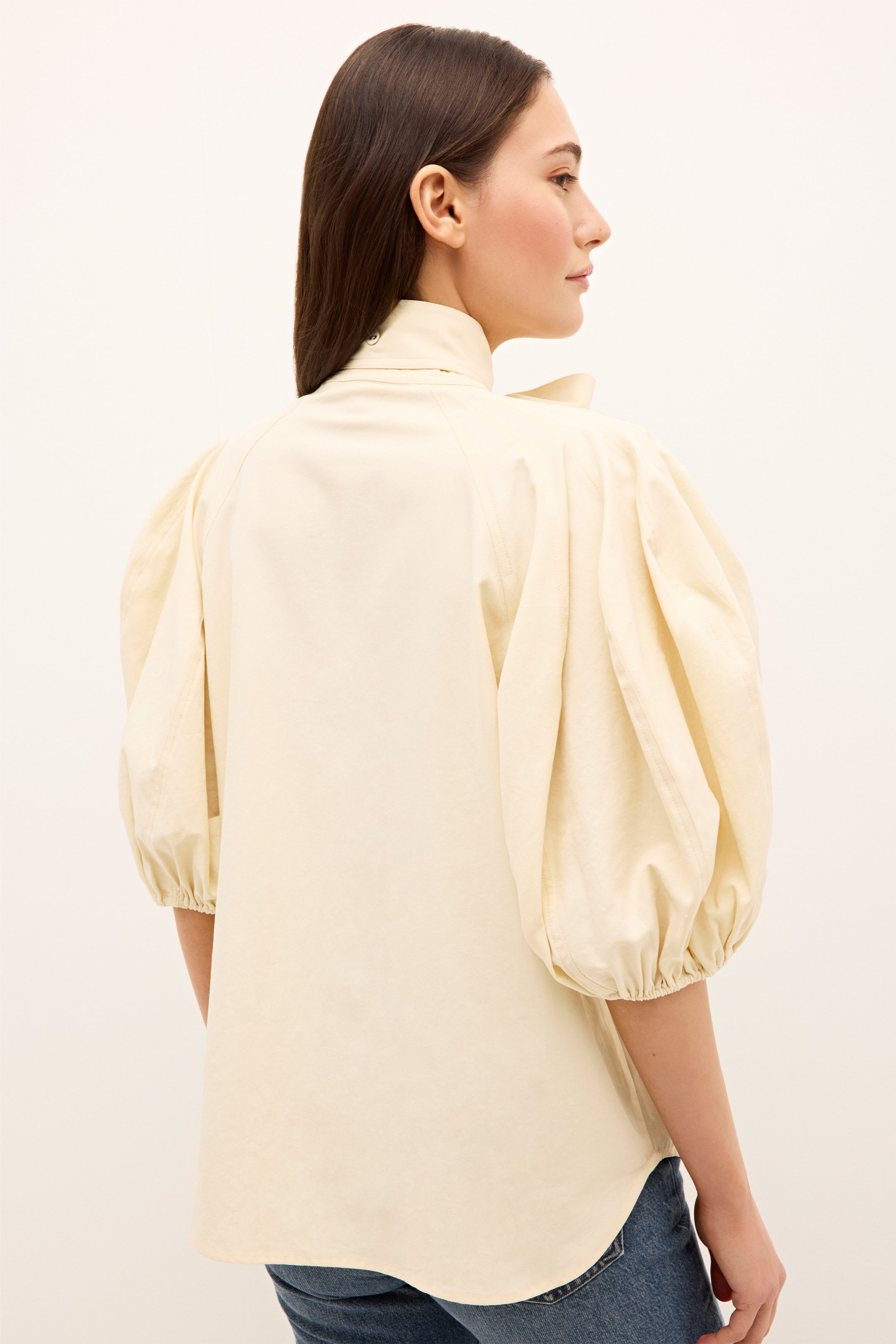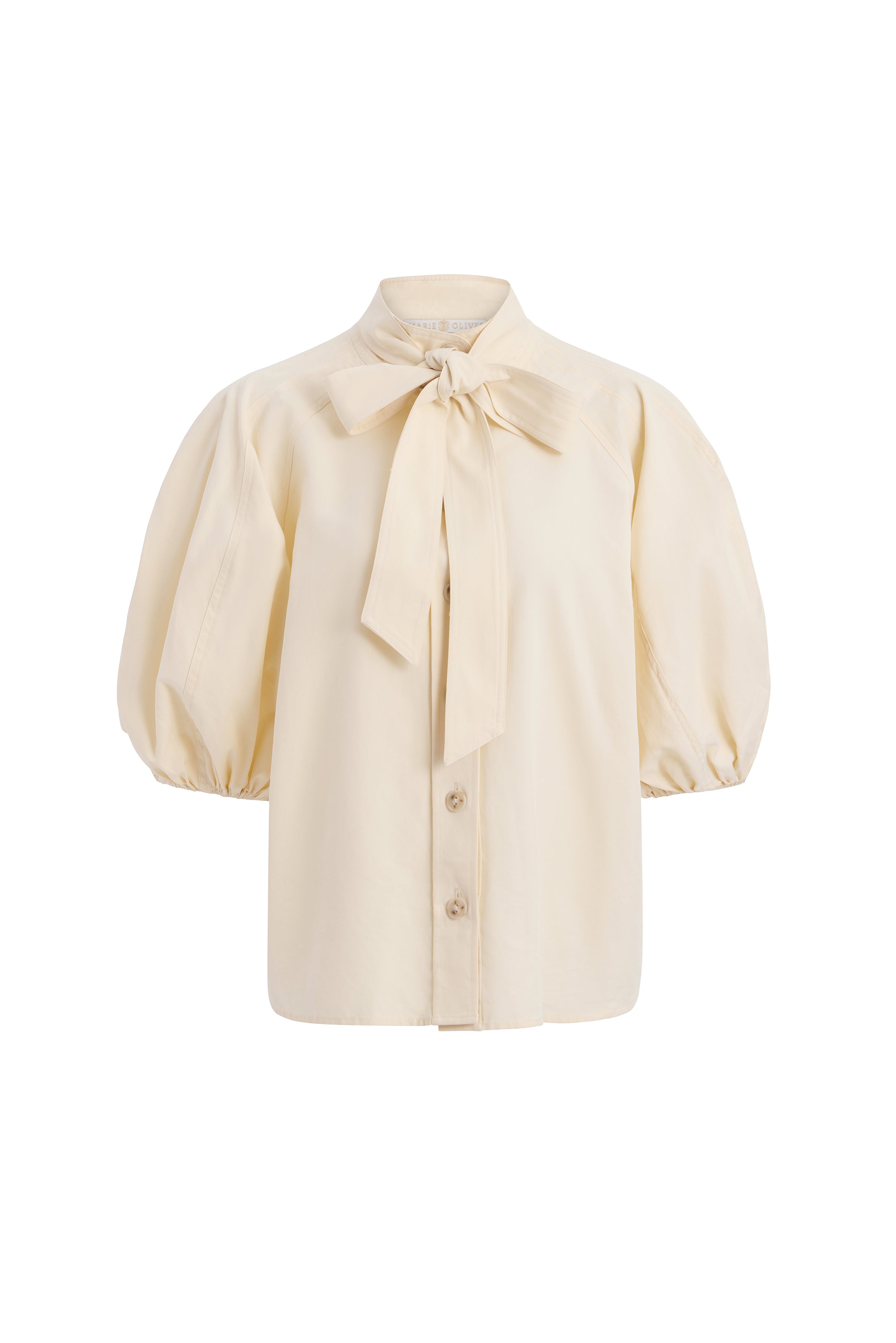 Paired with your favorite blue jeans, our new creamy Navi top adds a touch of femininity to a classic off-duty look. This stunning top features dramatically puffed sleeves, an optional tie at the neck, delicate stitch detailing, and a pretty button-front placket.