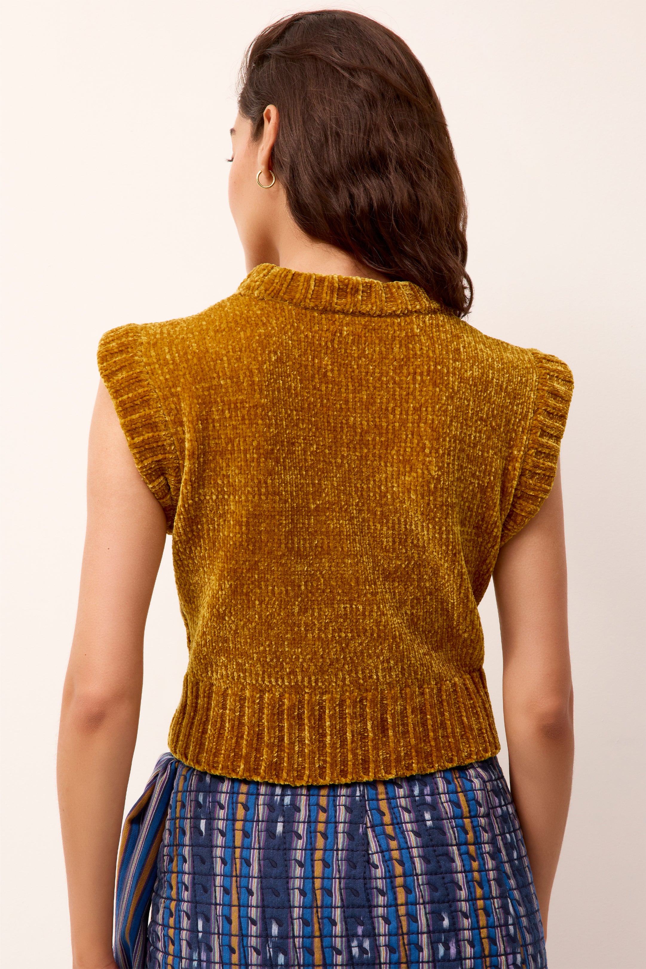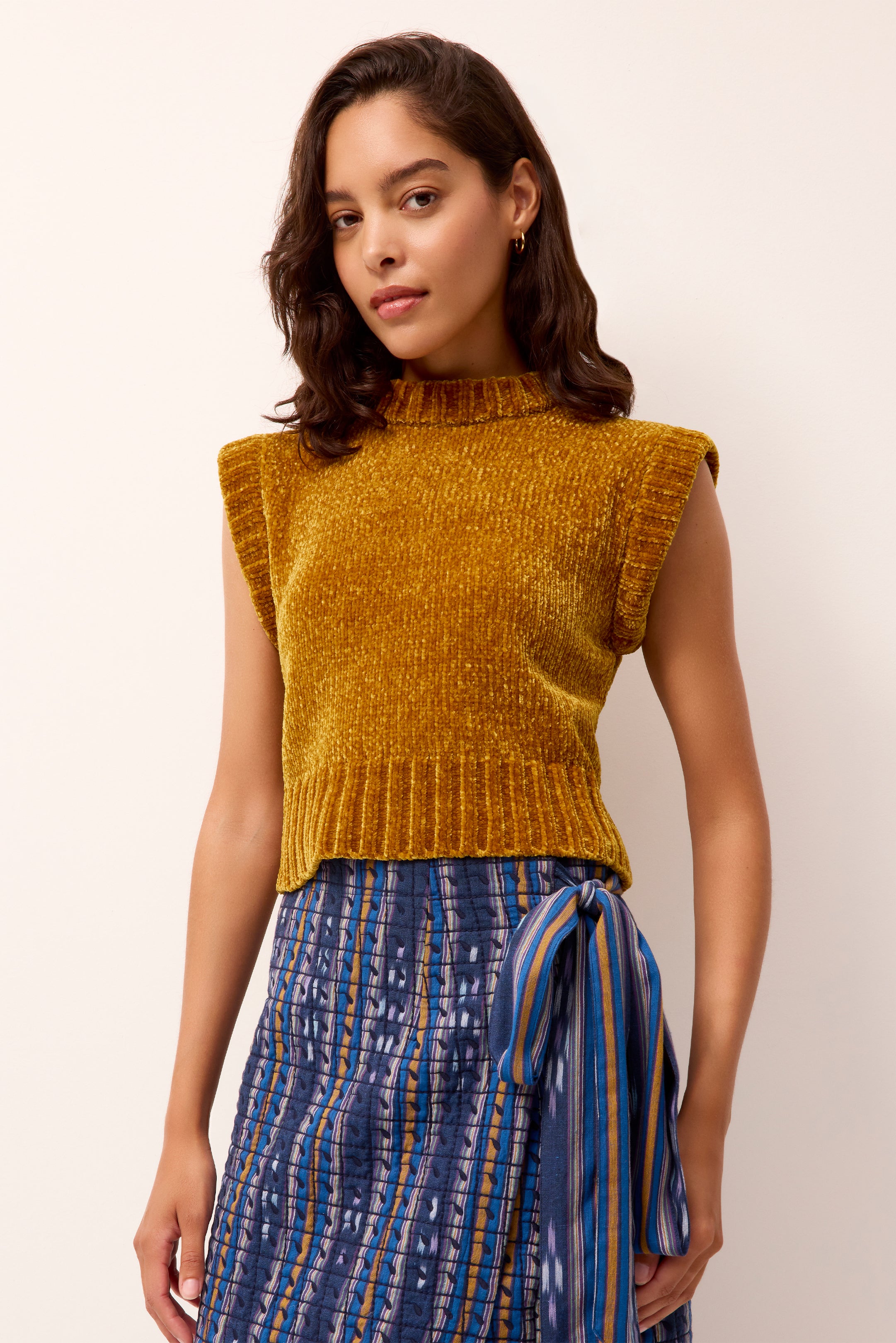 The combination of the golden Biscotti color and soft chenille knit fabric is a winner for our new Presley shell. Add texture and warmth to your favorite separates, including our new Sandra skirt in Ikat.