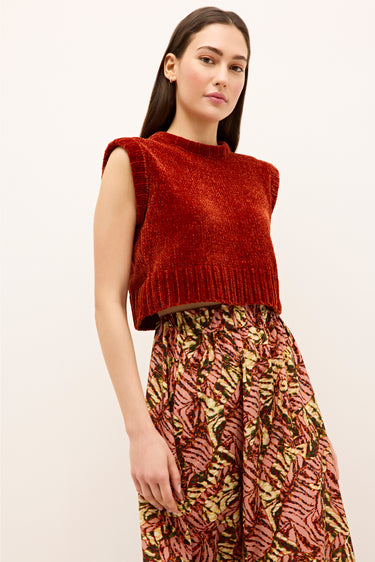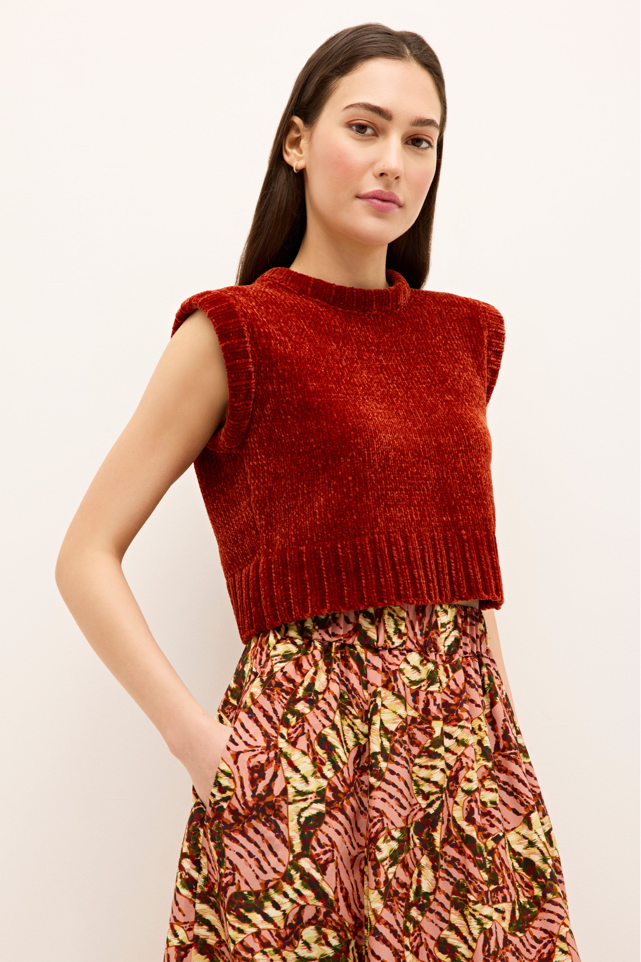 The cropped, color-soaked mockneck of your dreams is crafted in a soft chenille for style that feels as good as it looks. Its easy, slip-on silhouette layers over high-waisted bottoms like the Sasha skirt in Lynx, creating an outfit as casual or elegant as the pairing of choice. Our rich Nutmeg colorway gives it a boldly fall attitude that you’ll reach for time and time again.
