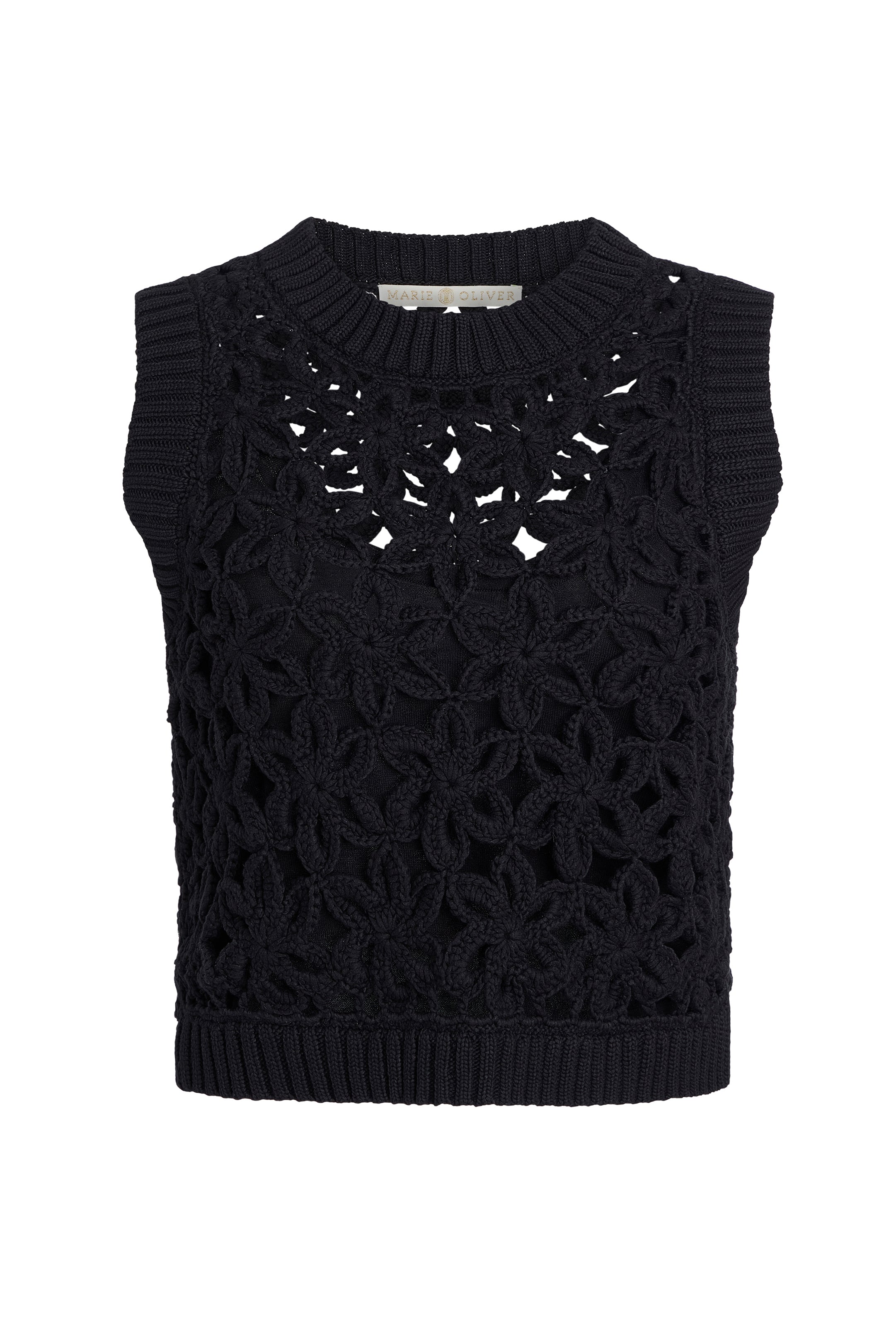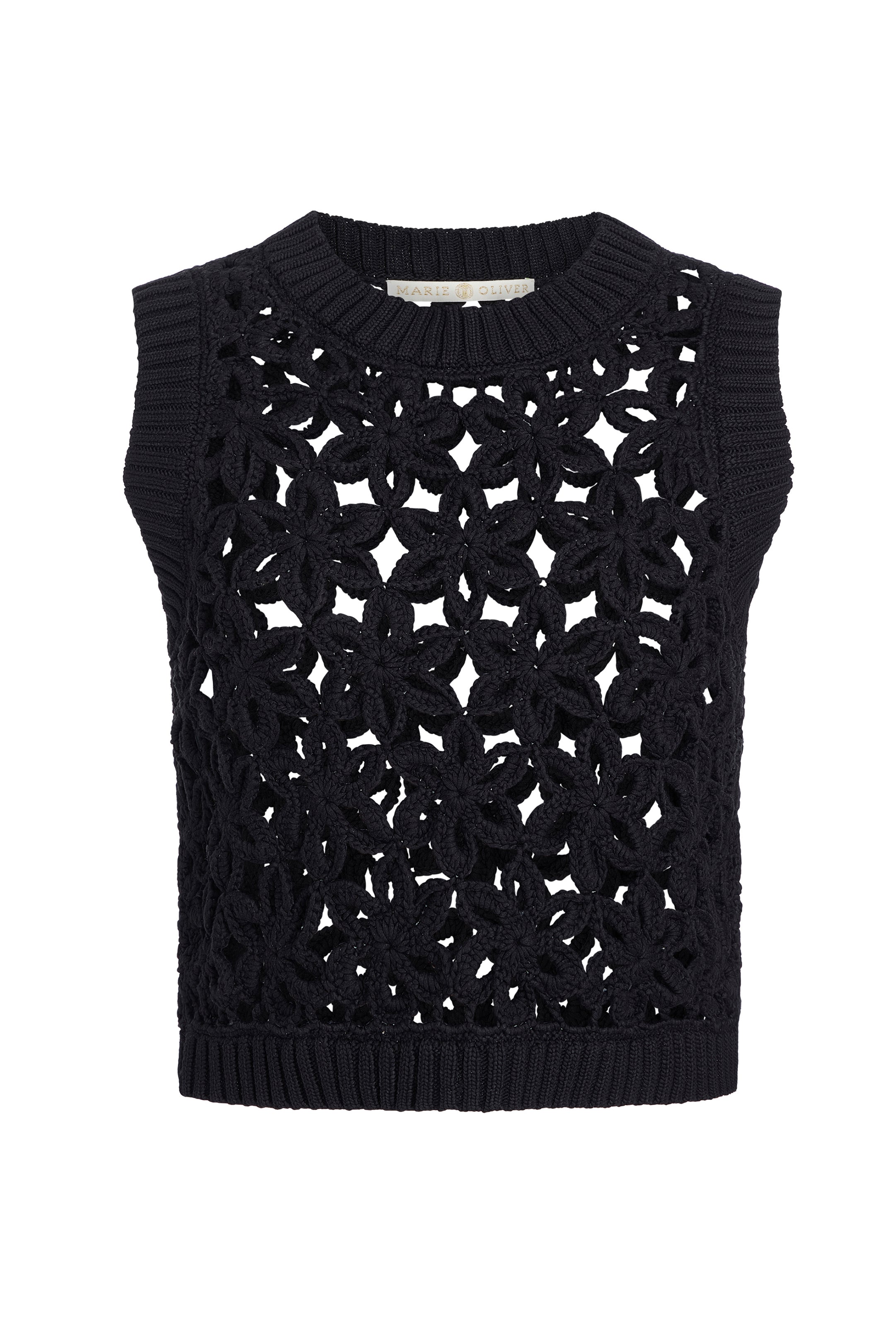 Our design team loves a classic black top, but this crochet shell is a timeless favorite. The chic silhouette features a cropped figure-skimming fit, a cotton tank liner, and a gorgeous floral overlay. Thea is styled here with our Christie skirt in Tourmaline for an exuberant set that crosses the seasonal divide.
