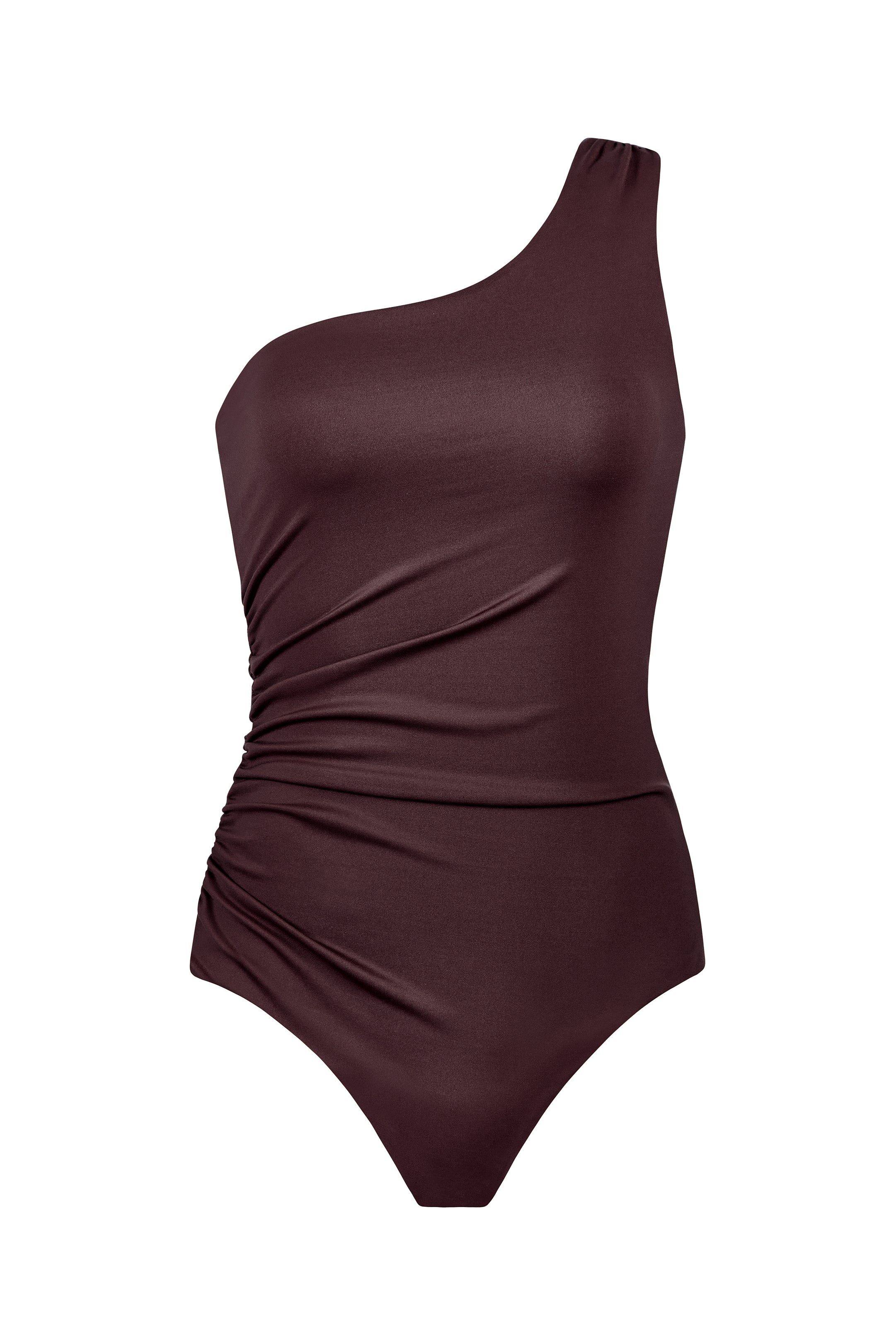 Flattering on nearly every body type, our Lonita one-piece features ruching up the right side of the classic shape, underscoring the swimsuit’s unfussy yet elevated aesthetic. The elegant new style is pictured here in our Walnut solid, a rich dark brown that reads nearly black.