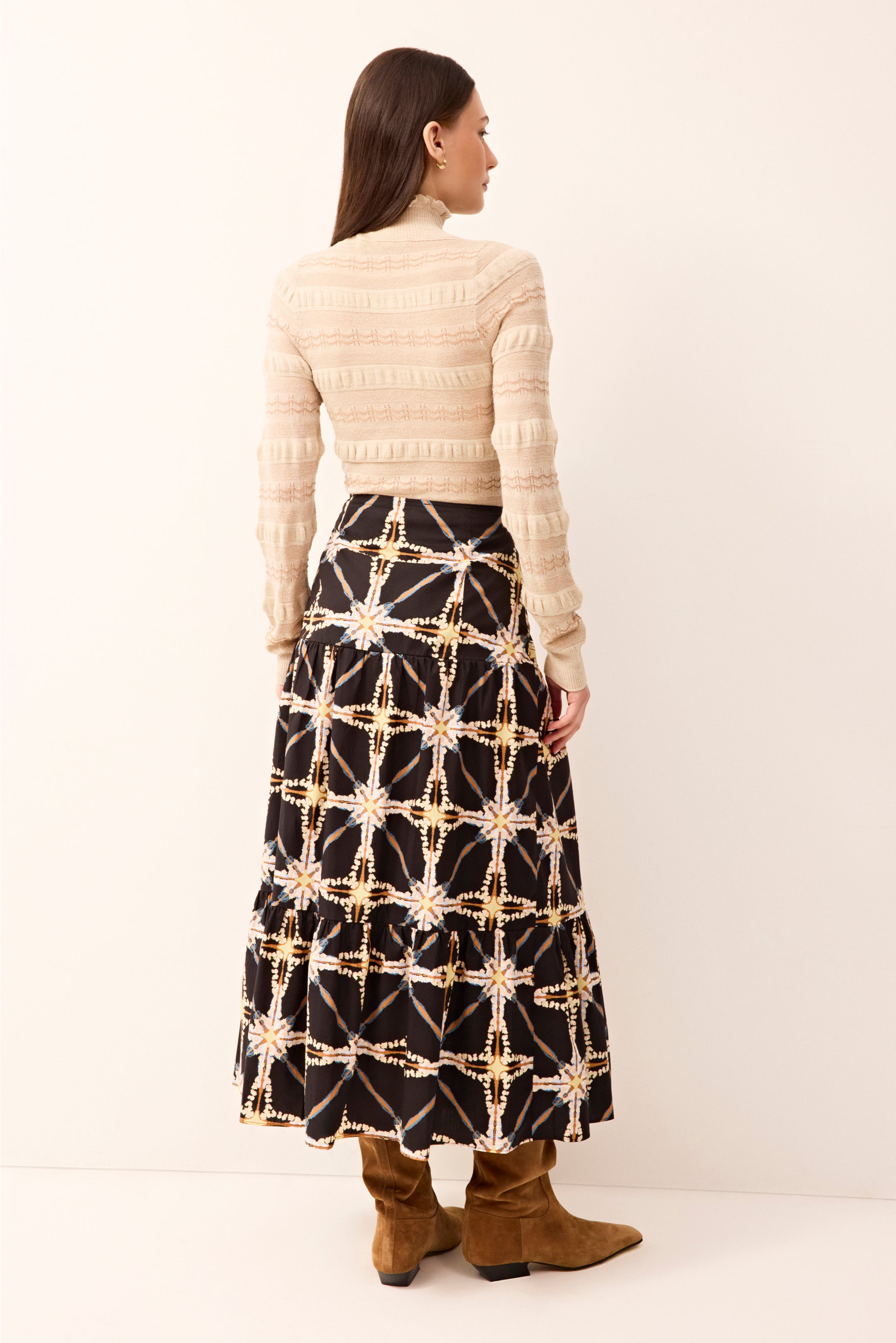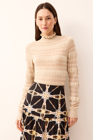 A new neutral with classic tastes, your favorite body-skimming turtleneck gets a feminine upgrade with allover ruffle details, plus a delicate pointelle knit woven with metallic yarn for a subtle shimmer. The Buff colorway allows for a slew of complementary separates to complete the outfit, including the Hines skirt, balancing seasonal sweetness against autumnal hues and differing textures.