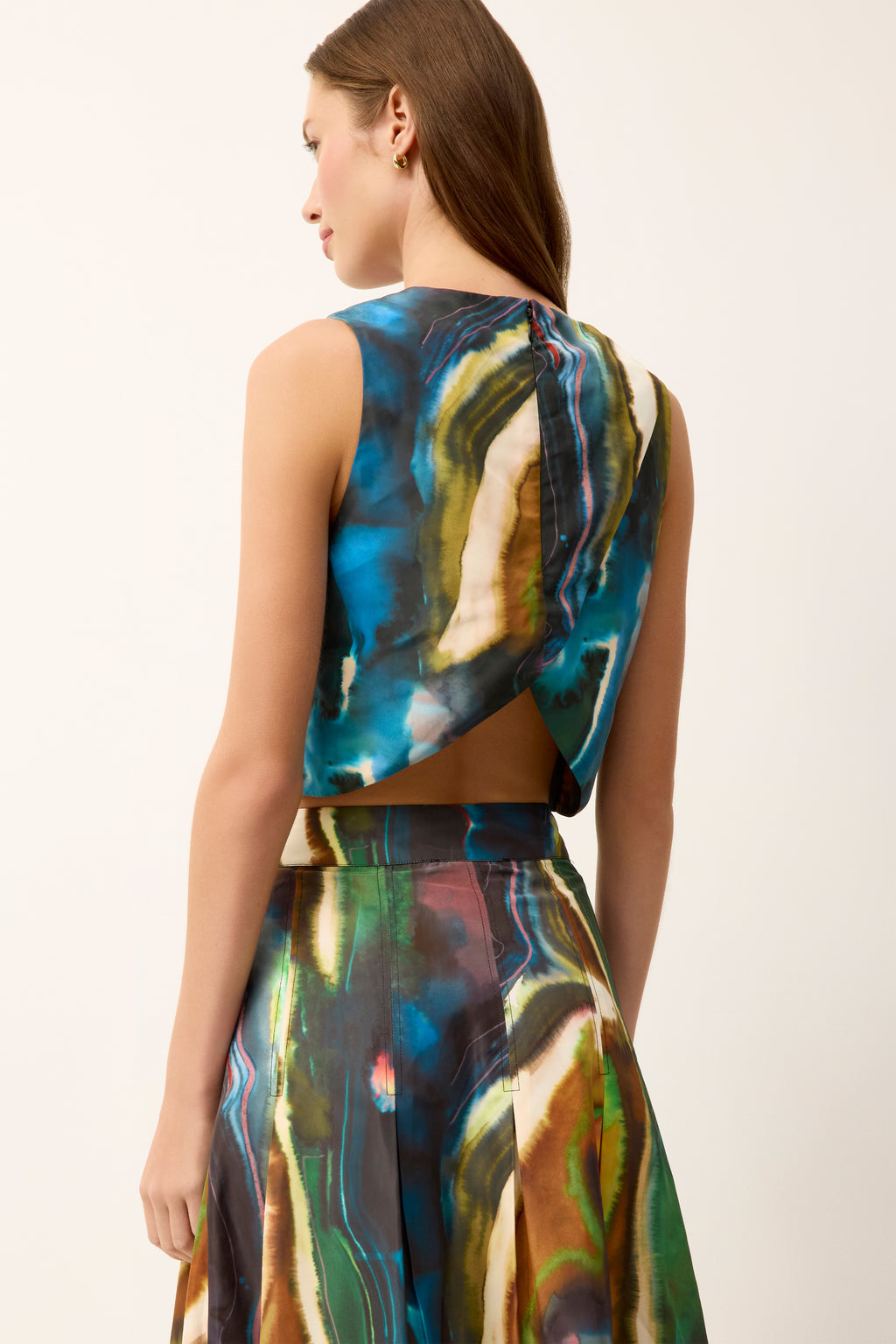 Faith is a tailored midi skirt defined by a fixed waistband and feminine box pleats that add movement and a slight flare. Shown here in our new Delta print, a moody swirl of striated color in an autumnal palette, Faith is styled with our staple Tinley turtleneck in classic black for a timeless pairing.