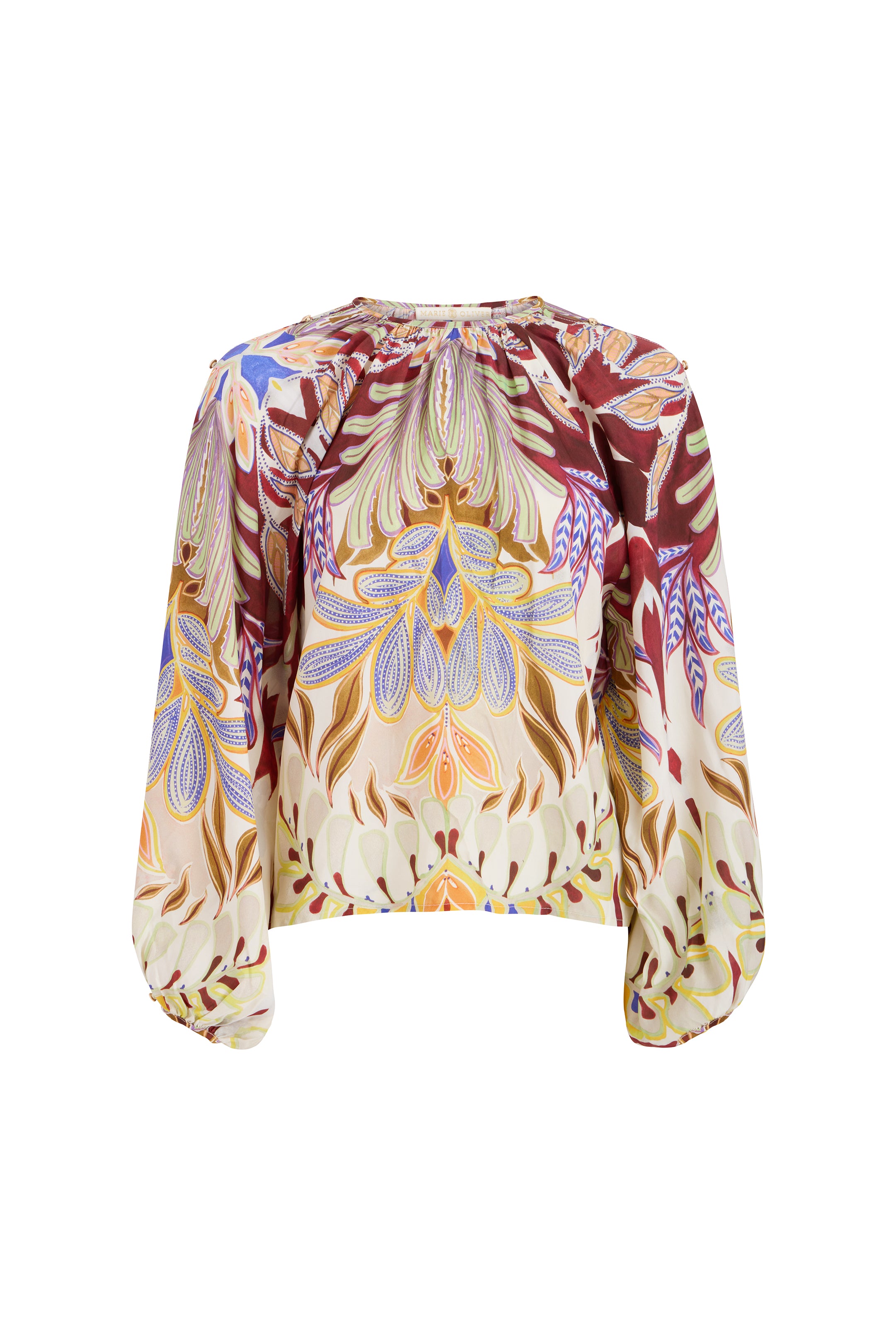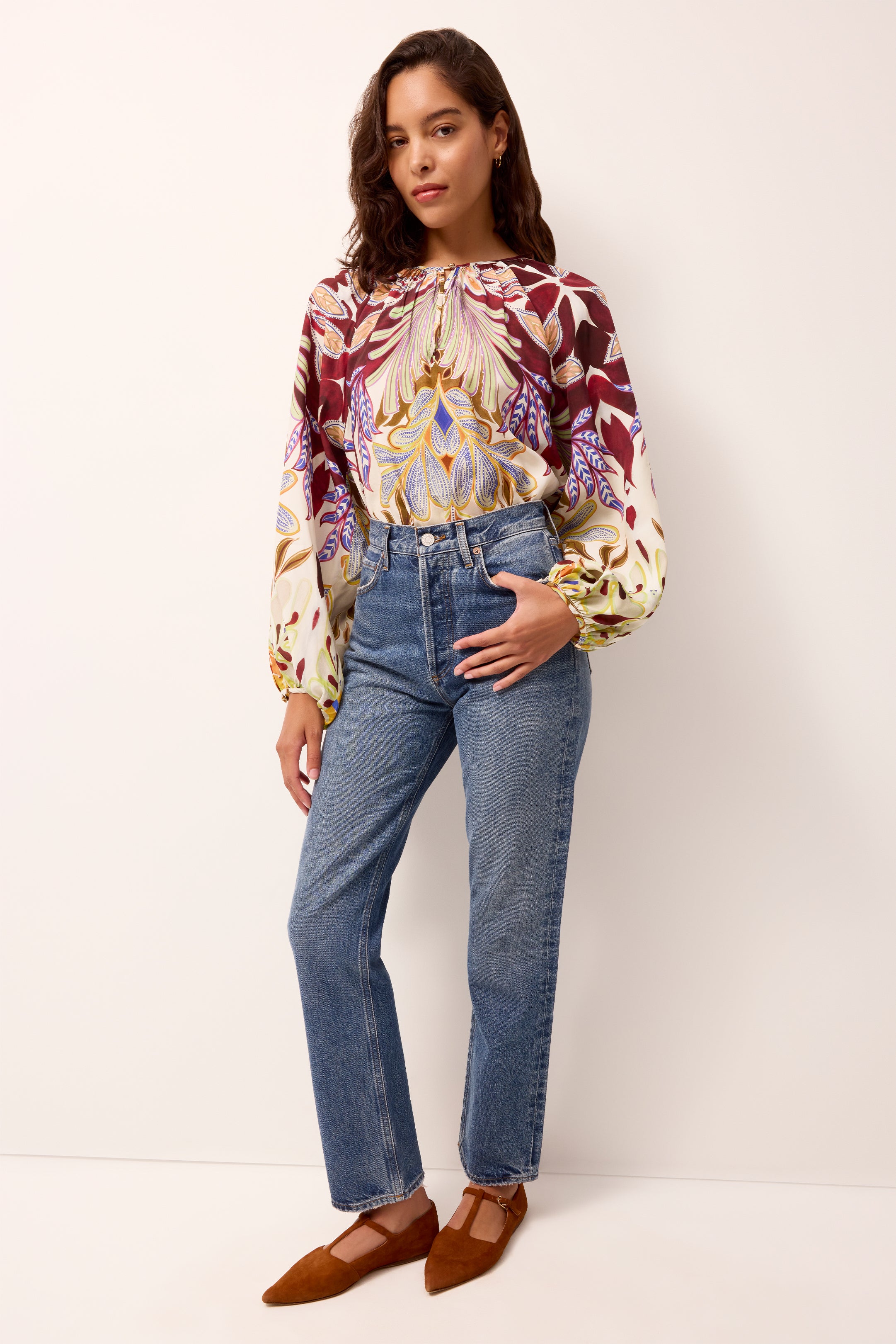 Elevate your favorite denim with this colorful, long-sleeve top. The elegant slip-on silhouette’s simple lines are the perfect canvas for our dramatic Tranquility placement print.