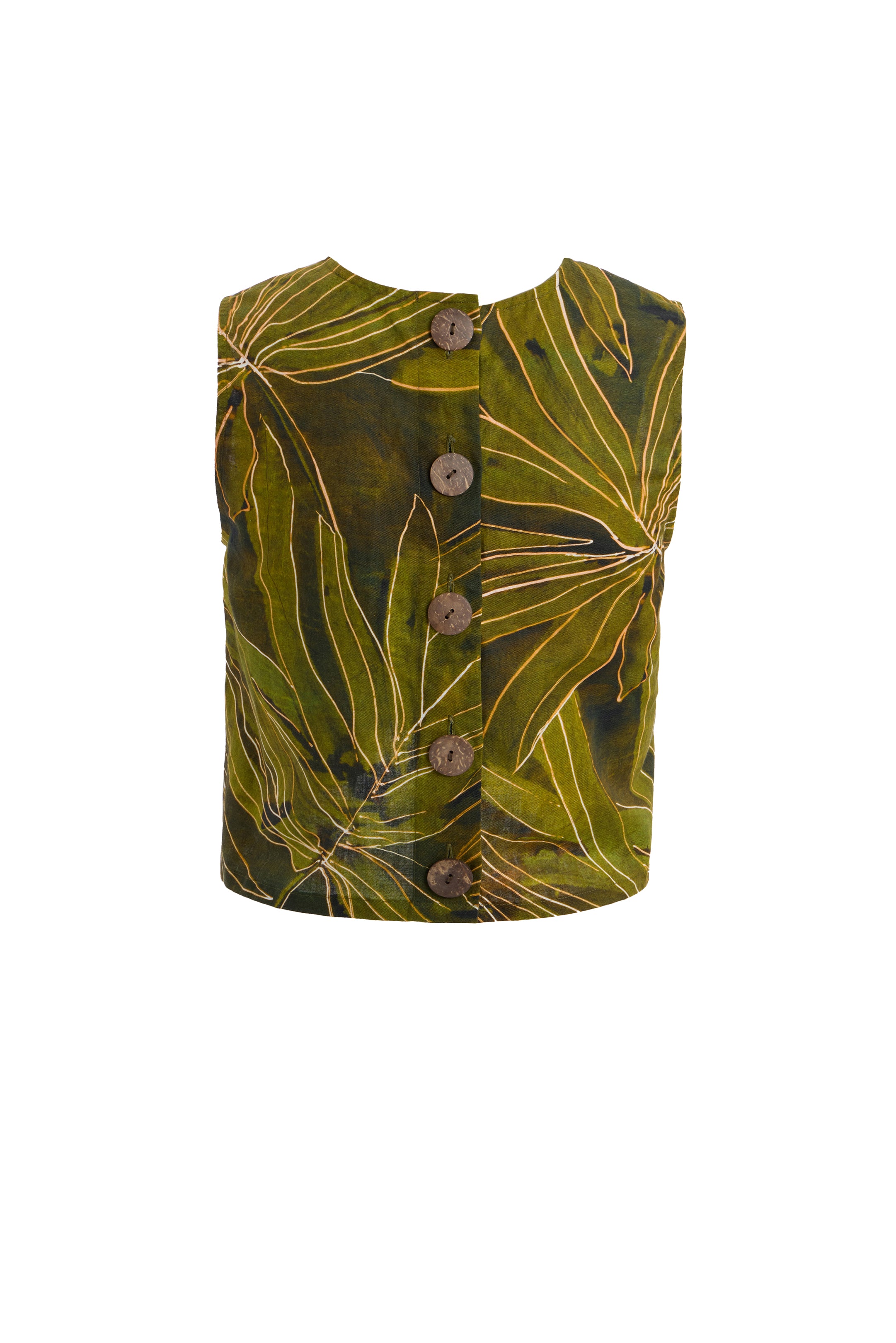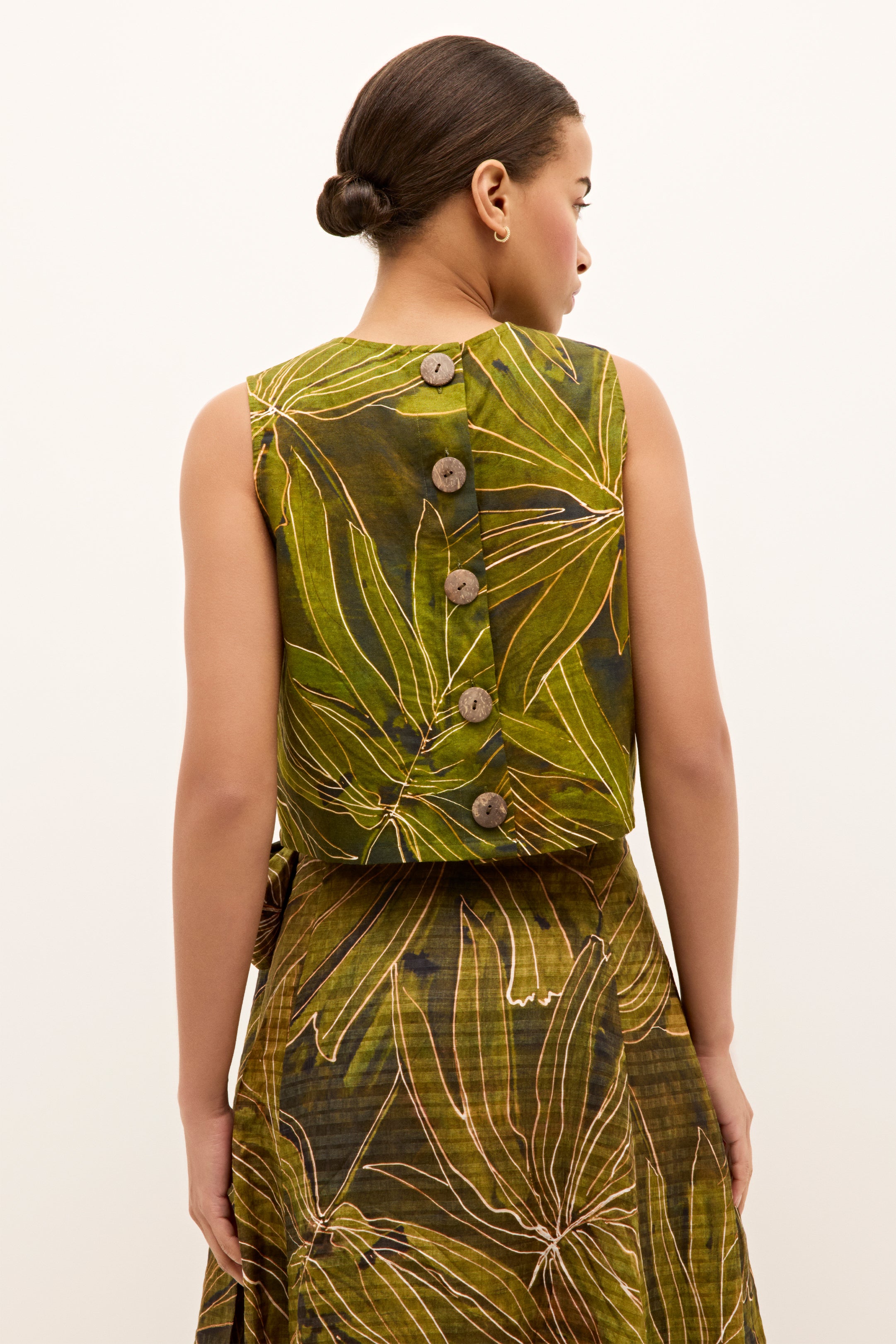 An olive green allover palm print gives this cropped linen shell a moody autumn makeover. Style Fallon with our matching Estine wrap skirt for one of our design team’s favorite fall looks.