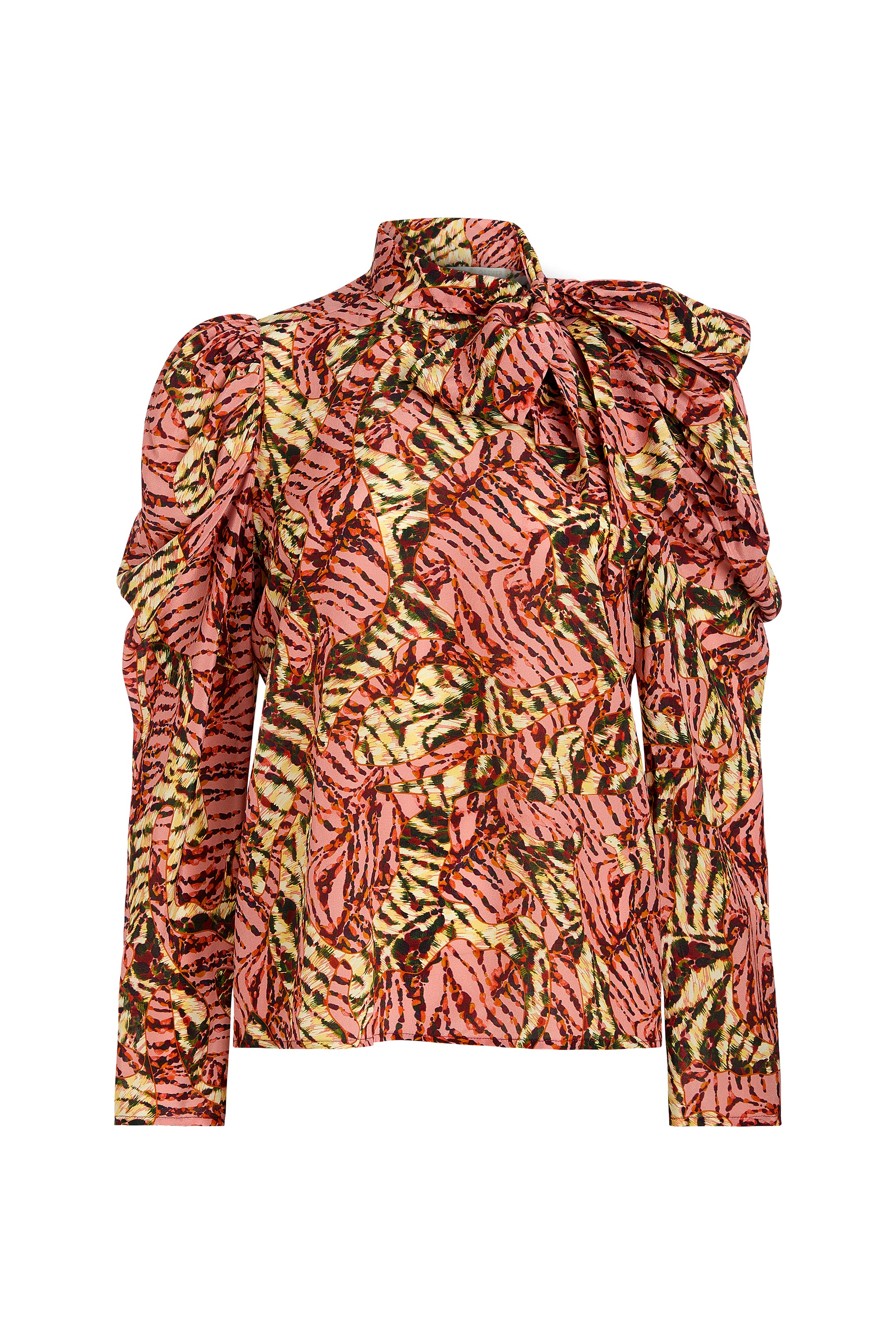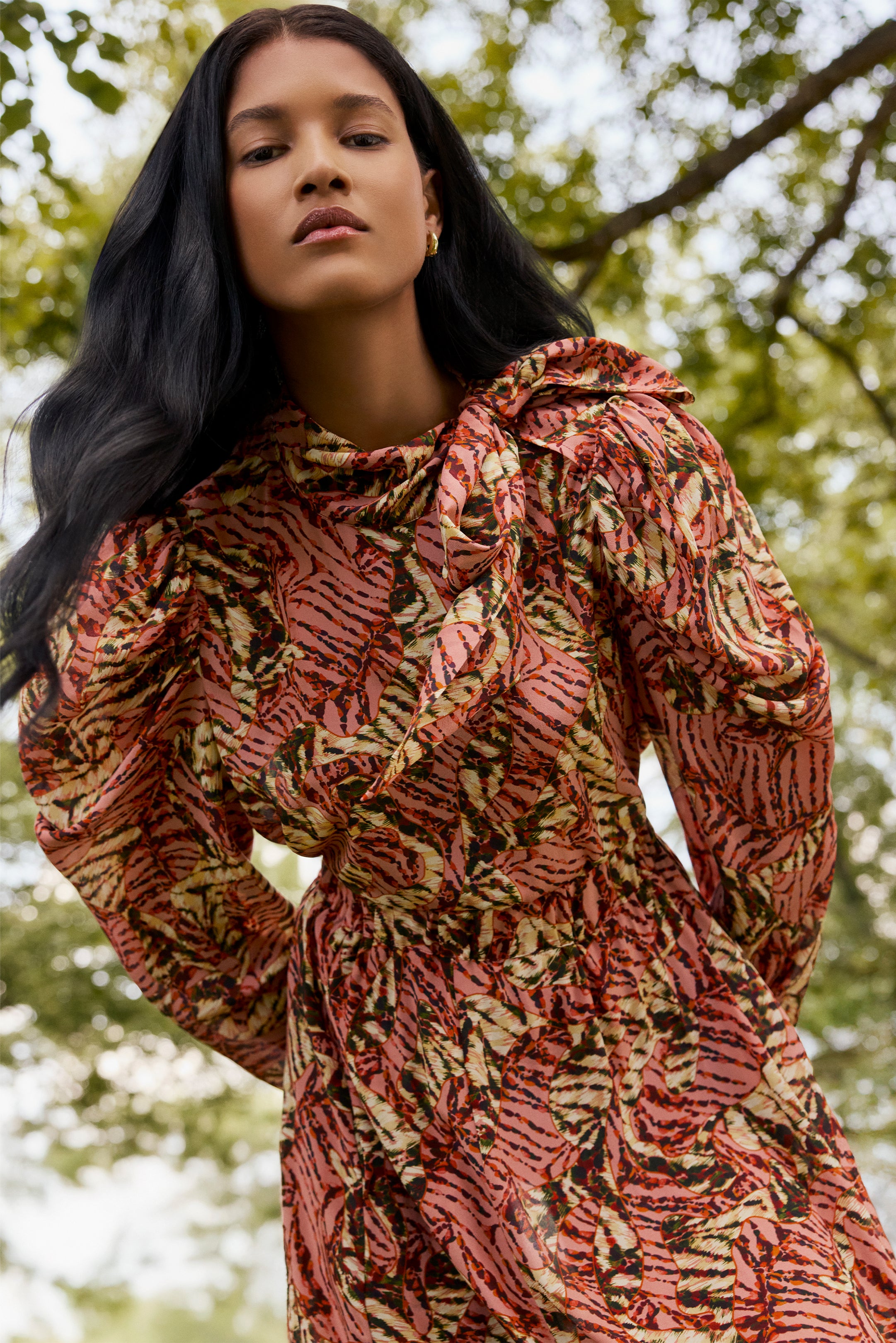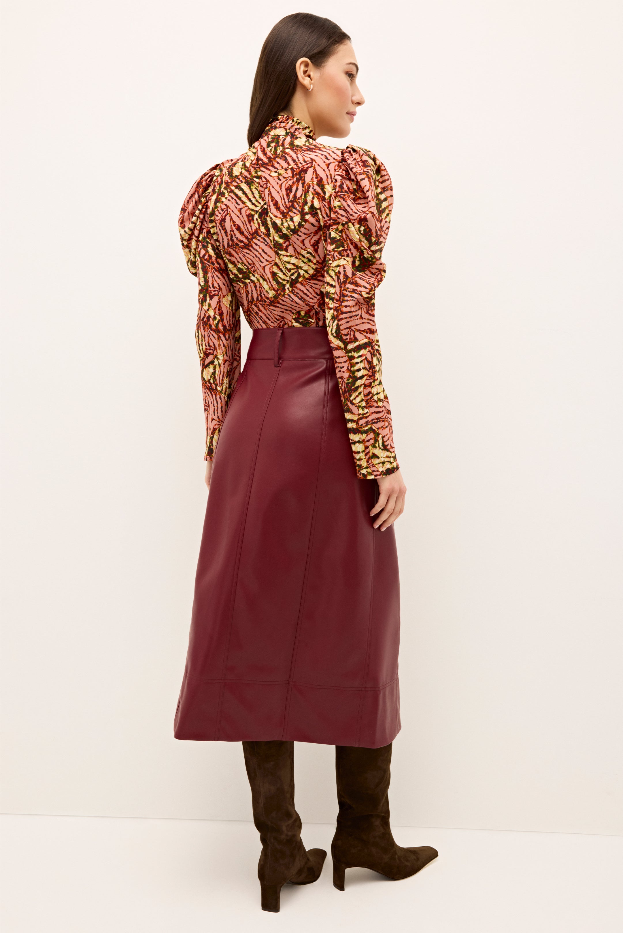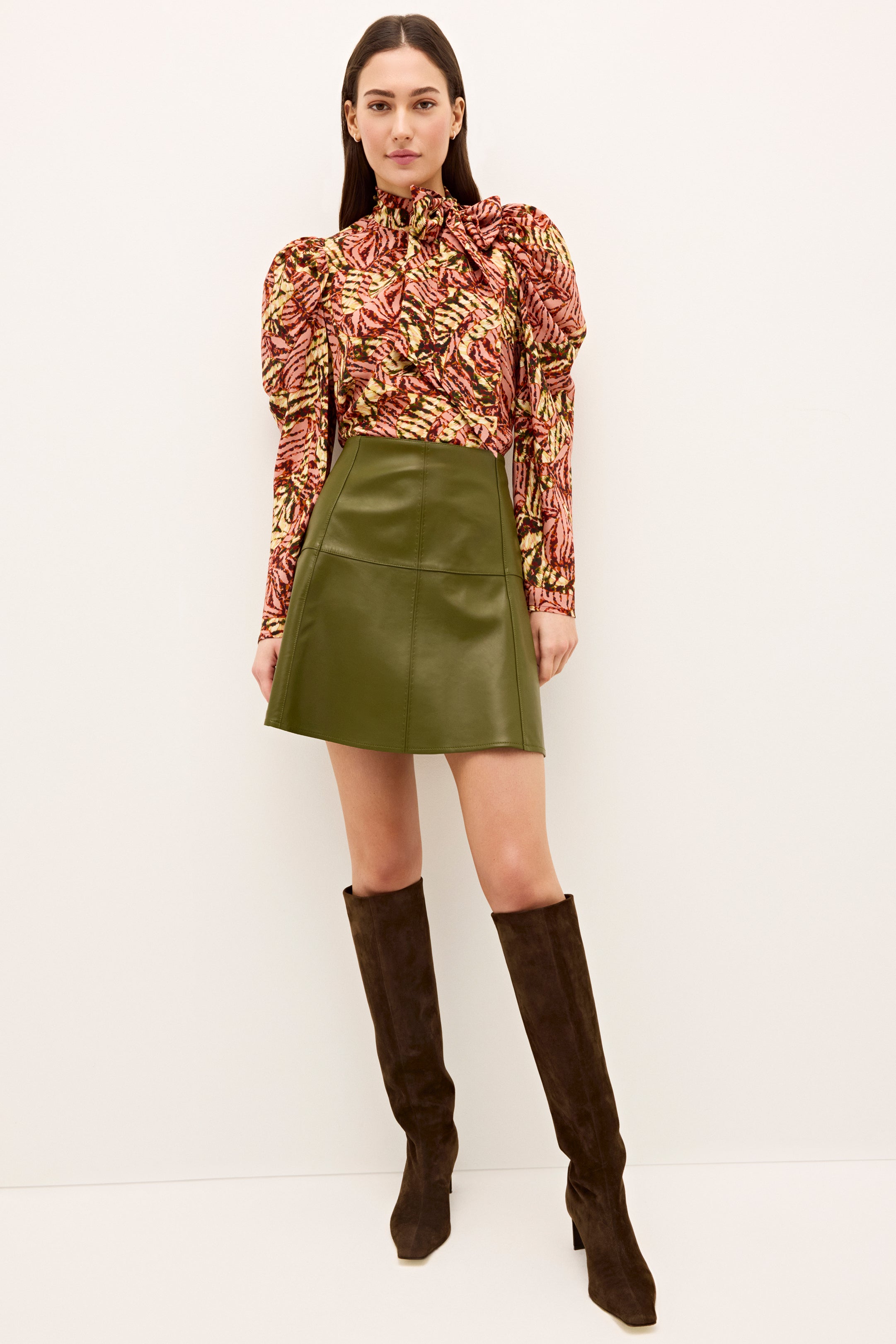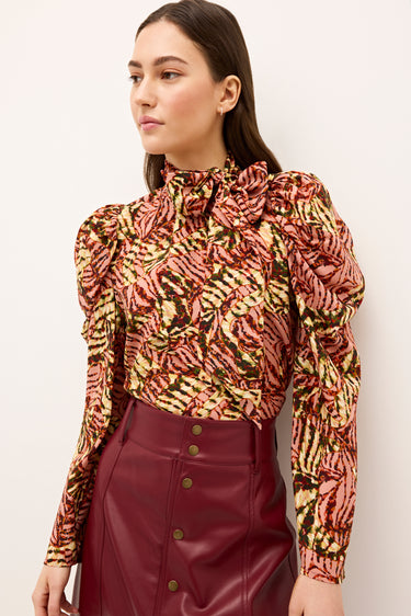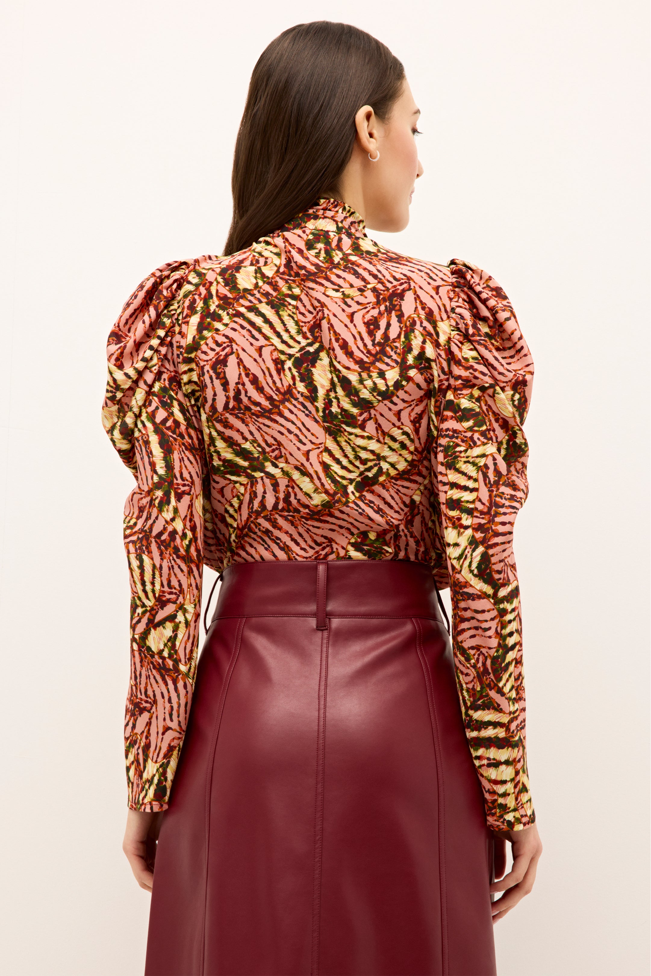 An edgier, slightly more contemporary take on the classic pussy bow blouse, Gabriella features tailored details like gathered cowl sleeves and a slip on silhouette. Its relaxed, sumptuous silk construction is only matched by the energy of our Lynx print that begs to be paired with our Chelsea skirt in Brick for daytime soirees, or the matching Sasha skirt for a statement set.