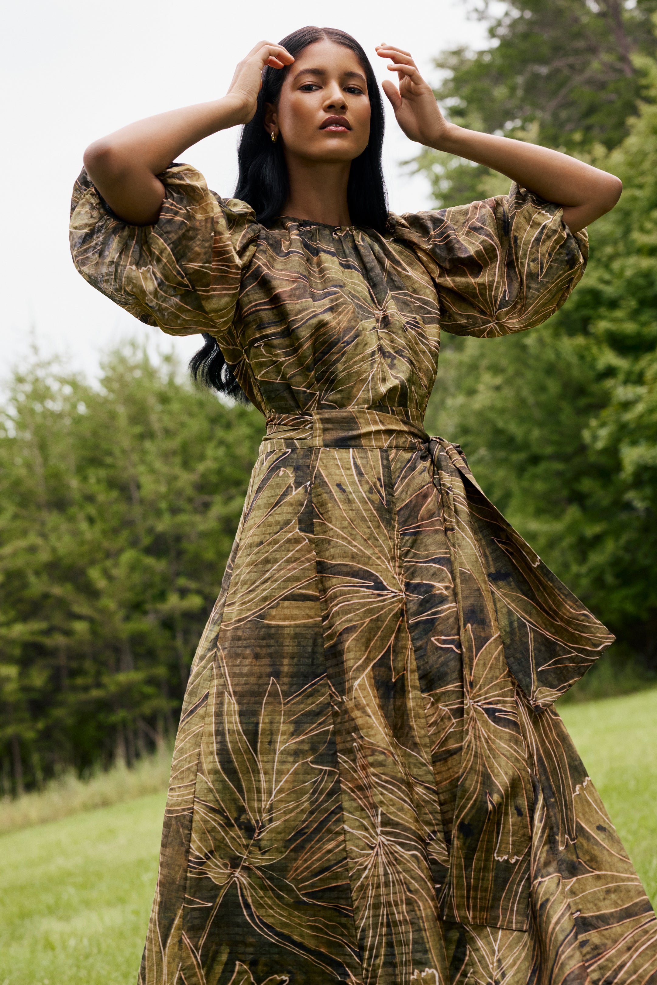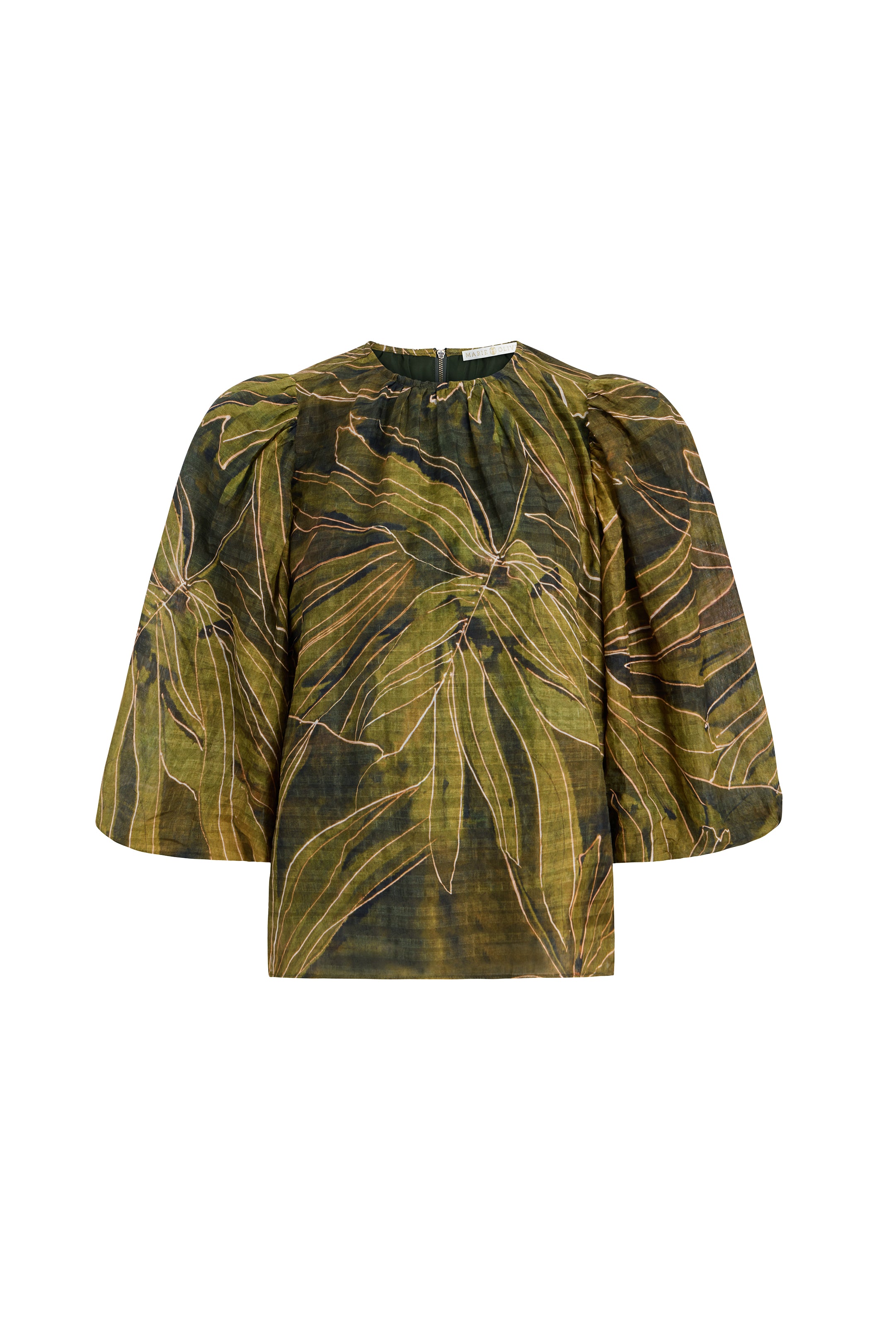 Harly is a fan favorite for its striking balloon sleeves and flattering gathered neckline, but the elegant top’s appeal is amplified by expert tailoring and subtly textured fabric. The slip-on style is pictured here in Canopy, a moody palm print in deep olive green. Pair it with our matching Estine wrap skirt for a signature fall set.