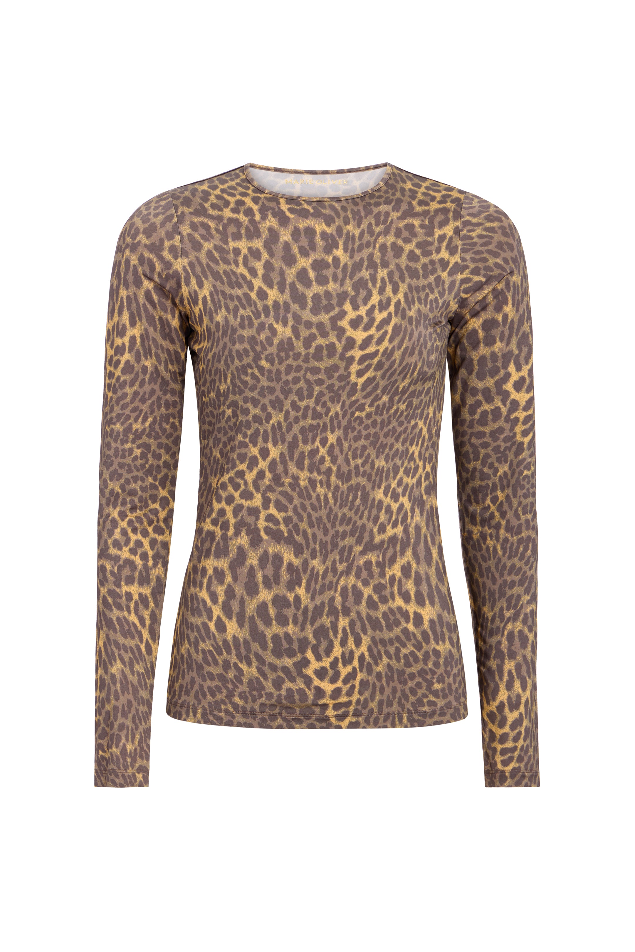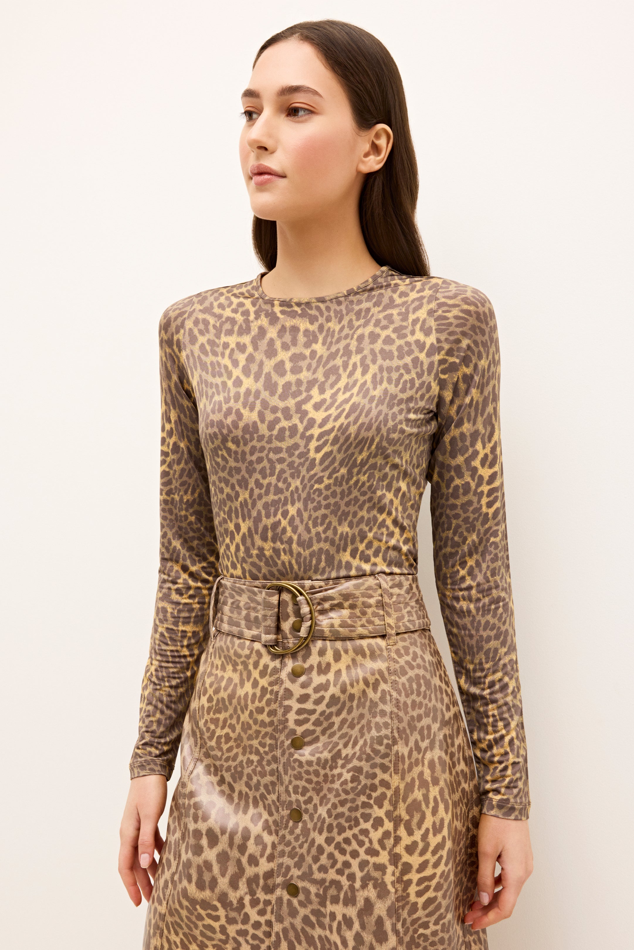 Hazel does a lot with a little. Soft and slinky, this fitted jersey knit top, features a classic crew-neck silhouette with our washed Leopard print. It's the kind of easy-to-pack piece that occupies minimal suitcase real estate but delivers maximum style. Beautiful tucked into your favorite pants and skirts, we love pairing it with the matching Chelsea skirt for a complementary set that's an Outfit with a capital O.