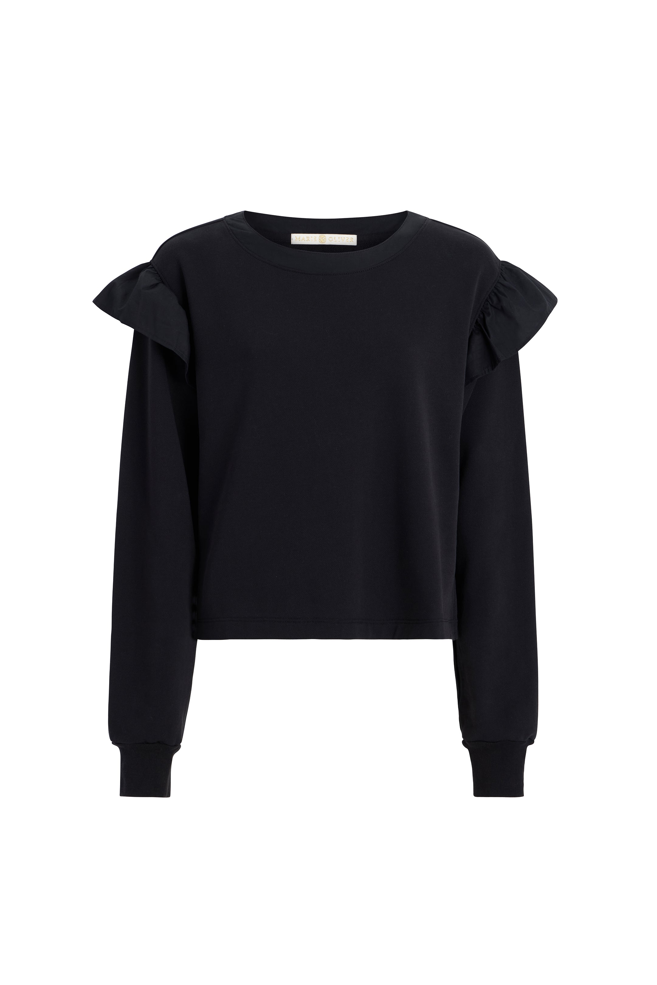 With a cotton poplin ruffle and French terry body, you can file this relaxed-fit sweatshirt under "elevated off-duty style." The fashion pullover is pictured here in a classic Black solid that works as well with matching knit Breck short and sneakers as it does your favorite denim and flats.