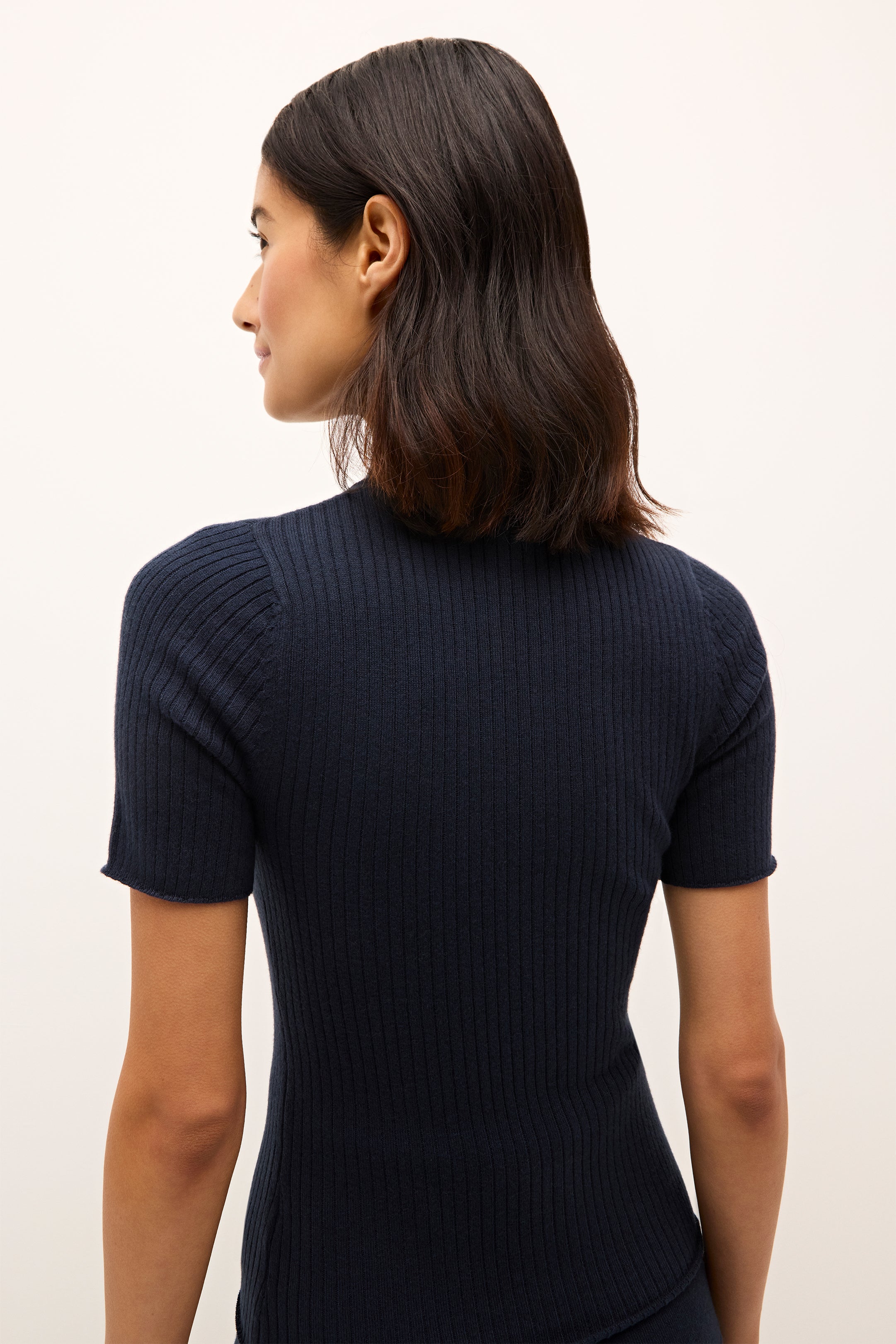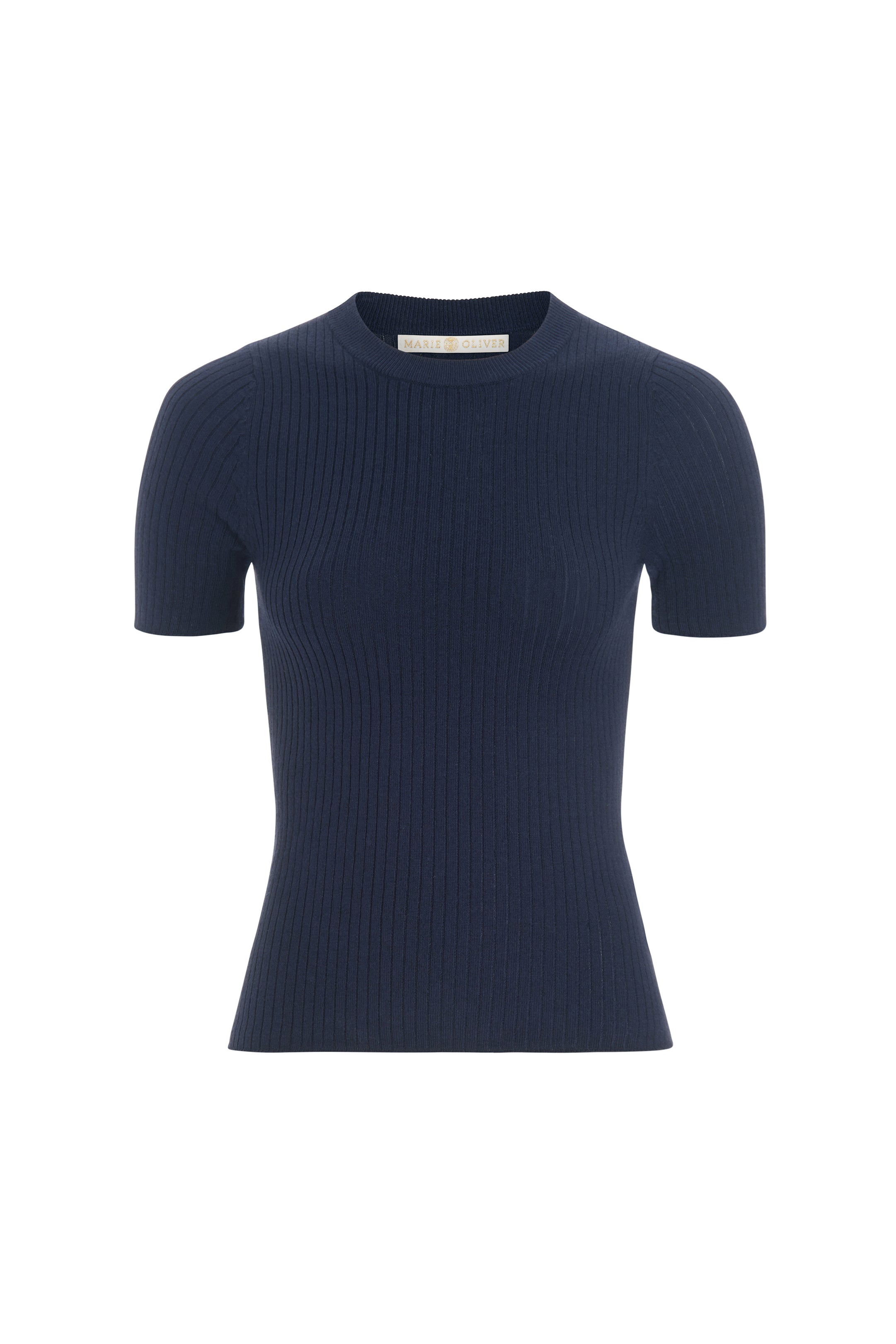 Colorful prints and playful feminine silhouettes are classic Marie Oliver, but we’re nearly as passionate about elevated basics and the balance they bring to your wardrobe. For proof, look no further than our new Kayla top, a fitted crewneck tee cut from a soft ribbed knit, pictured here in Navy. Wear Kayla tucked into a structured bottom like Marie Oliver’s Emmitt short or over the matching Kaylan skirt for a chic knit set.