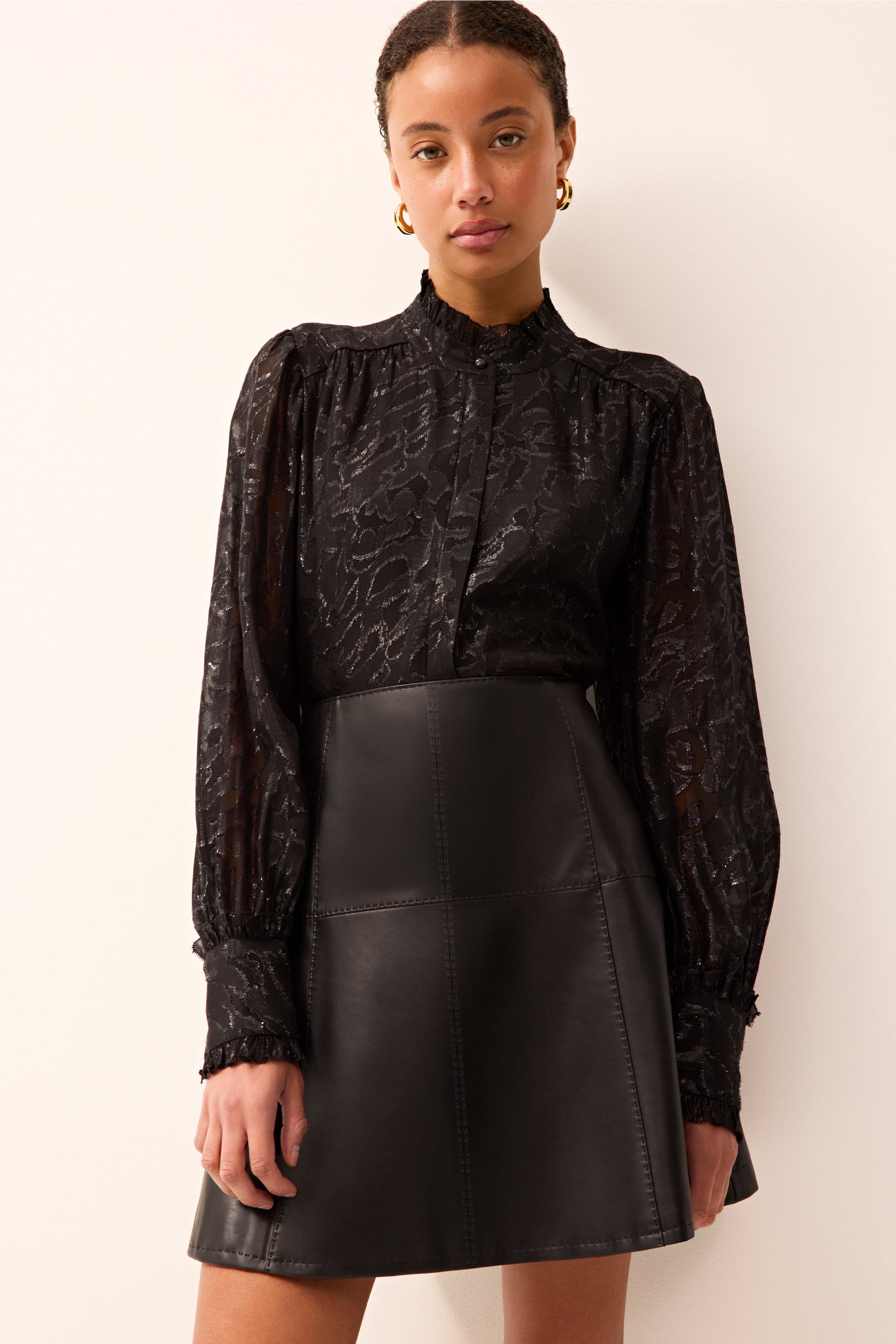 Your silk armor against the urban (or suburban) jungle, our classic black Montana blouse takes on an ethereal effect courtesy of the metallic clipped-silk fabric. A button-down staple with feminine details like ruffles at the collar and cuffs, Montana is an ideal sartorial counterpoint to our edgier Crawford mini skirt in supple vegan leather.