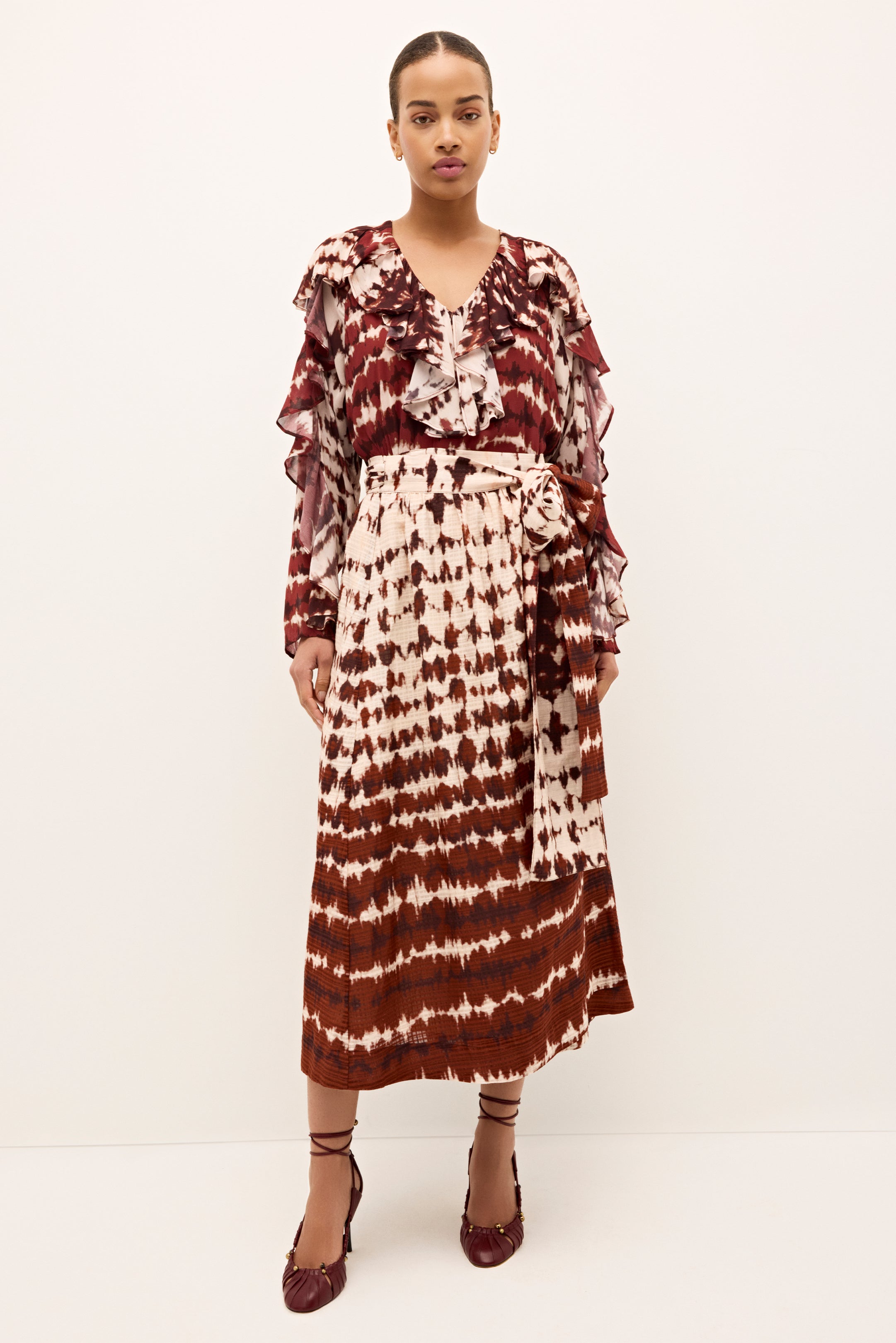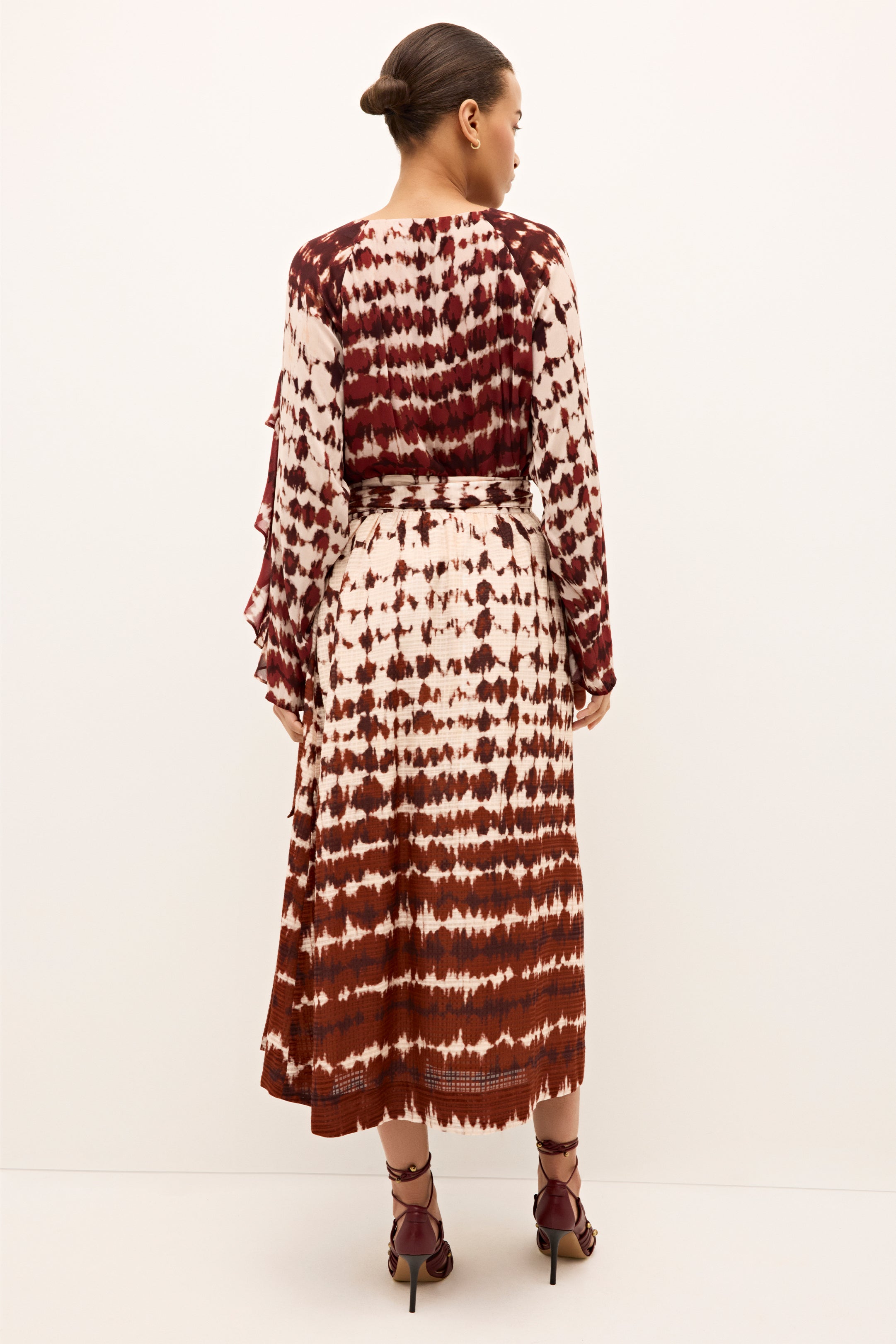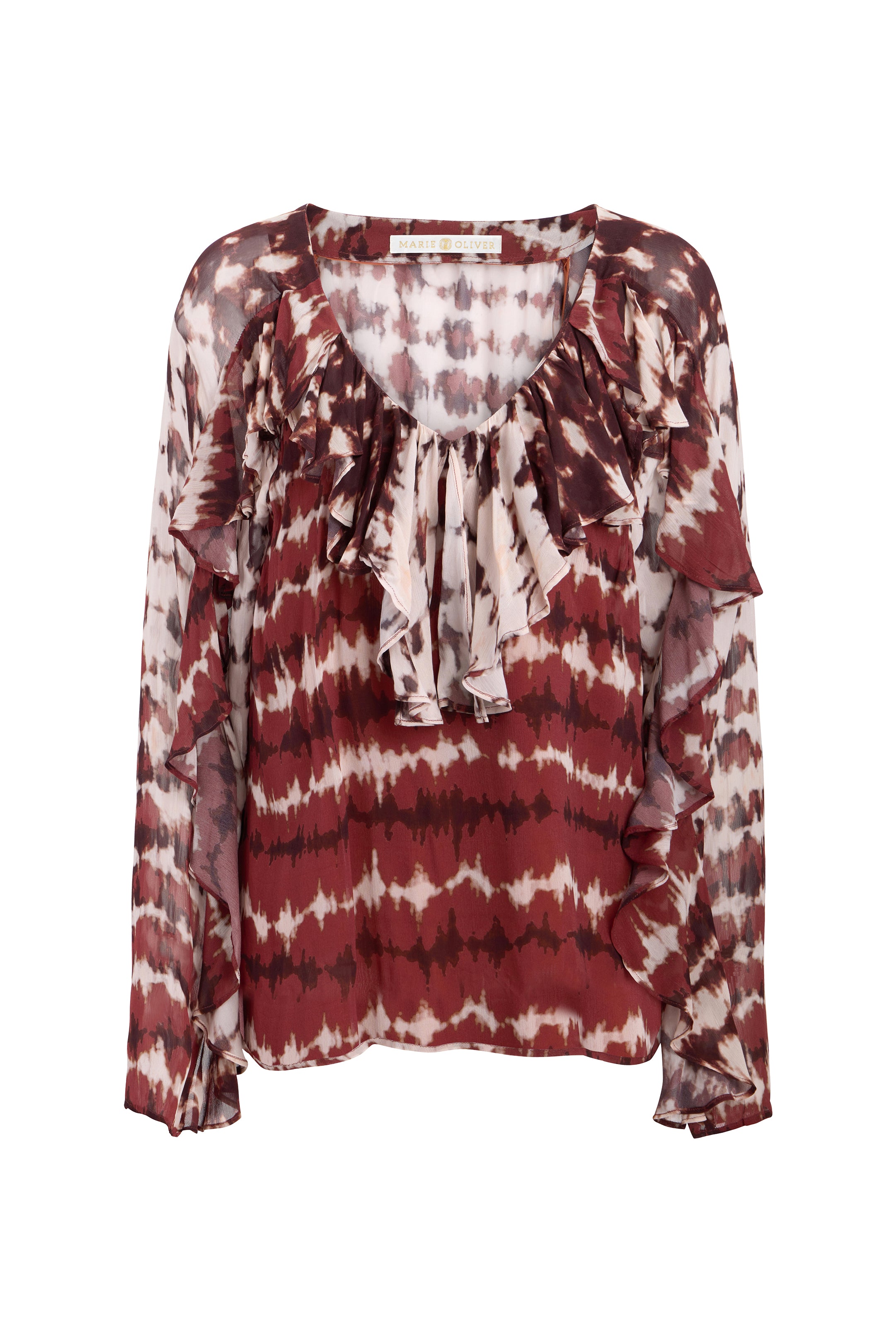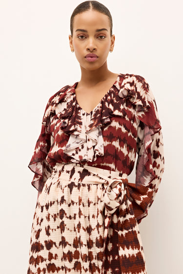 Ease into the bohemian glam of the Trudy blouse with cascading ruffles and a breezy, slip on silhouette. The matching top to the Estine wrap skirt in Catalonia, we love pairing the two for a wine country excursion or an after-hours executive power look. Sheer sleeves add to the romanticism, along with its allover crinkle chiffon construction that offers texture (and just a bit of attitude).