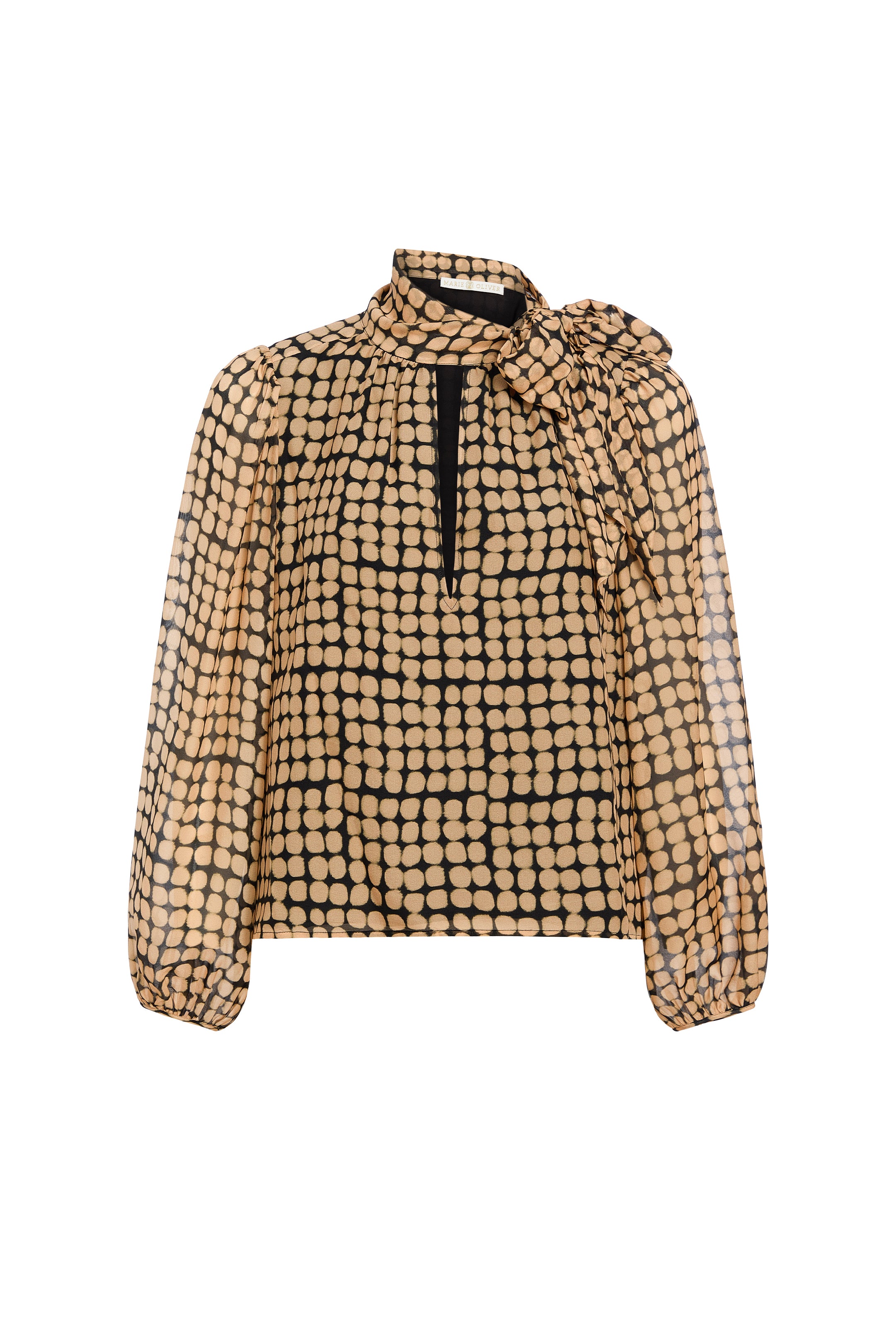 A modern take on the classic pussy-bow blouse, Vivianne stands out with a plunging keyhole neckline and the subtle metallic sheen of airy silk chiffon. Its black-and-gold dot motif evokes raindrops glistening in the evening light, or the soft glow of twinkle lights through a window on a winter night. For a head-to-toe effect, style with the matching Krista skirt.