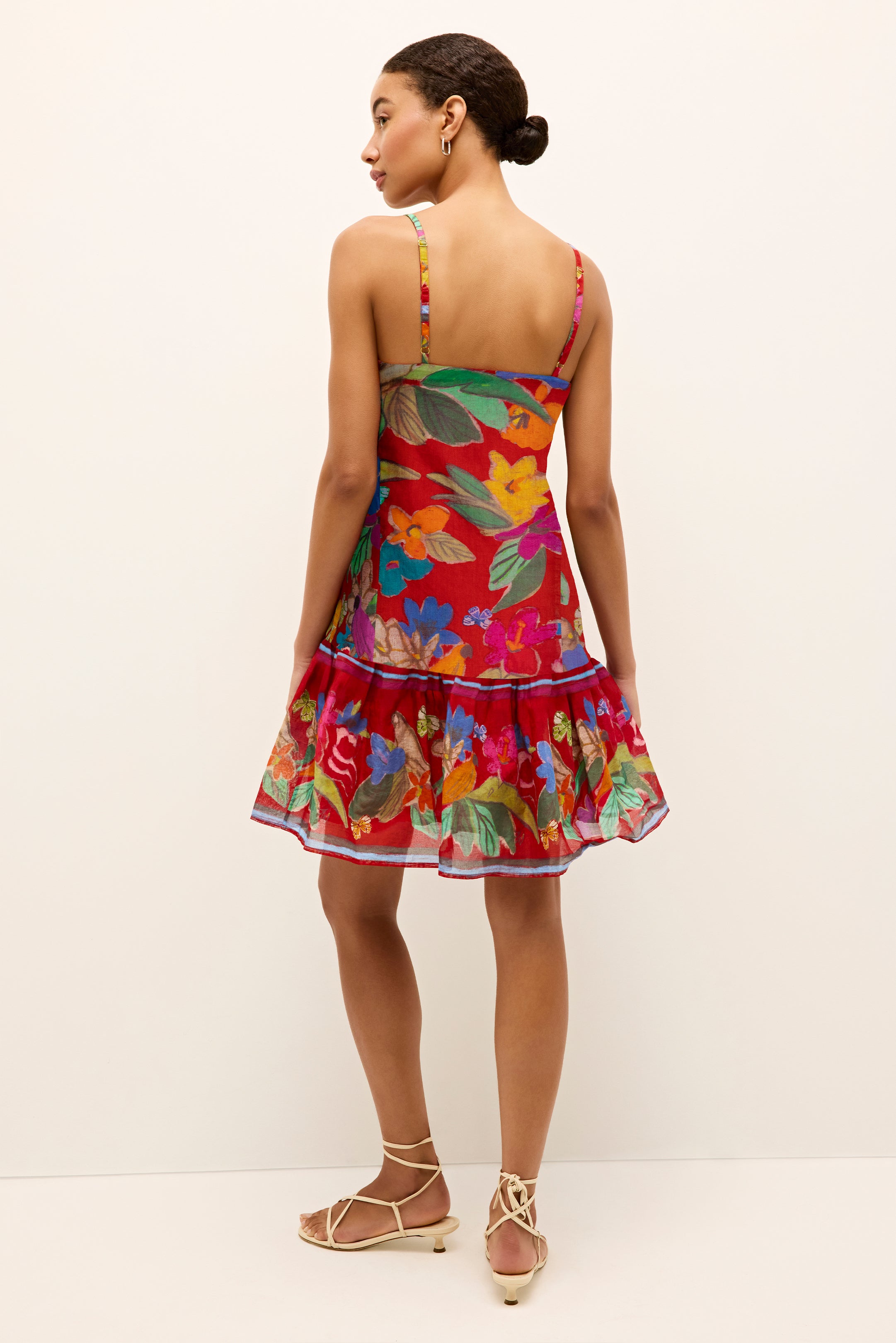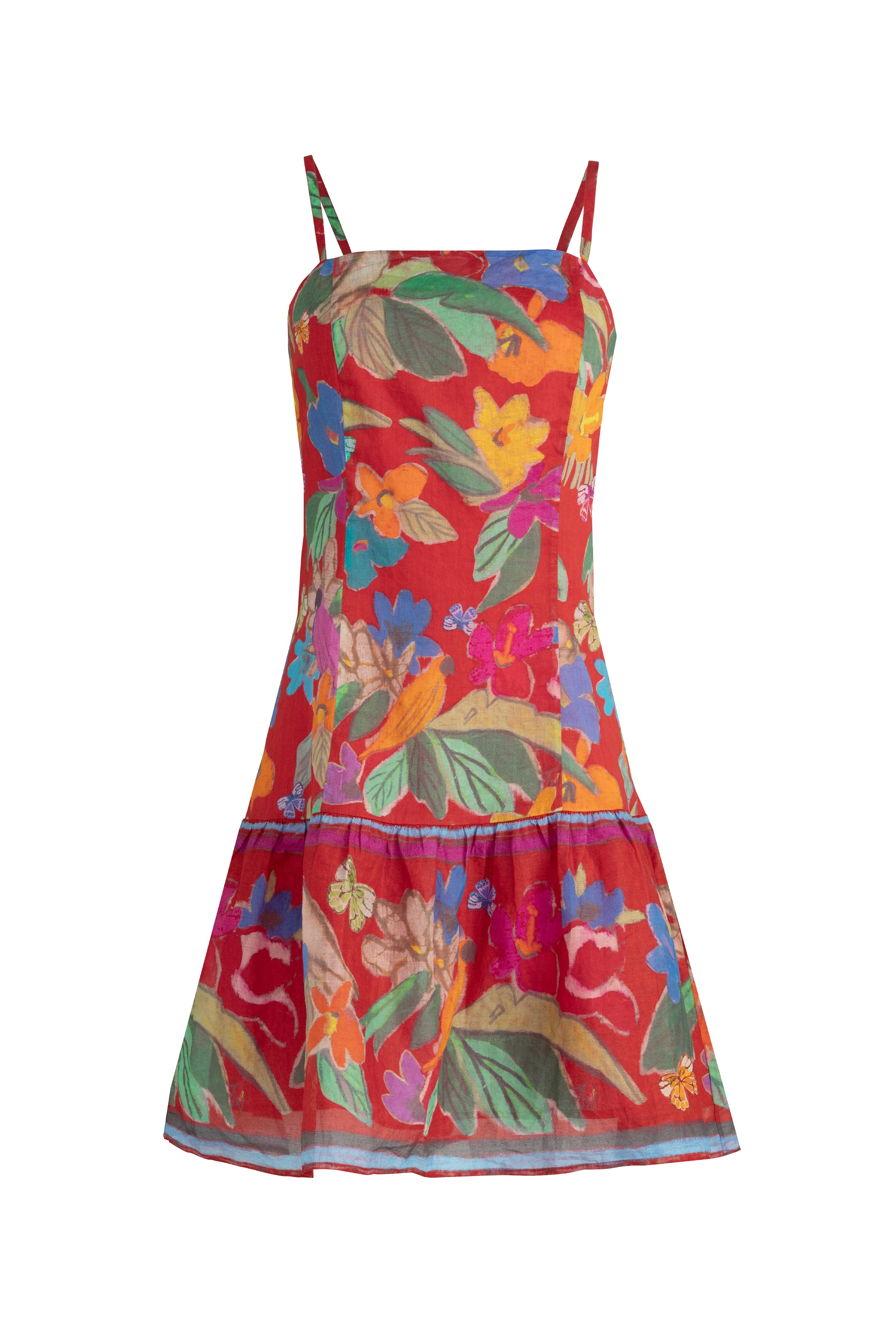 Our new Anita dress is pictured here in Macaw, a bright avian-inspired jungle print with a bold red ground and a sun-aged finish. The playful sundress features pretty princess seams, adjustable spaghetti straps, and a flirty kicked out hem, checking all of high-summer’s sartorial boxes.