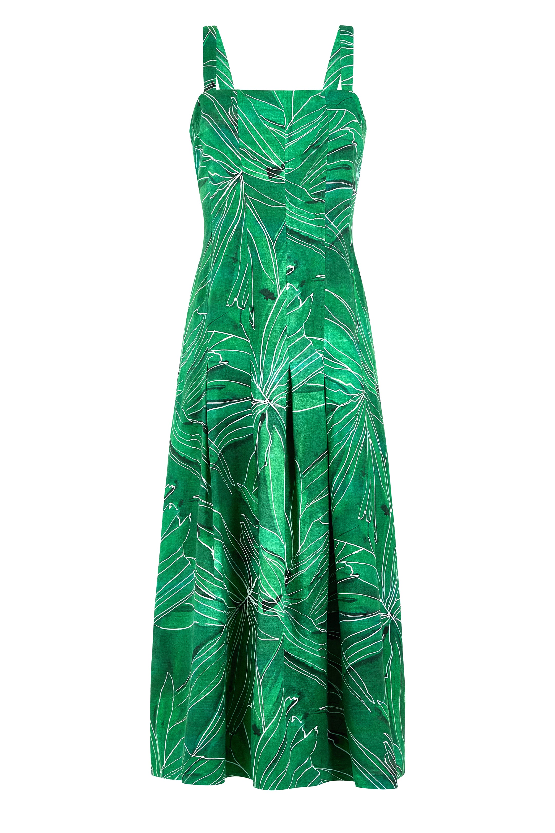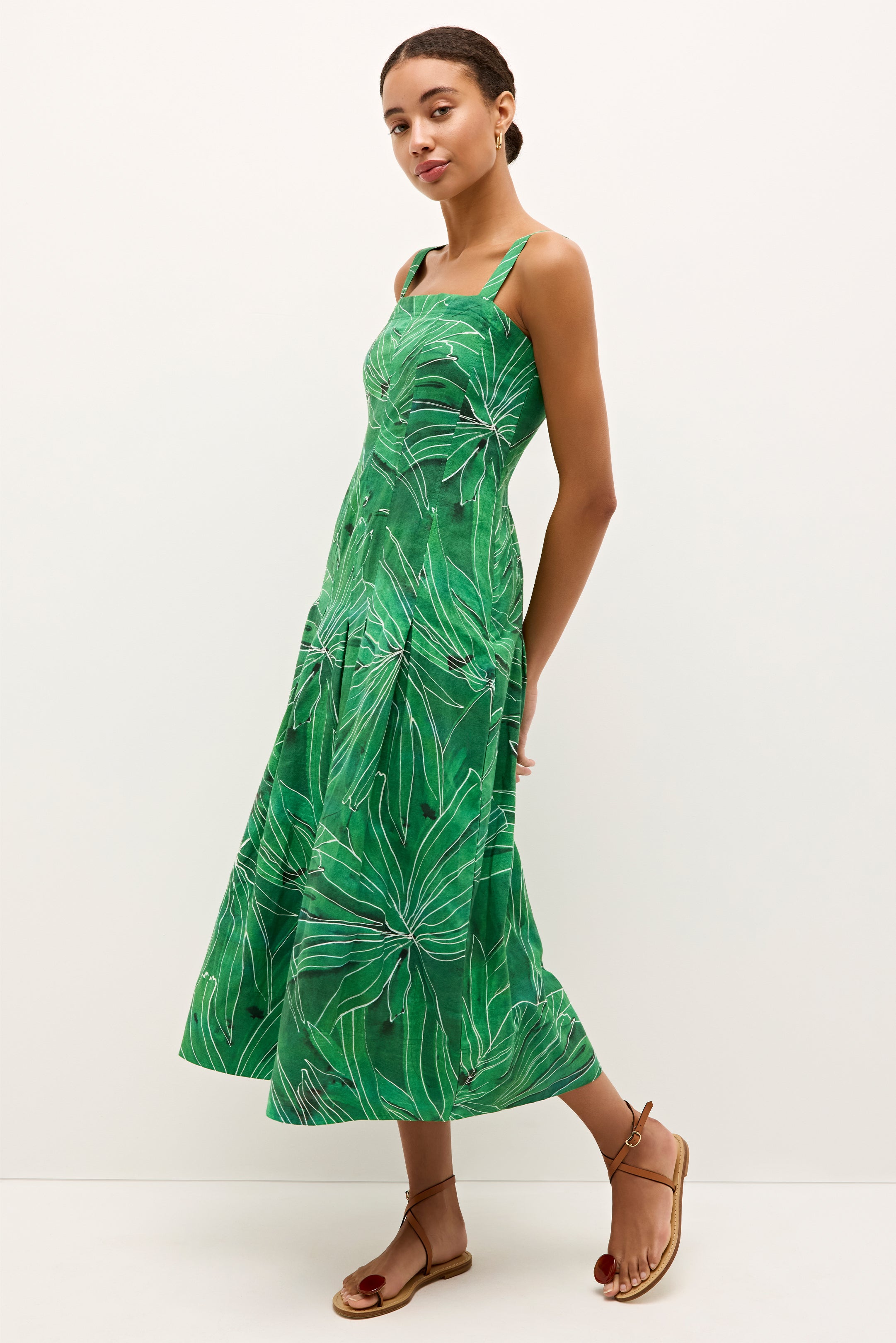 A design team favorite, Dixon is a true sundress—the kind of feminine silhouette that just feels good to wear thanks to the flattering drop waist created by stitched down box pleats and the adjustable straps, which allow for a more personalized fit. Try it in this saturated emerald green botanical print for summer.