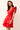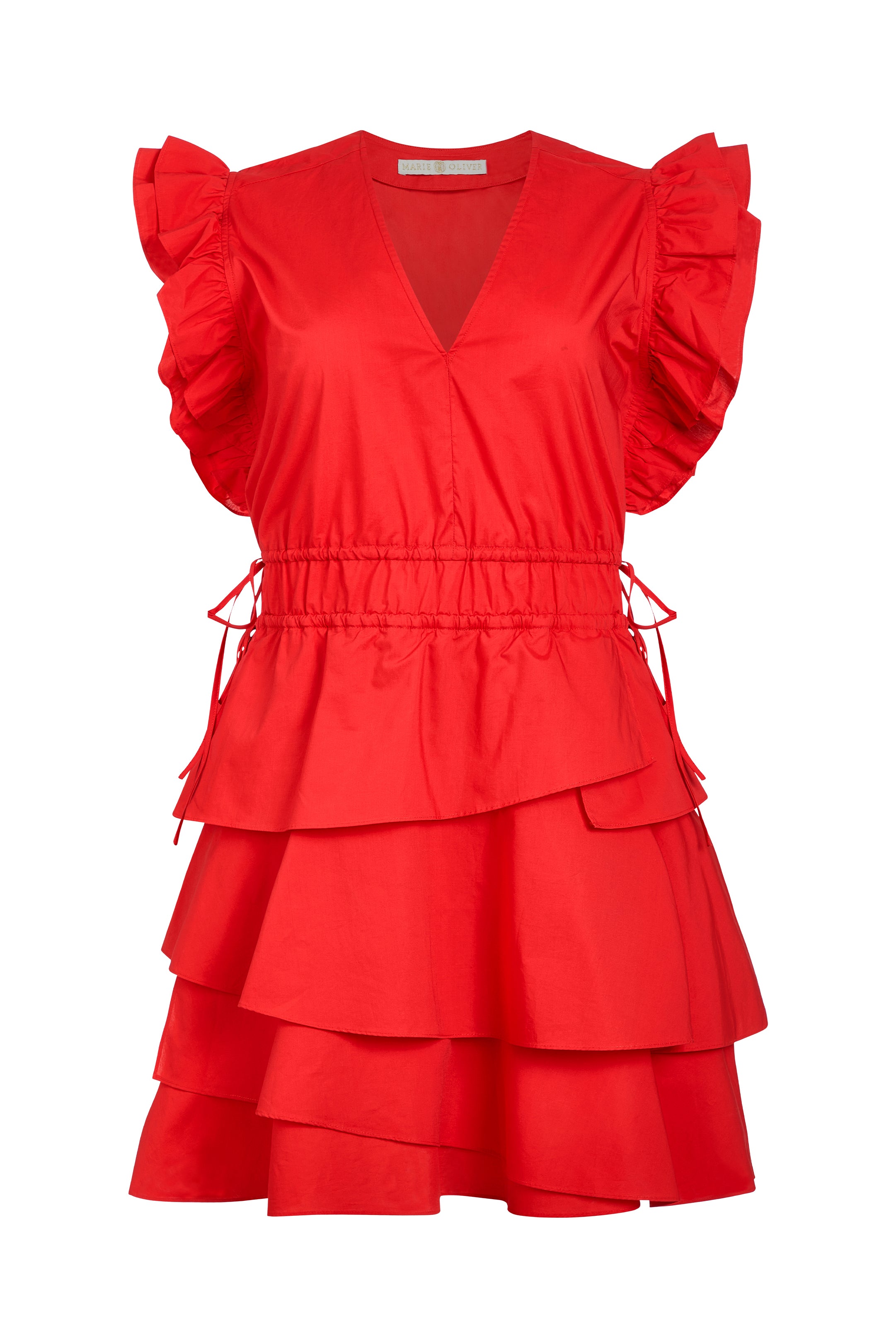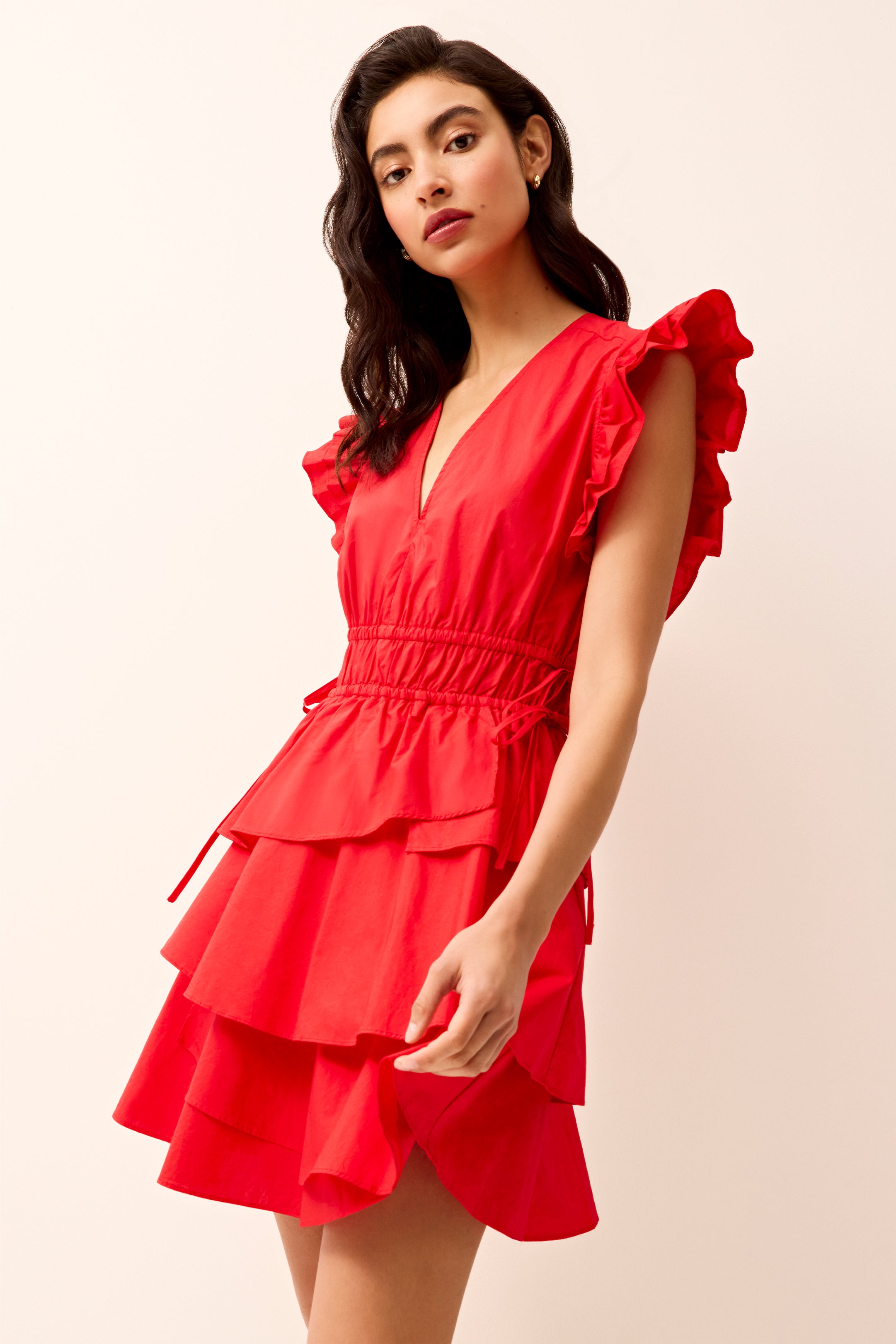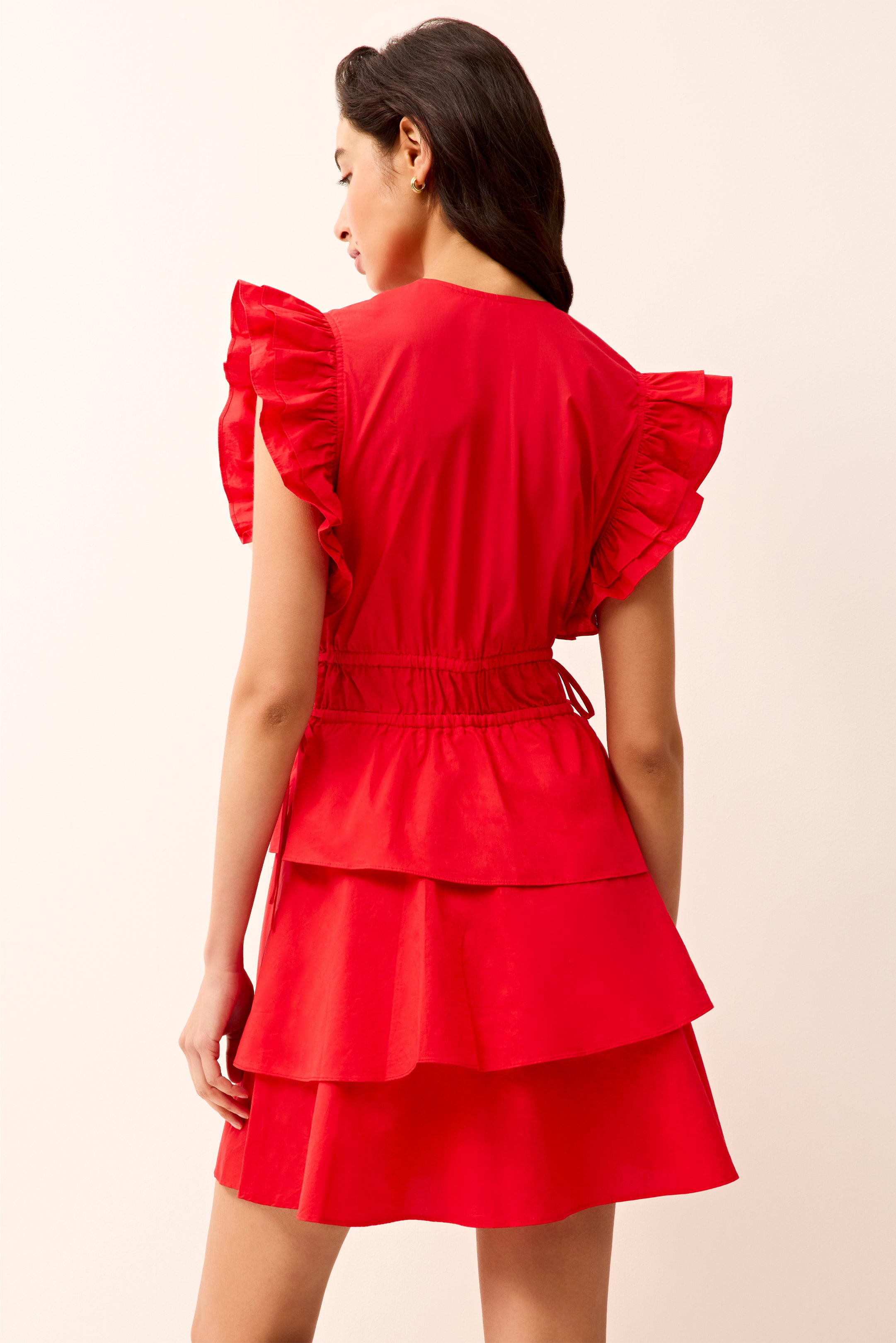 Vibrant and playful, this flirty slip-on silhouette with a drawstring waist, layered flutter sleeves, and an asymmetrical tiered skirt comes in a spicy true red that bridges the gap between summer and fall.