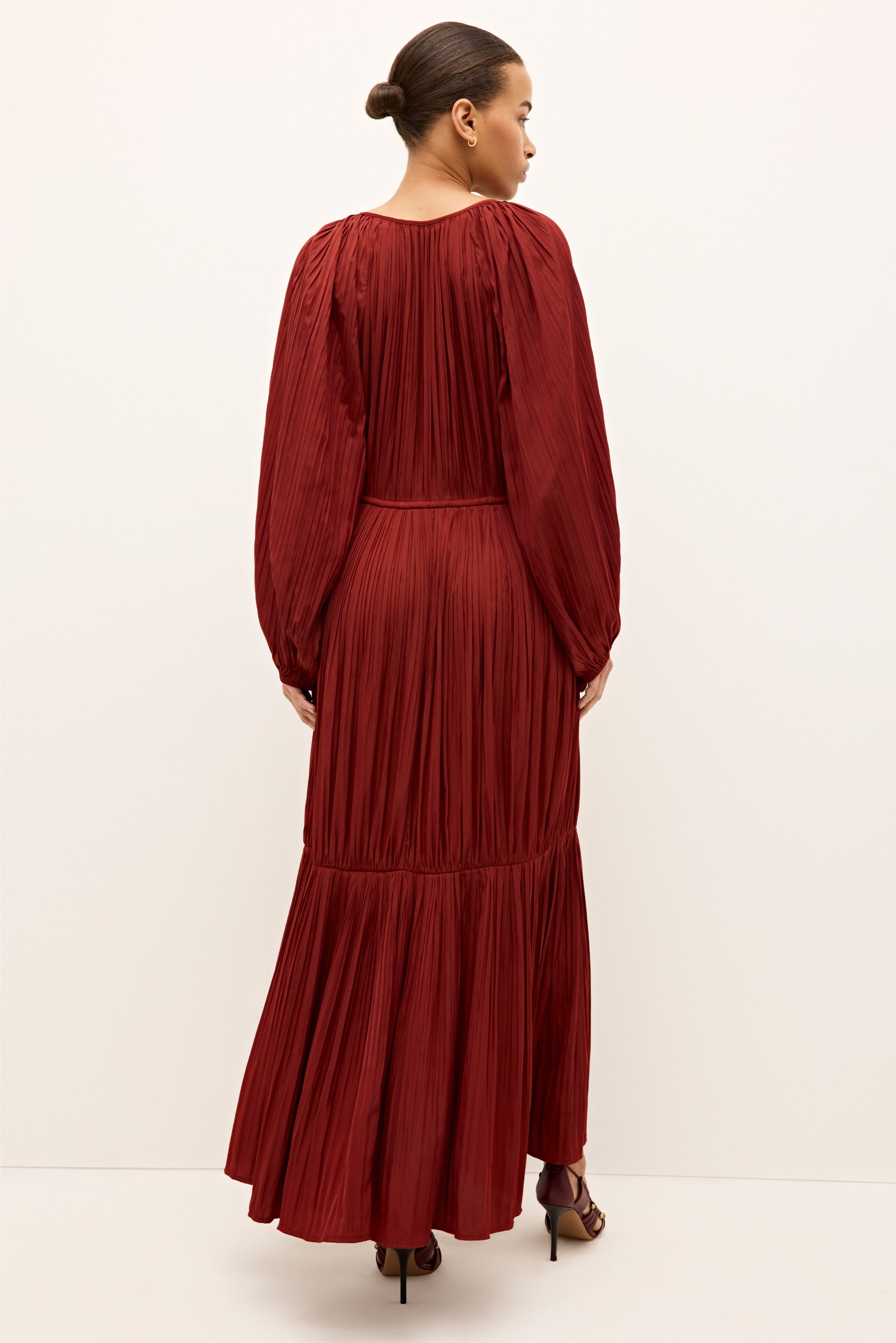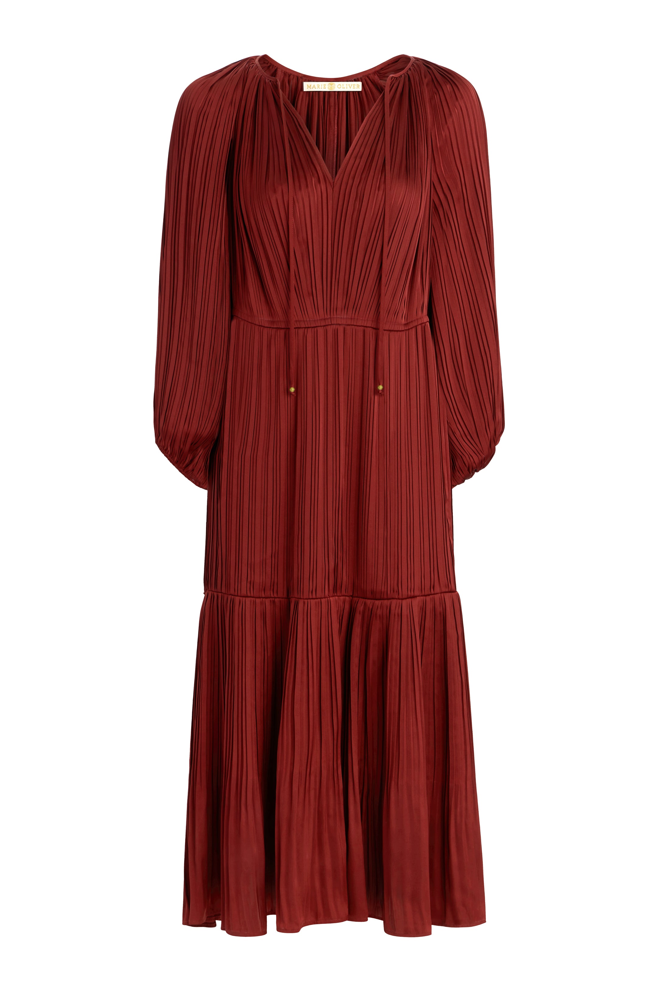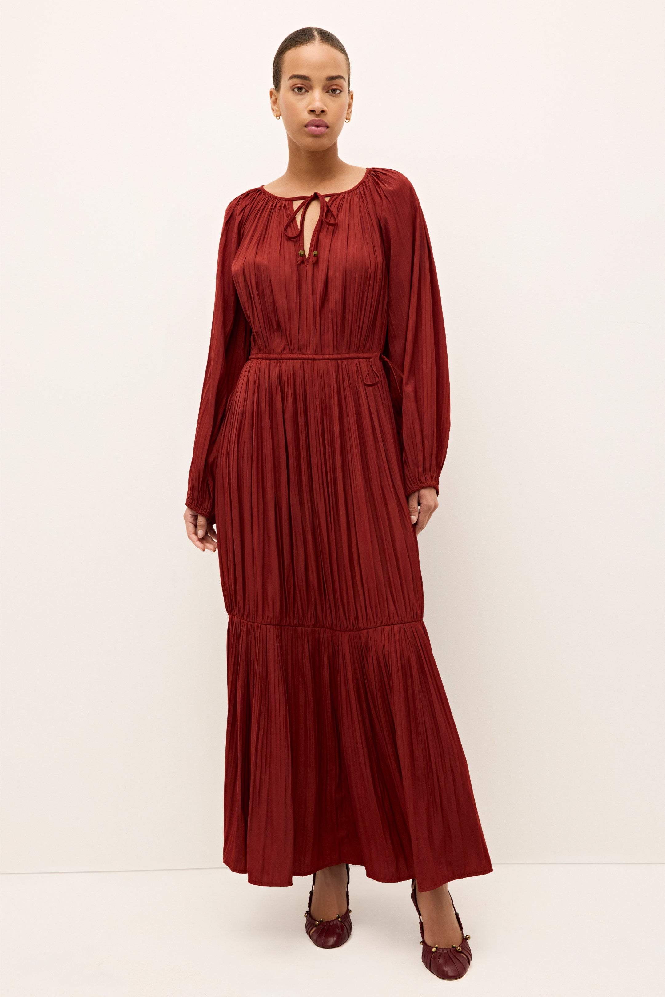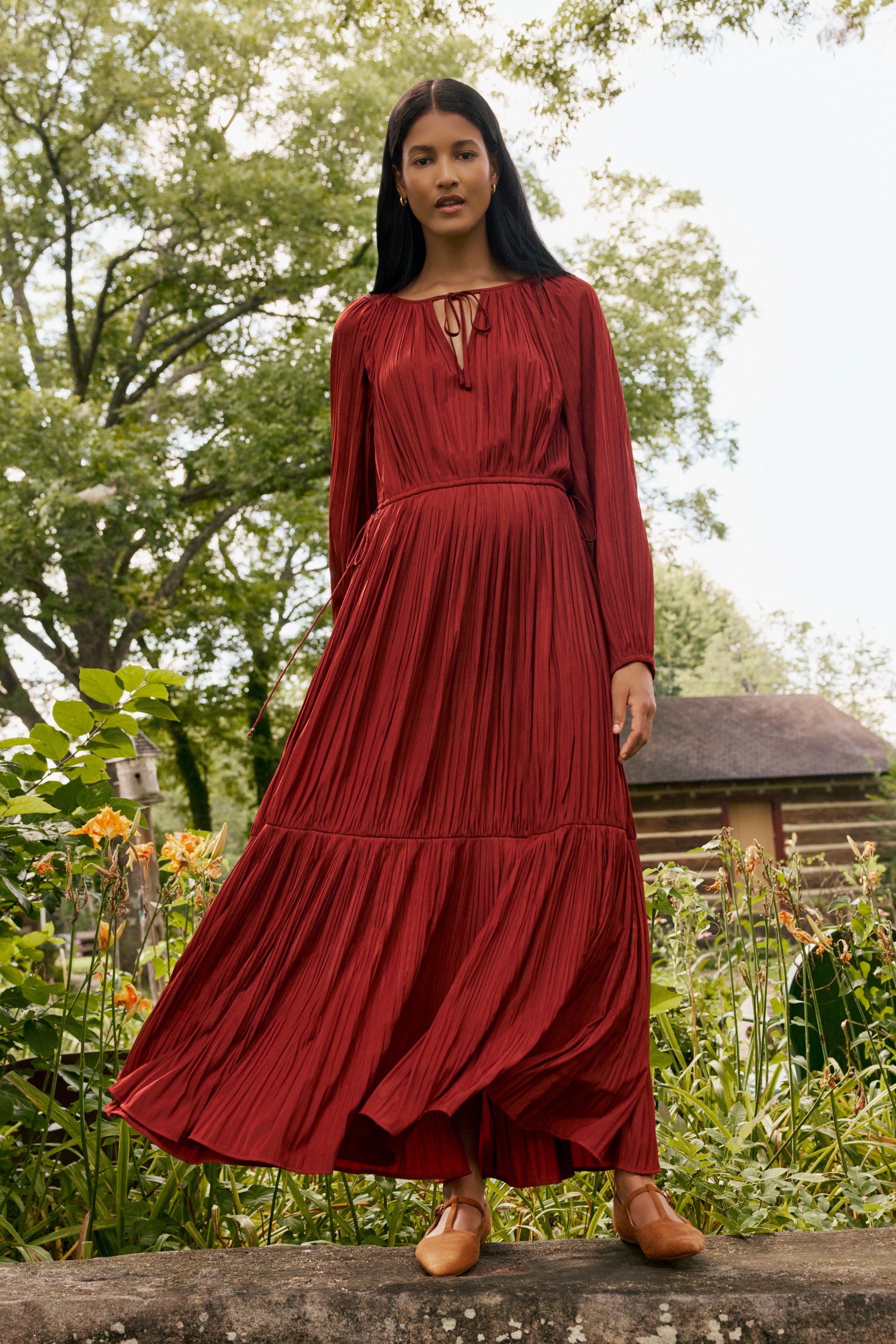 Breeze into lunch dates with the girls or add to the artistic elegance at an event with the sumptuously sophisticated Perrin dress. Pleated and tiered details cascade down its length, while a drawstring waist allows for a more personalized fit. A color-soaked Brick red silhouette adds to the autumnal appeal, and you’ll find yourself slipping into this supersoft and drapey highlight of the season week after week.