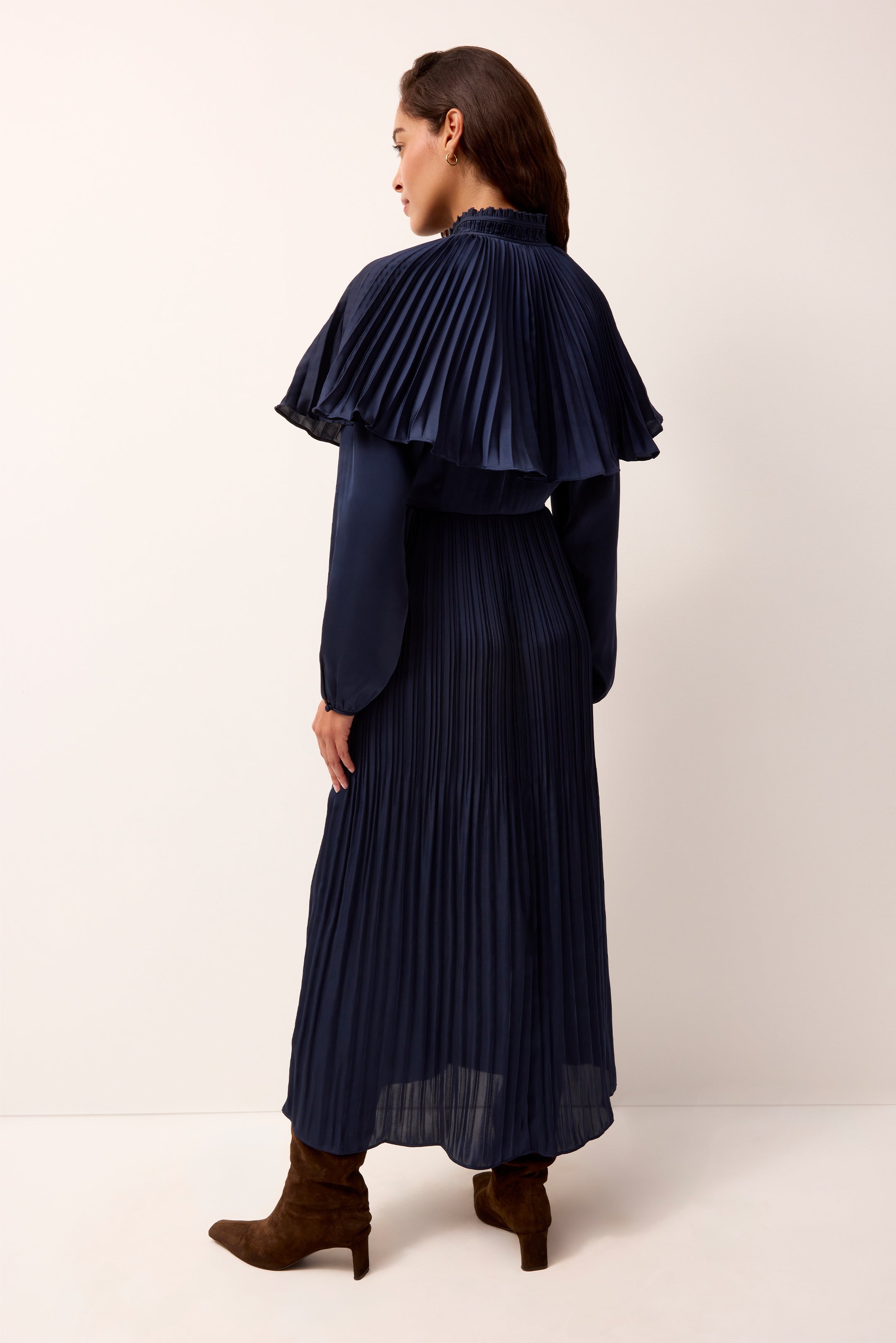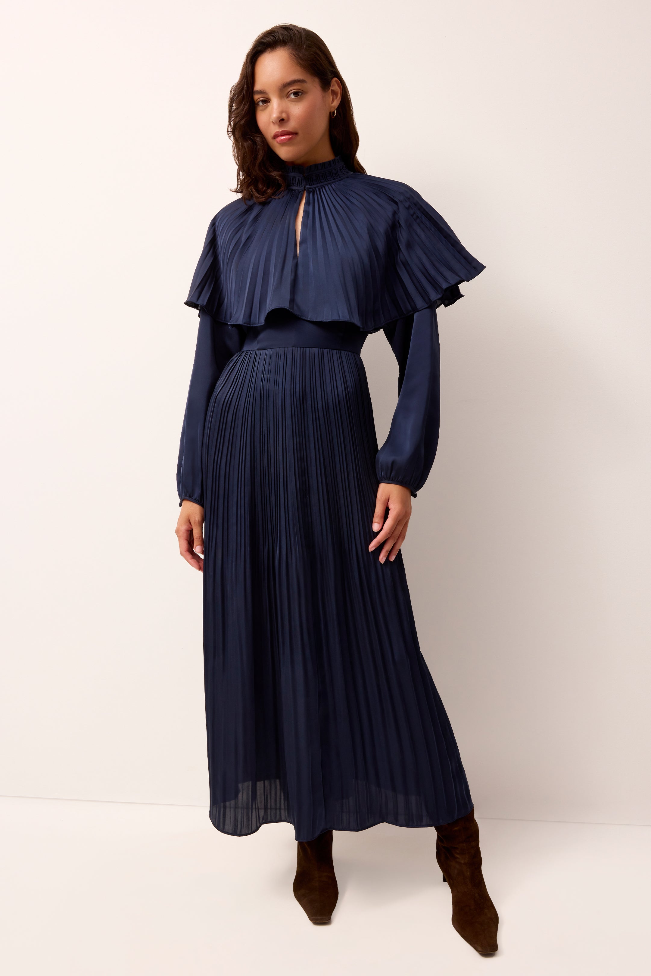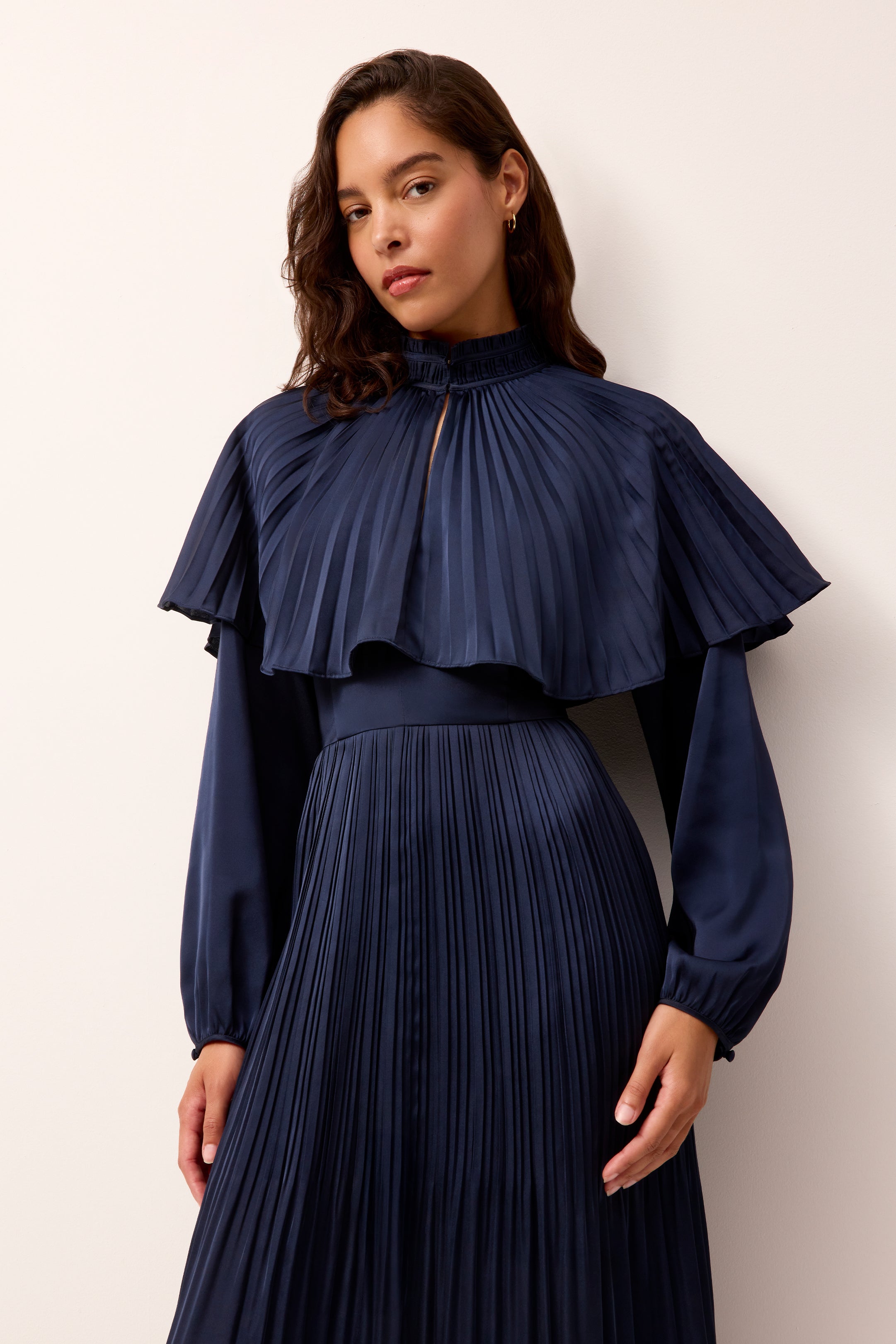 The very portrait of autumnal elegance, our coveted Verity dress will be a focal point of your fall wardrobe. Its pleated cape detail lends a romantic sensibility, while an invisible zipper keeps things sleek and modern. Dramatically designed for the moments that count, photographed memories will be even sweeter in this inspired stunner that will more than stand the test of time.